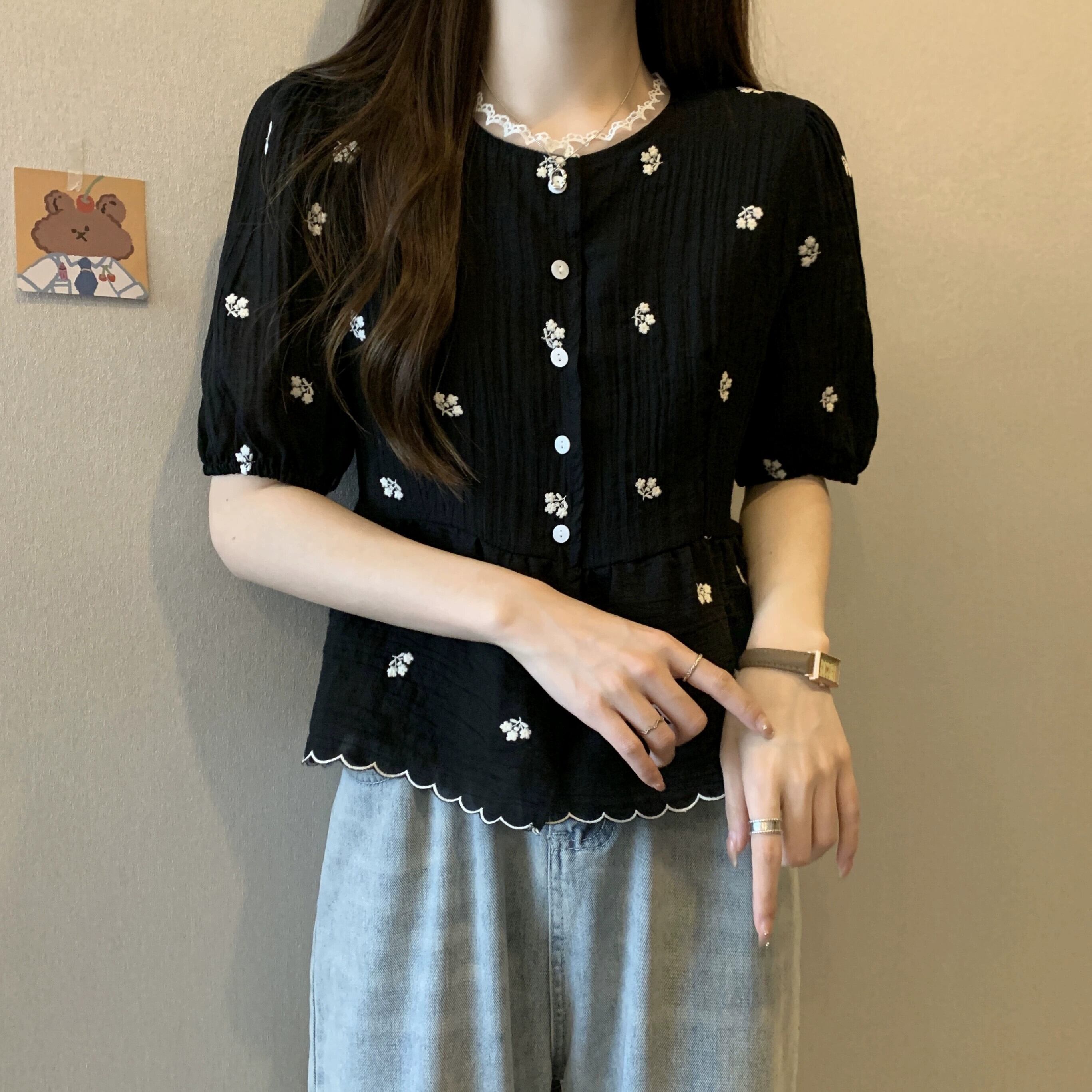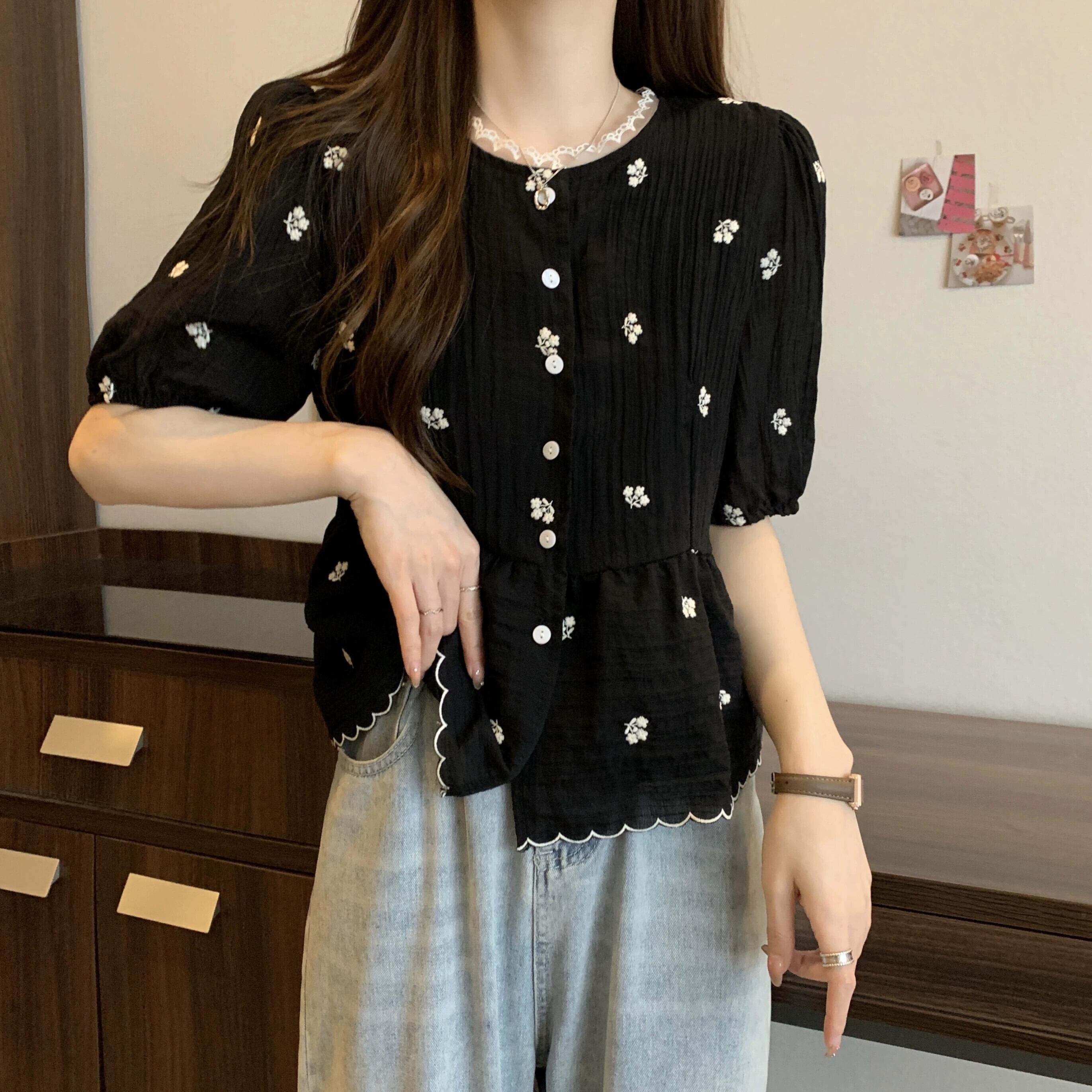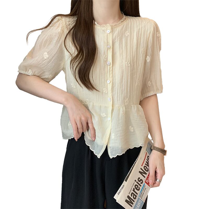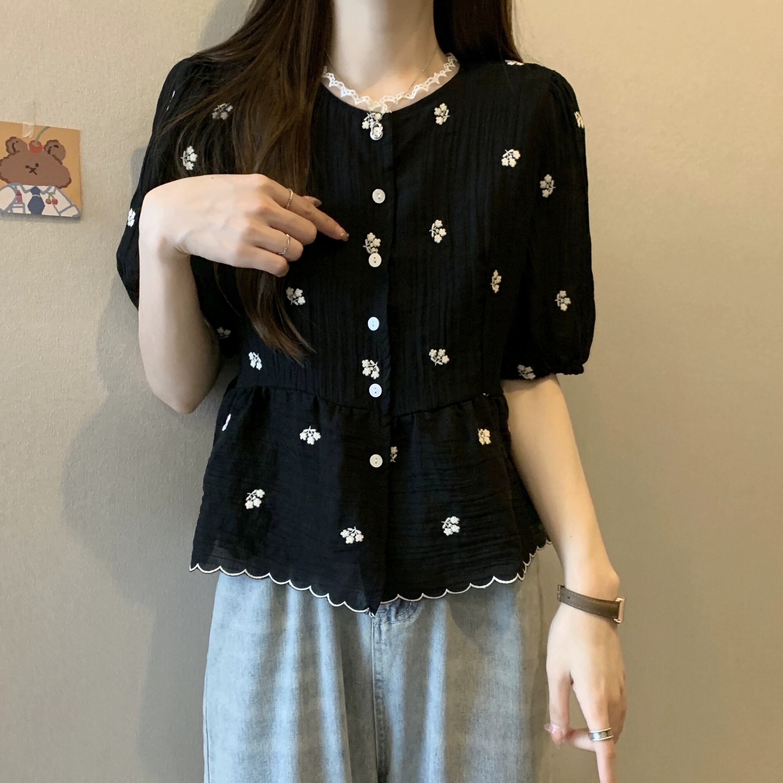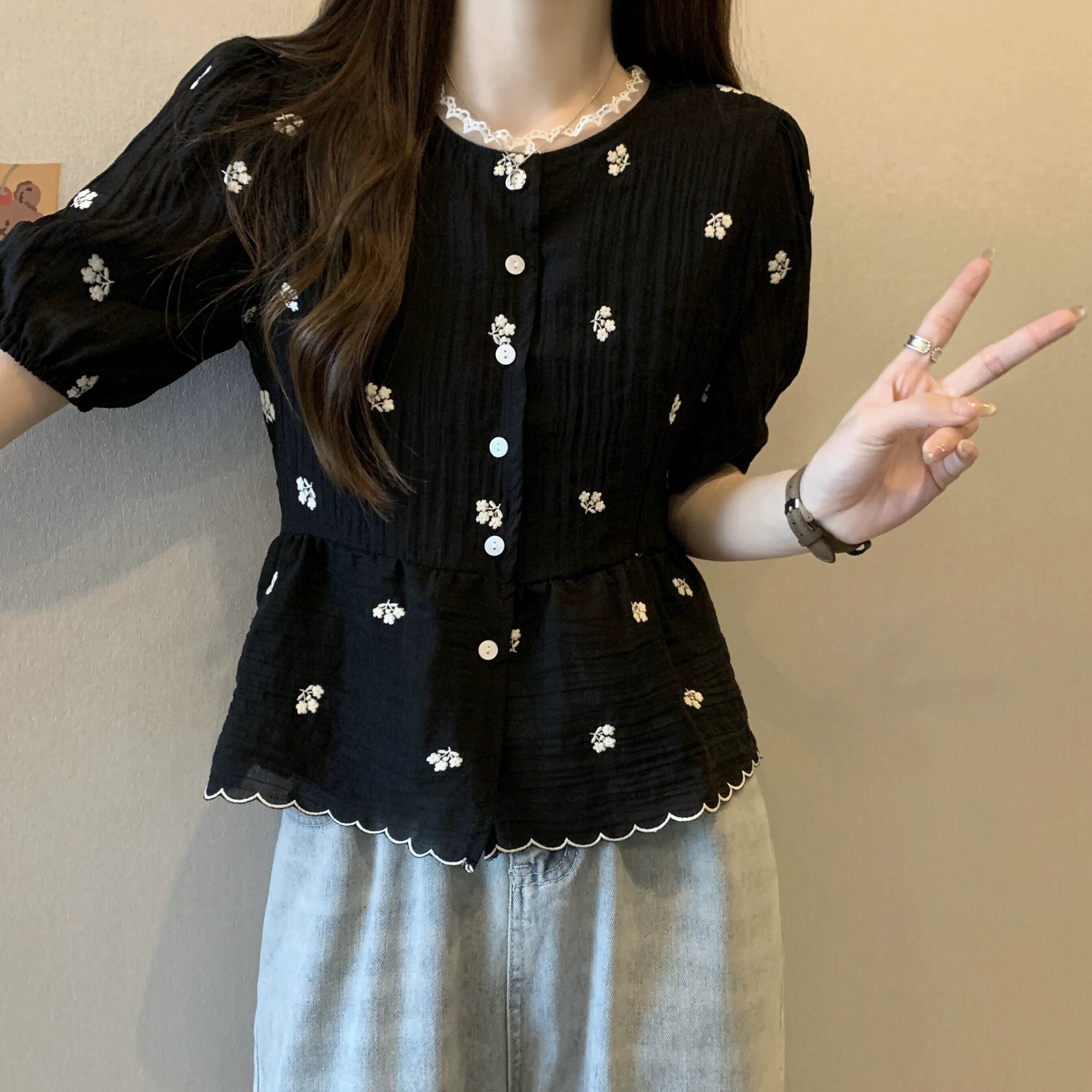プラスサイズの婦人服 2023 脂肪姉妹夏の新ファッションルーズ年齢削減刺繍フリルパフスリーブシャツトップ 大きめサイズ サマー 夏物 8884111976624322