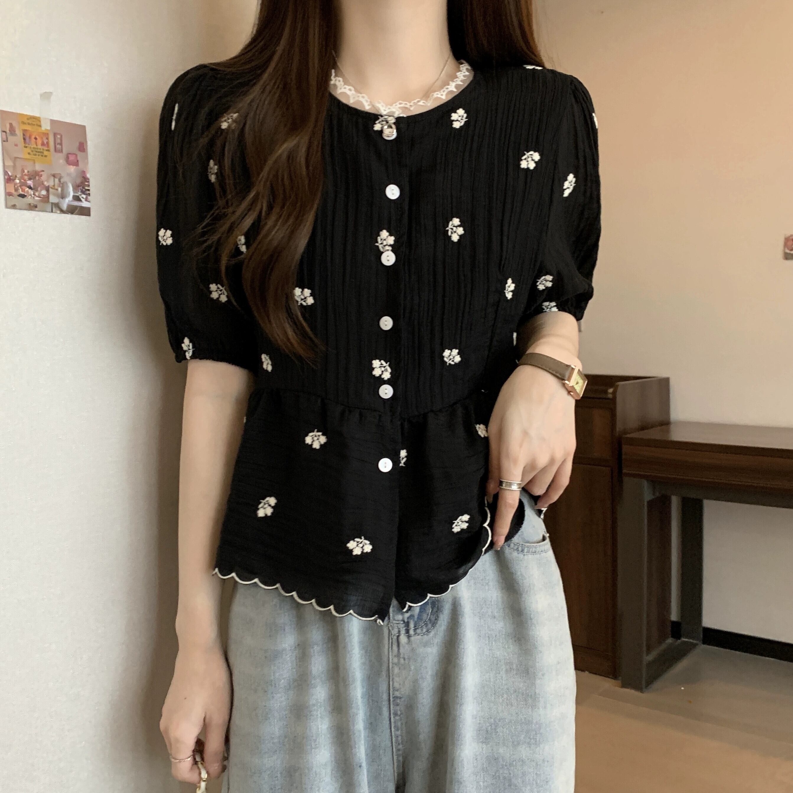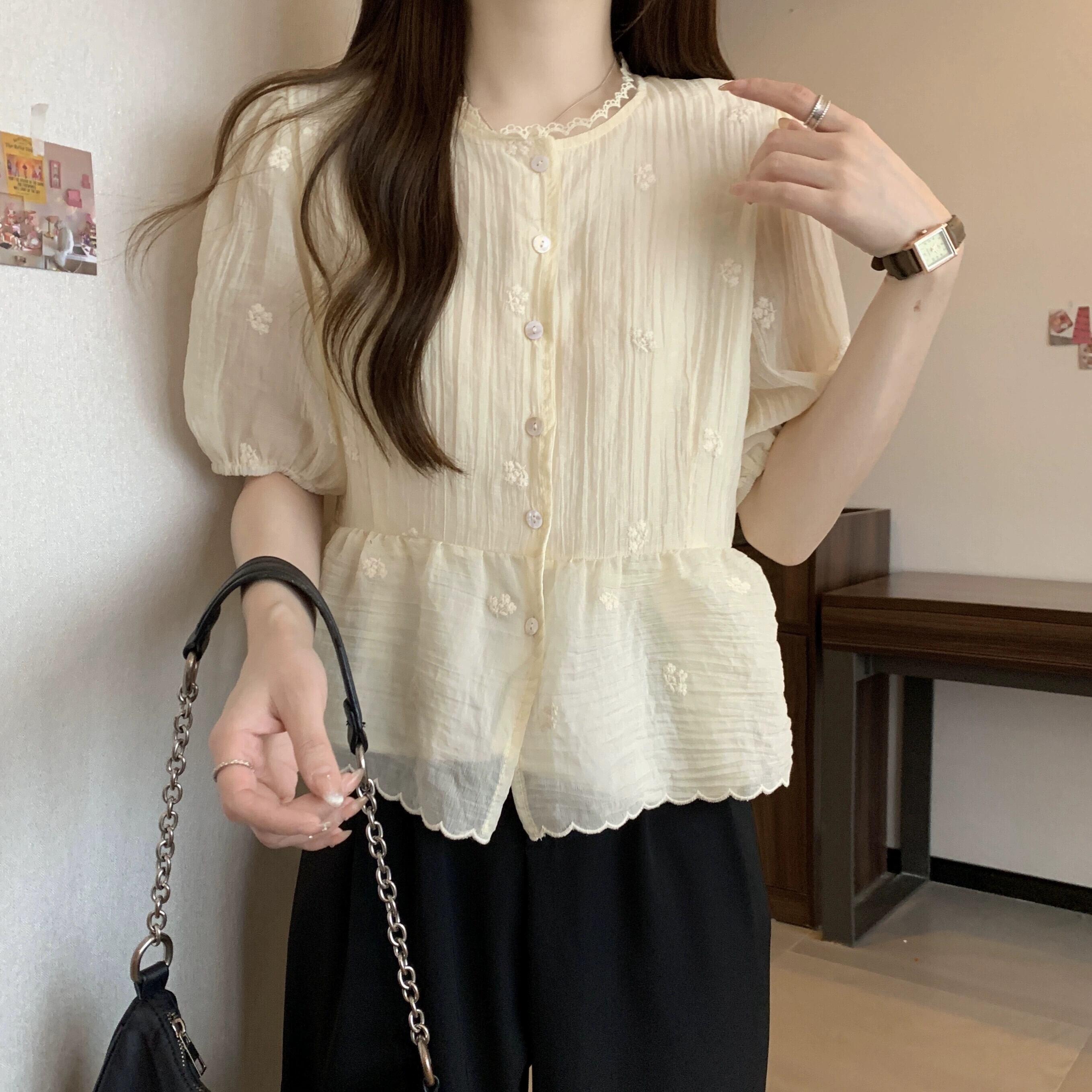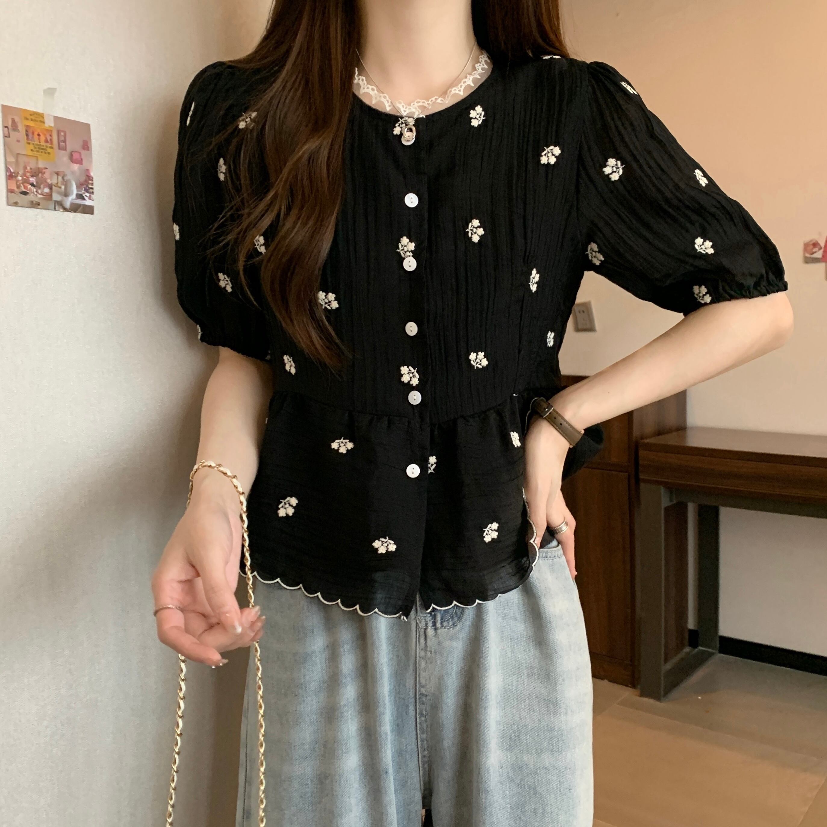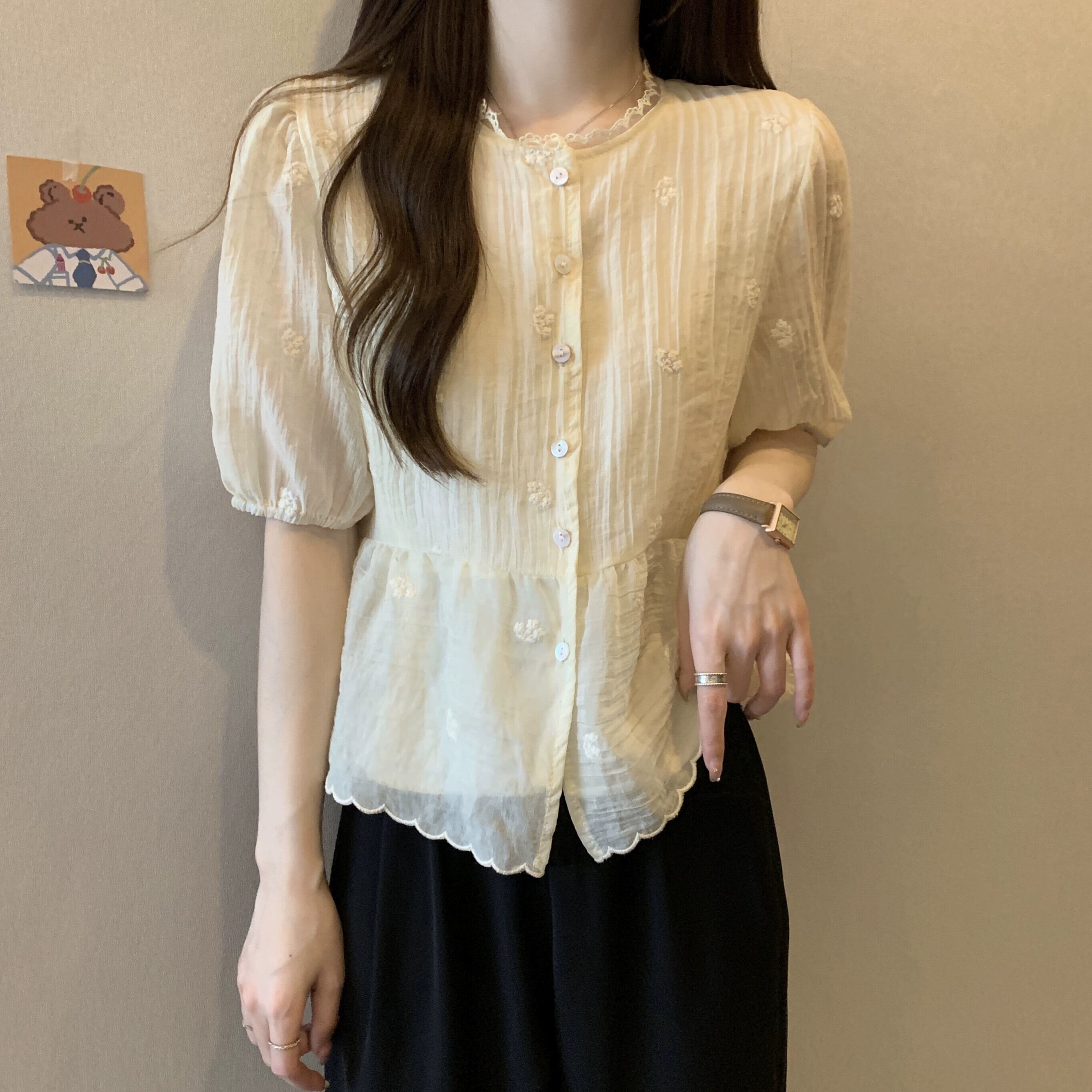 プラスサイズの婦人服 2023 脂肪姉妹夏の新ファッションルーズ年齢削減刺繍フリルパフスリーブシャツトップ 大きめサイズ サマー 夏物 8884111976624322