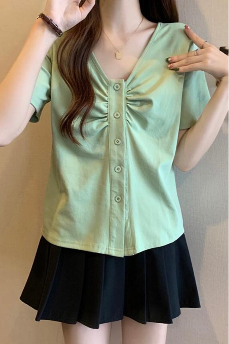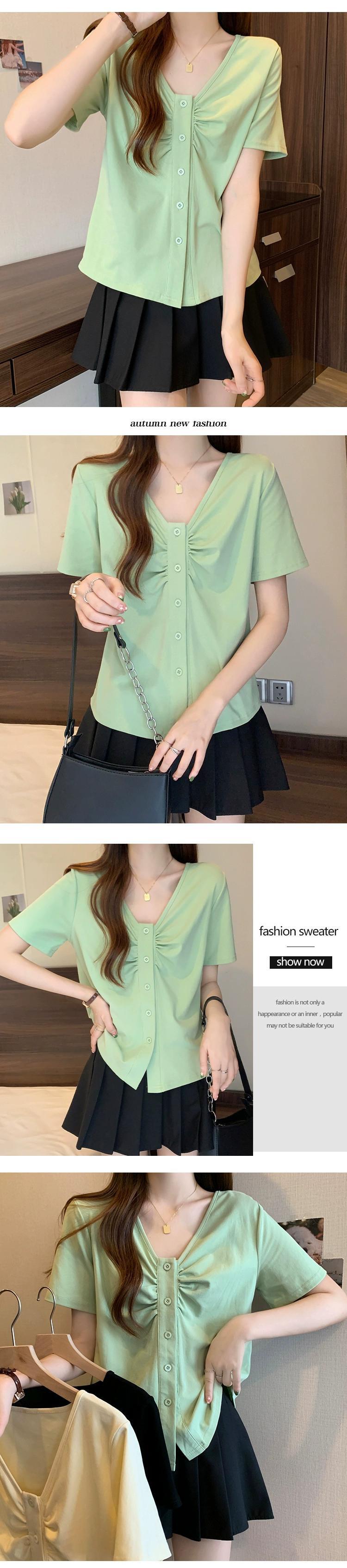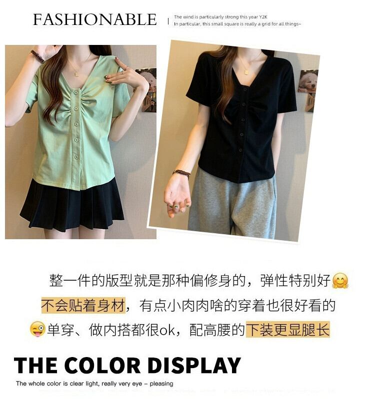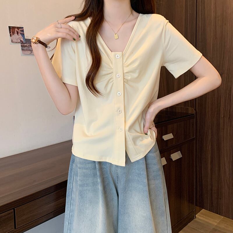 プラスサイズの婦人服 2023 ファットシスター夏の新しいファッションデザインセンスニッチ V ネックプリーツ Tシャツスリム半袖トップ 大きめサイズ サマー 夏物 Vネック 8884160245833254