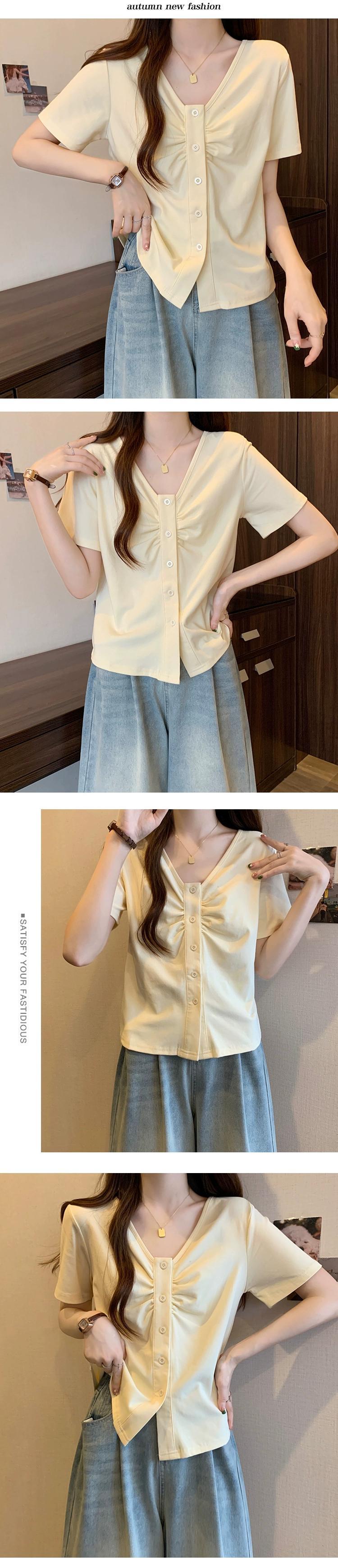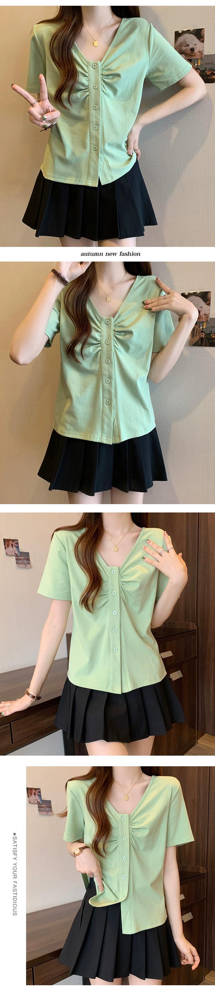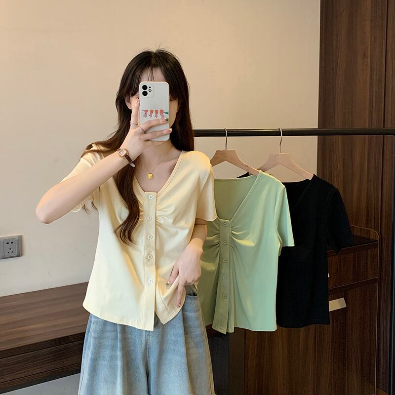 プラスサイズの婦人服 2023 ファットシスター夏の新しいファッションデザインセンスニッチ V ネックプリーツ Tシャツスリム半袖トップ 大きめサイズ サマー 夏物 Vネック 8884160245833254