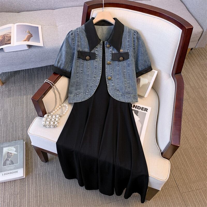 プラスサイズの女性服 2023 夏ドレスファットシスターデニムトップシックなノースリーブドレス 2 点セット 大きめサイズ サマー 夏物 8884114941805888