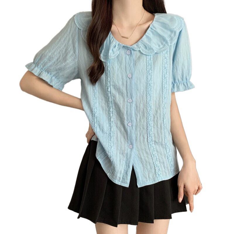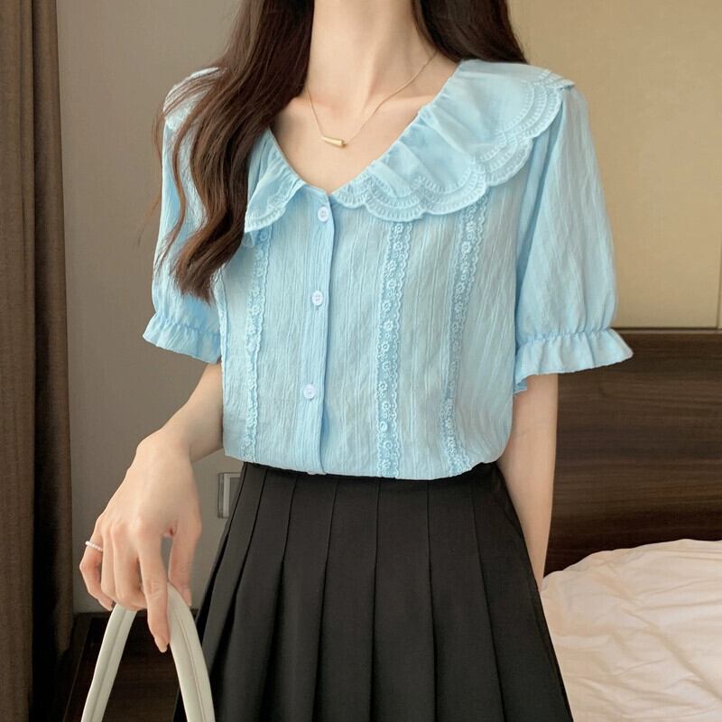 プラスサイズの婦人服 2023 夏服脂肪姉妹人形襟レース半袖シャツ気質シックなシフォンシャツ腹をカバー 大きめサイズ サマー 夏物 8884148134844166
