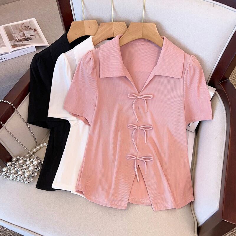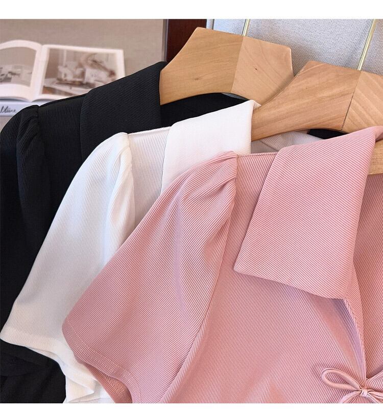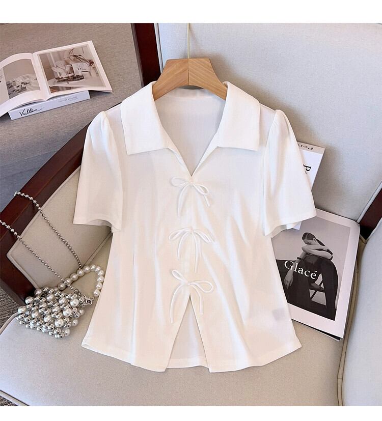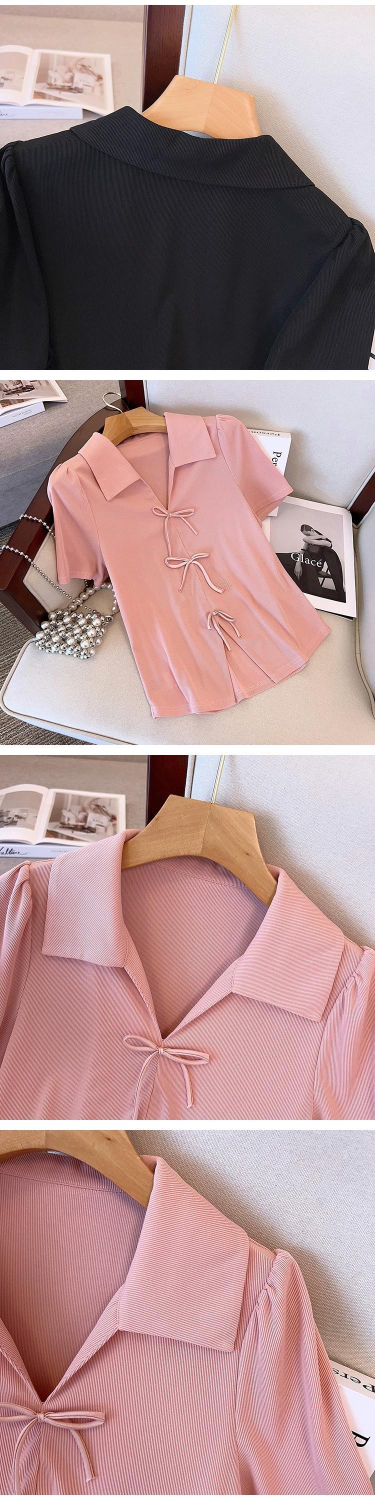 プラスサイズの婦人服 2023 流行の夏の新しいファットシスターリボンハイエンドセンス Tシャツラペル新中国風半袖トップ 大きめサイズ サマー 夏物 8884168412481788