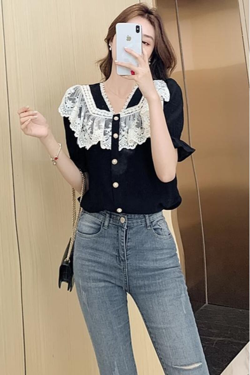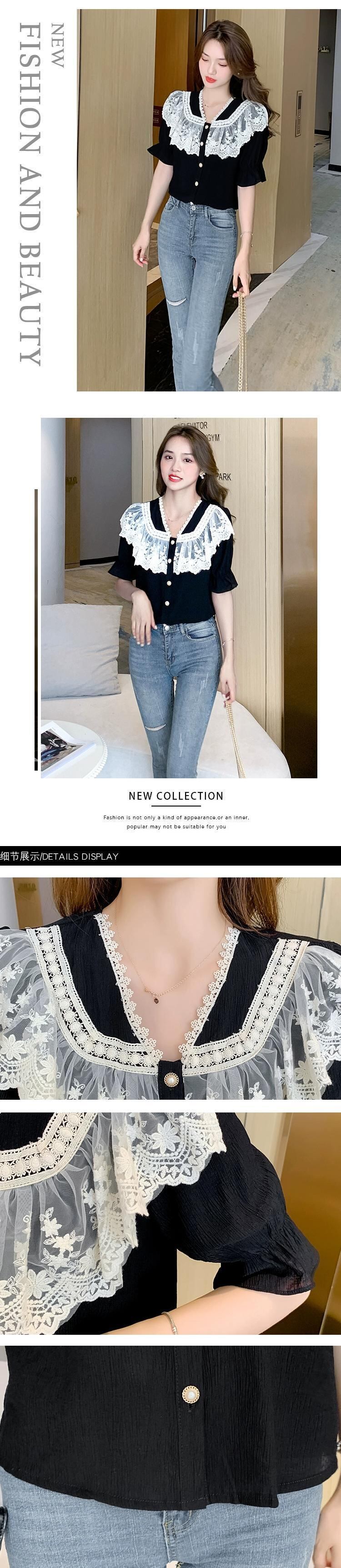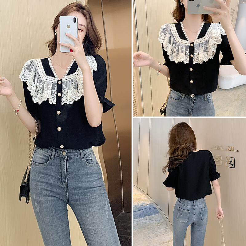プラスサイズの婦人服 2023 脂肪姉妹夏の新しいレースフリルスリム気質半袖シャツシフォンシャツトップ ラッフル 大きめサイズ サマー 夏物 8884147278901293