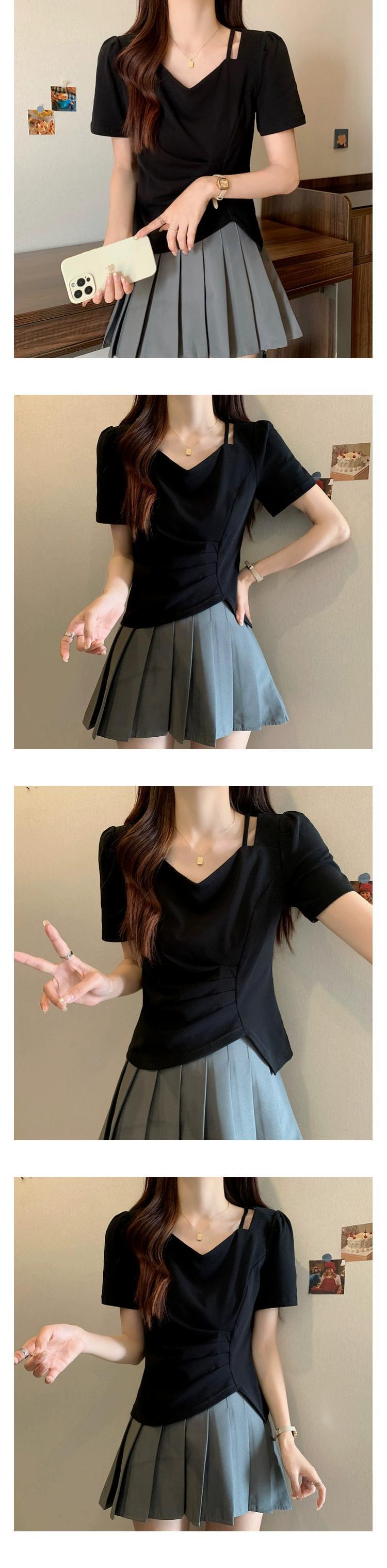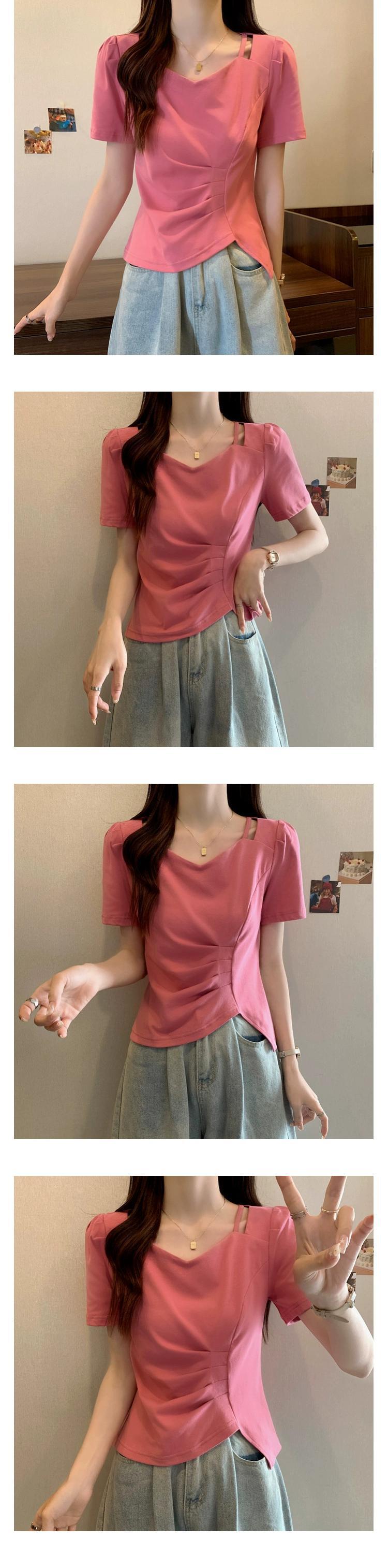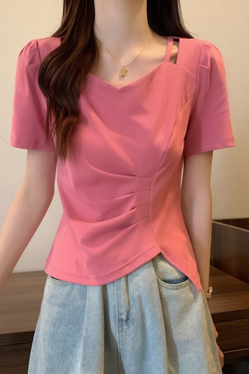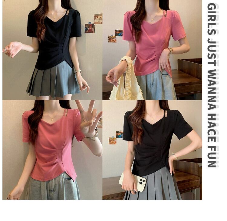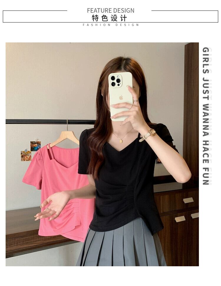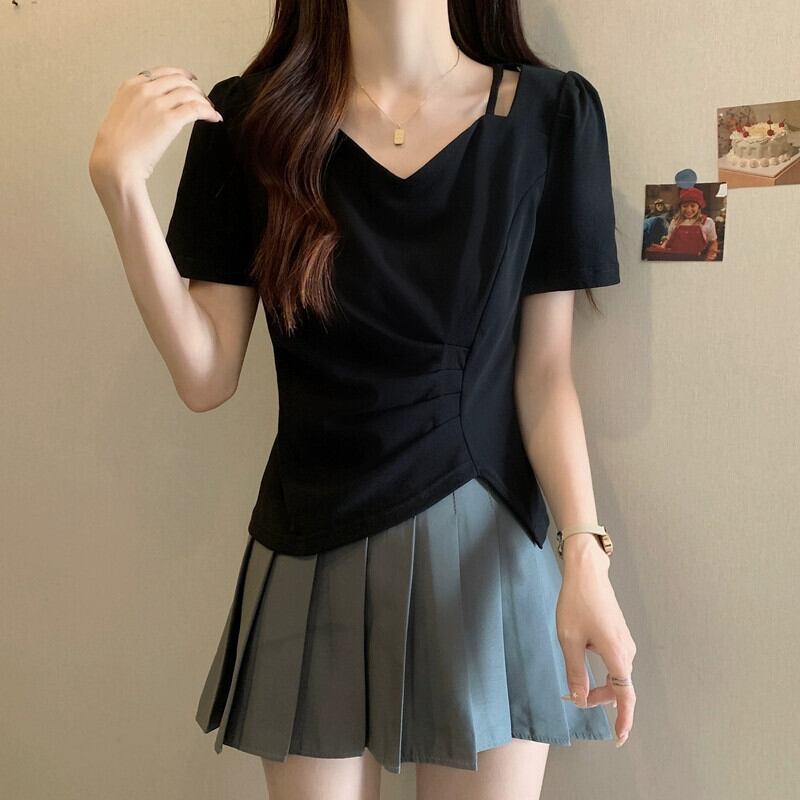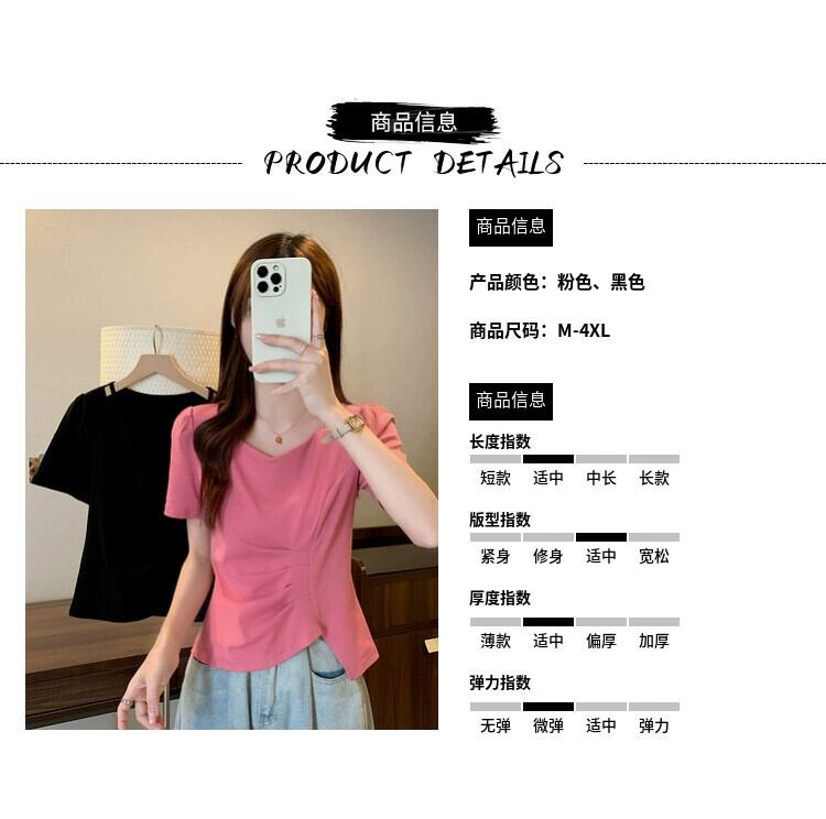 プラスサイズの婦人服 2023 夏服ファットシスター不規則半袖 Tシャツフレンチ V ネックデザインセンス年齢軽減カジュアルトップス 大きめサイズ サマー 夏物 Vネック 8884198635949827