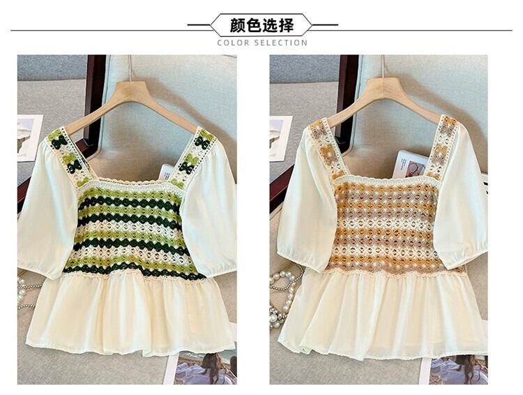 プラスサイズの婦人服 2023 脂肪姉妹夏の新ファッション中空スクエアカラースプライシング小さなシャツ痩身半袖トップ 大きめサイズ サマー 夏物 スクウェア 8884193568479688