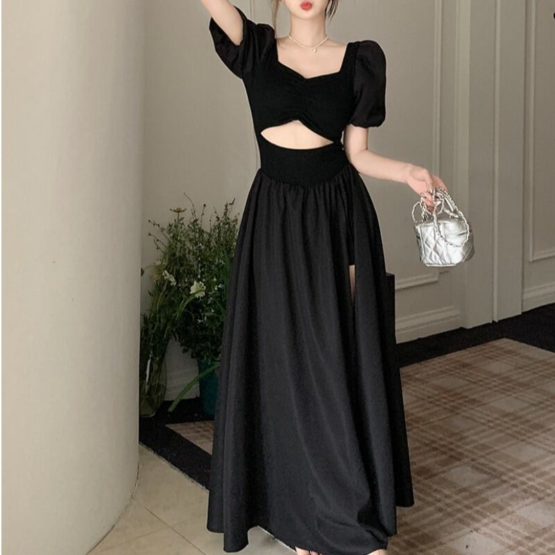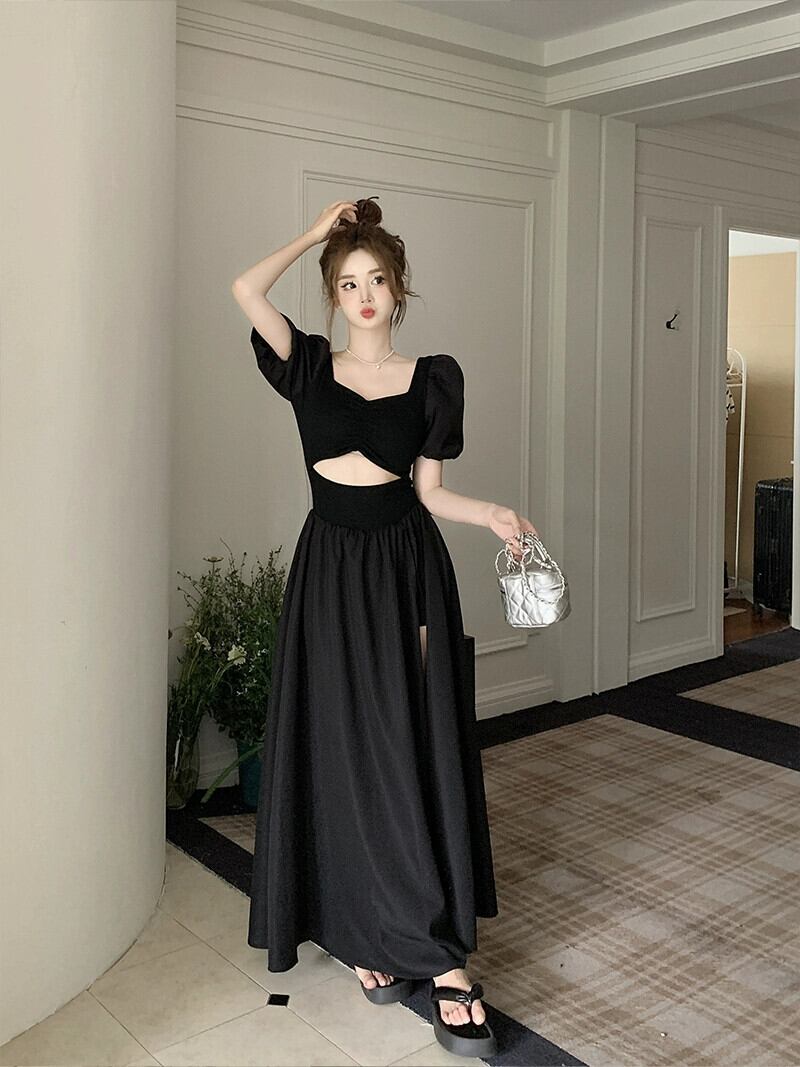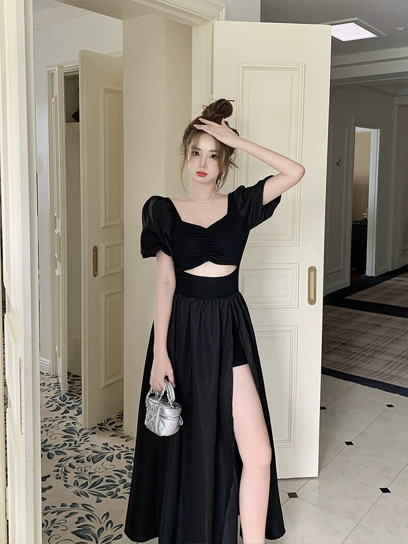 プラスサイズの婦人服 2023 流行の夏の新しいファットシスターフレンチヘップバーンスタイルのドレススリム半袖スリットロングスカート ショート ハーフスリーブ 大きめサイズ サマー 夏物 8884172532066121