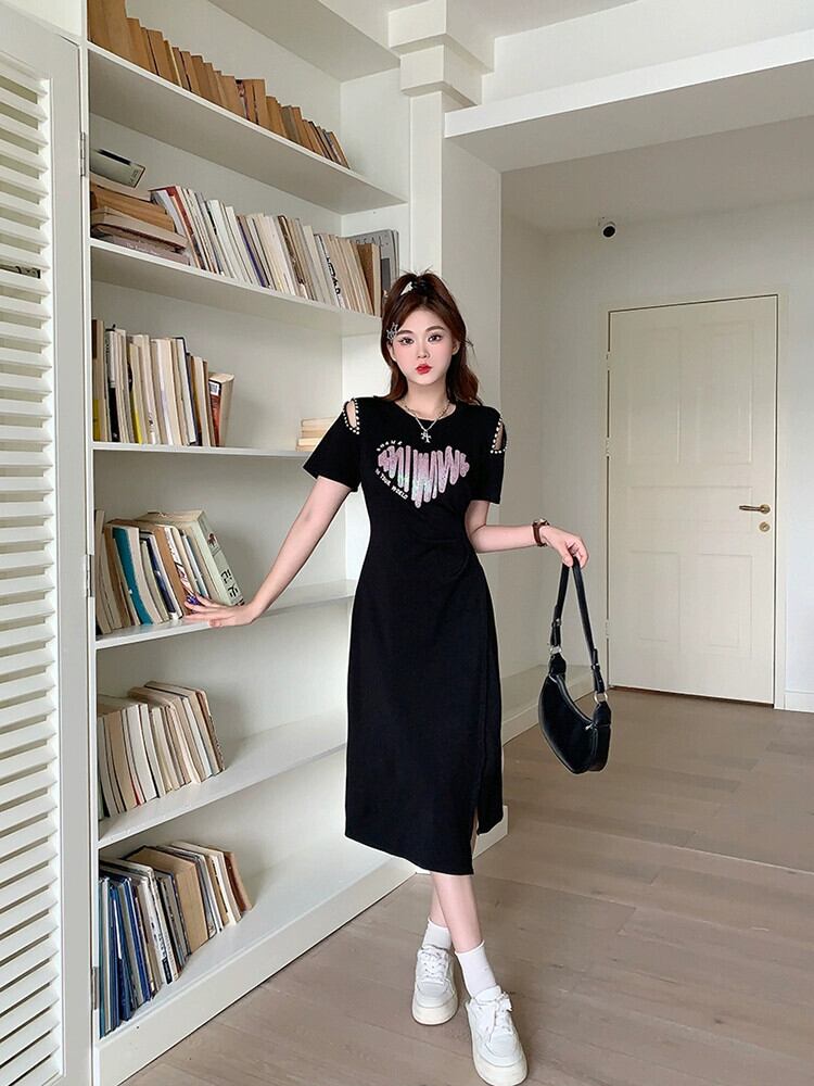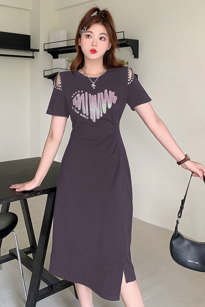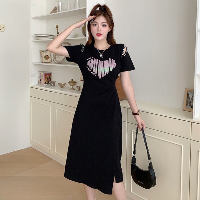 プラスサイズの婦人服 2023 脂肪姉妹夏の新ファッションカジュアルミッドレングススカートダイヤモンドオフショルダー年齢軽減プリントドレス 大きめサイズ サマー 夏物 8884159805651681