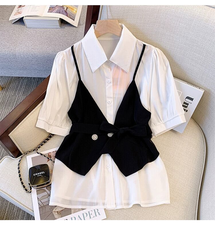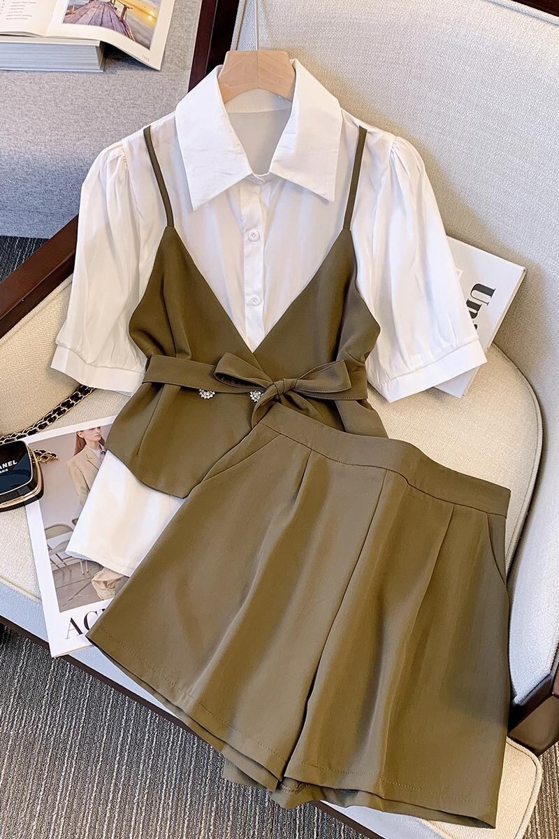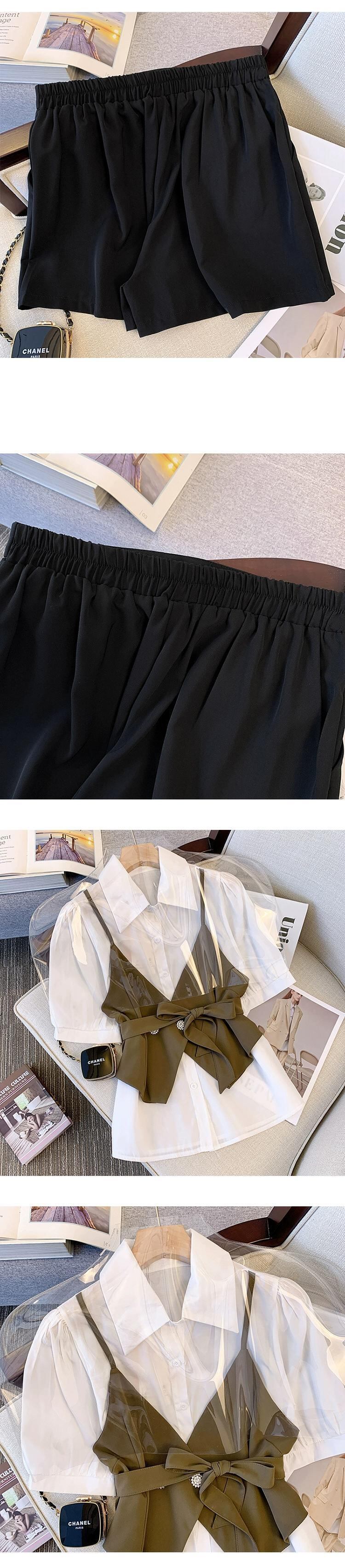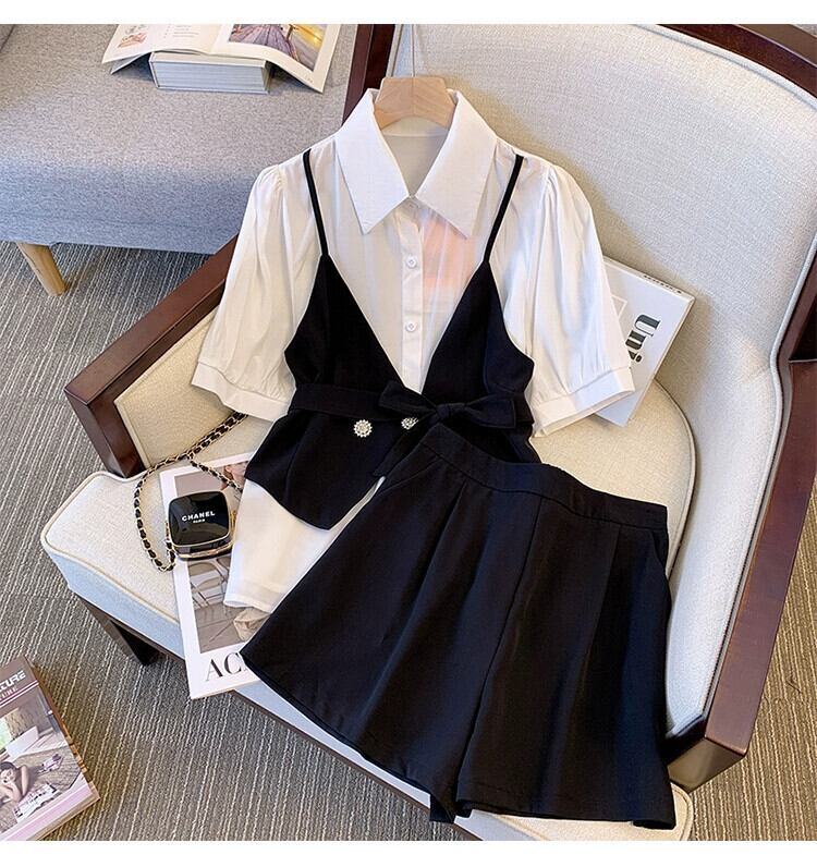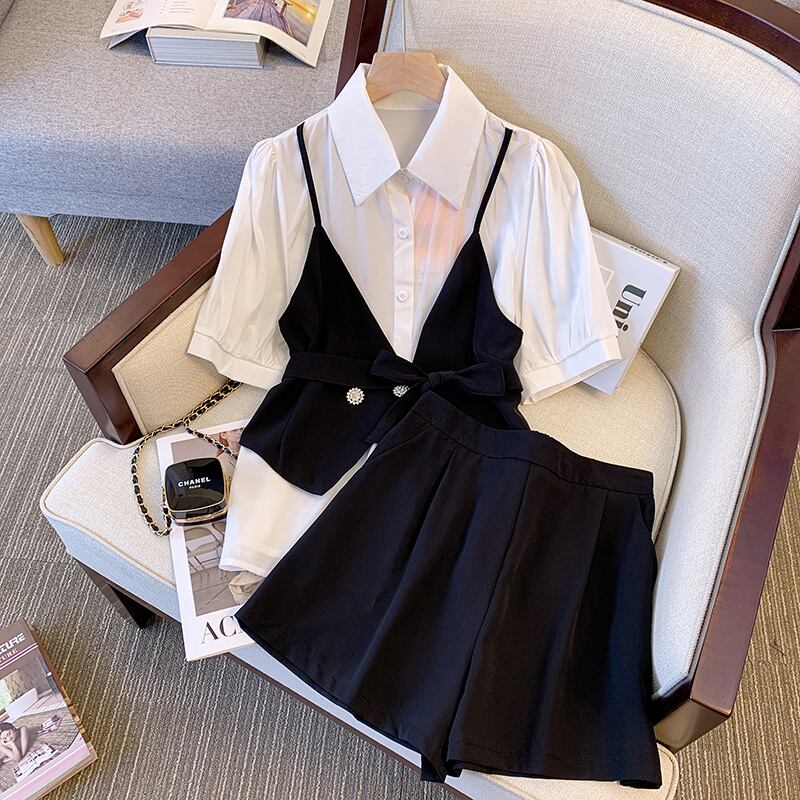 プラスサイズの婦人服 2023 ファットシスター夏の新しいファッションスーツスリムステッチ半袖シャツショーツ 2 点セット 大きめサイズ サマー 夏物 ブルマー 8884153186306989