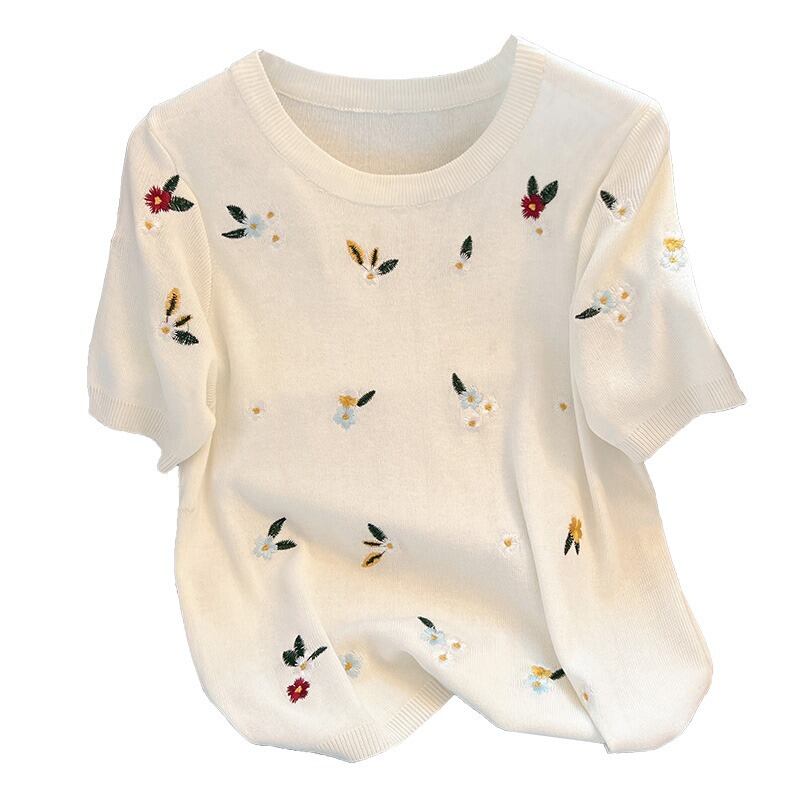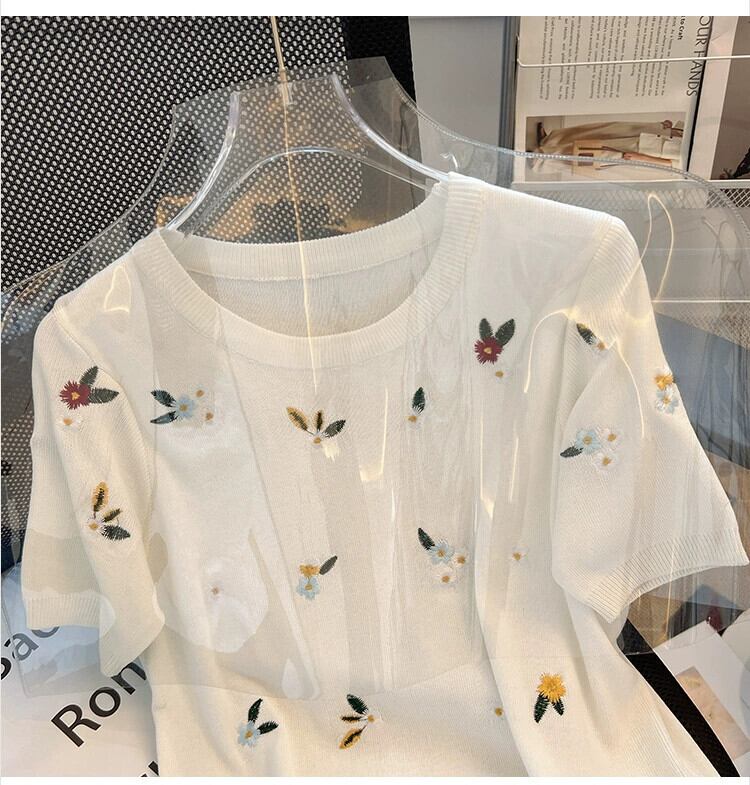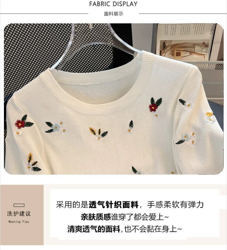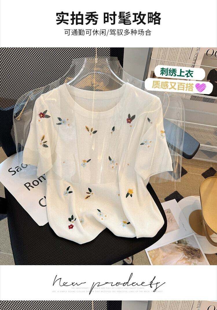 プラスサイズの婦人服 2023 流行の夏の新しいファットシスターファッションオールマッチ刺繍半袖 Tシャツアイスシルクニットトップ 大きめサイズ サマー 夏物 8884197709874893