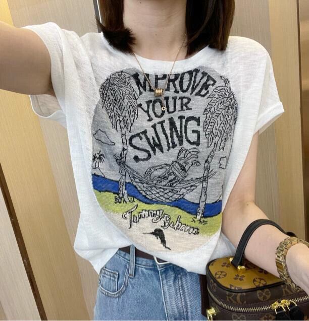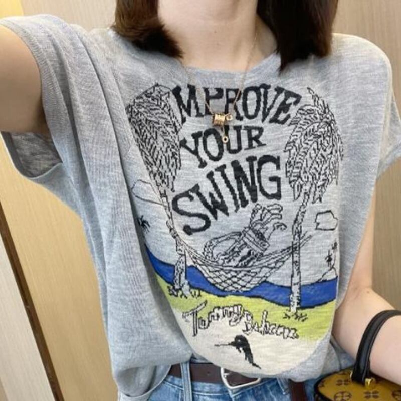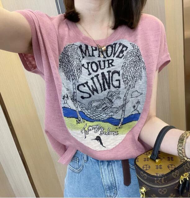 プラスサイズの婦人服 2023 流行の夏の新しいファットシスターオールマッチファッションデザインセンス Tシャツレタージャカードニットトップ 大きめサイズ サマー 夏物 8884176094207836