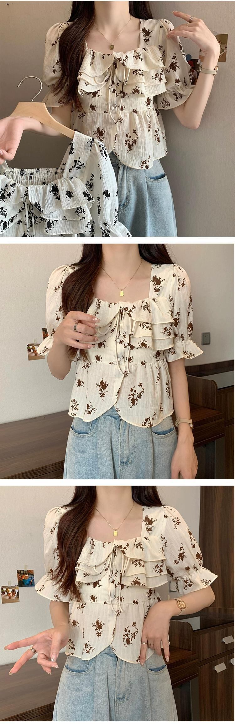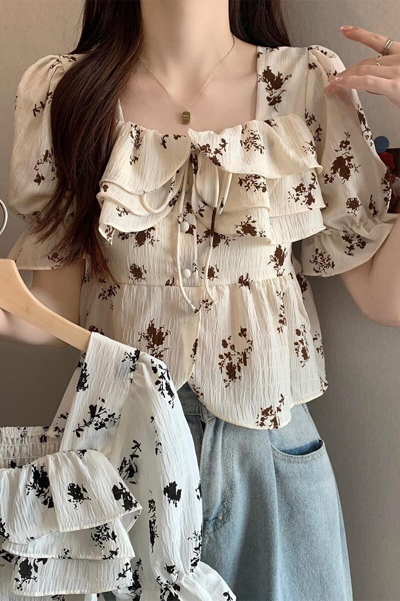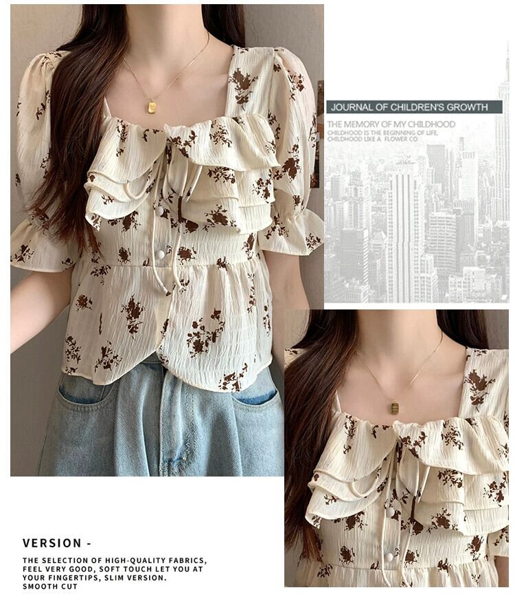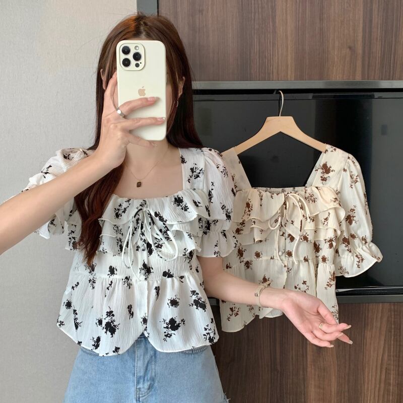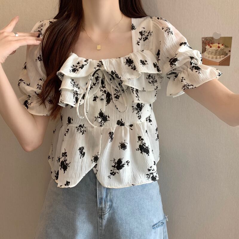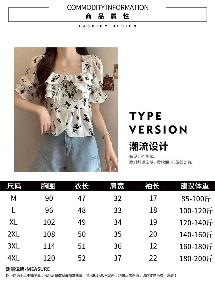 プラスサイズの婦人服 2023 脂肪姉妹夏の新しい痩身スクエアカラーフリルシフォン花柄シャツニッチトップス ラッフル 大きめサイズ サマー 夏物 スクウェア 8884194423262877