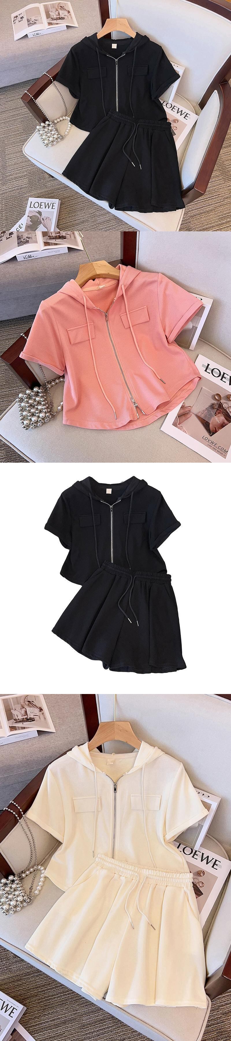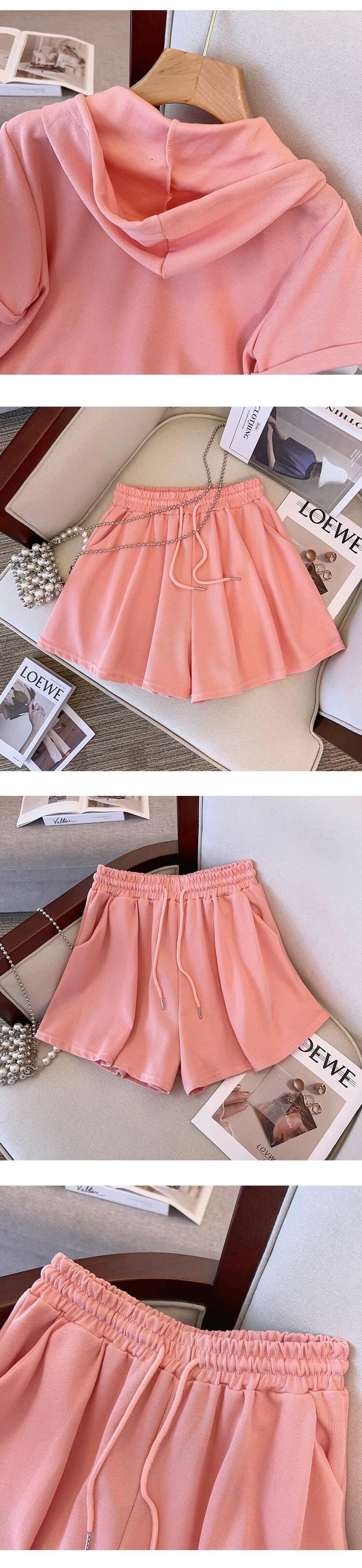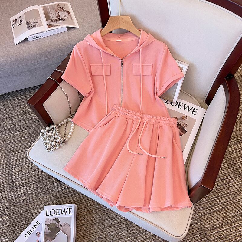 プラスサイズの婦人服 2023 ファットシスター夏の新ファッションスーツスリム巾着フード付き半袖ショーツ 2 点セット 大きめサイズ サマー 夏物 ブルマー 8884168768308901