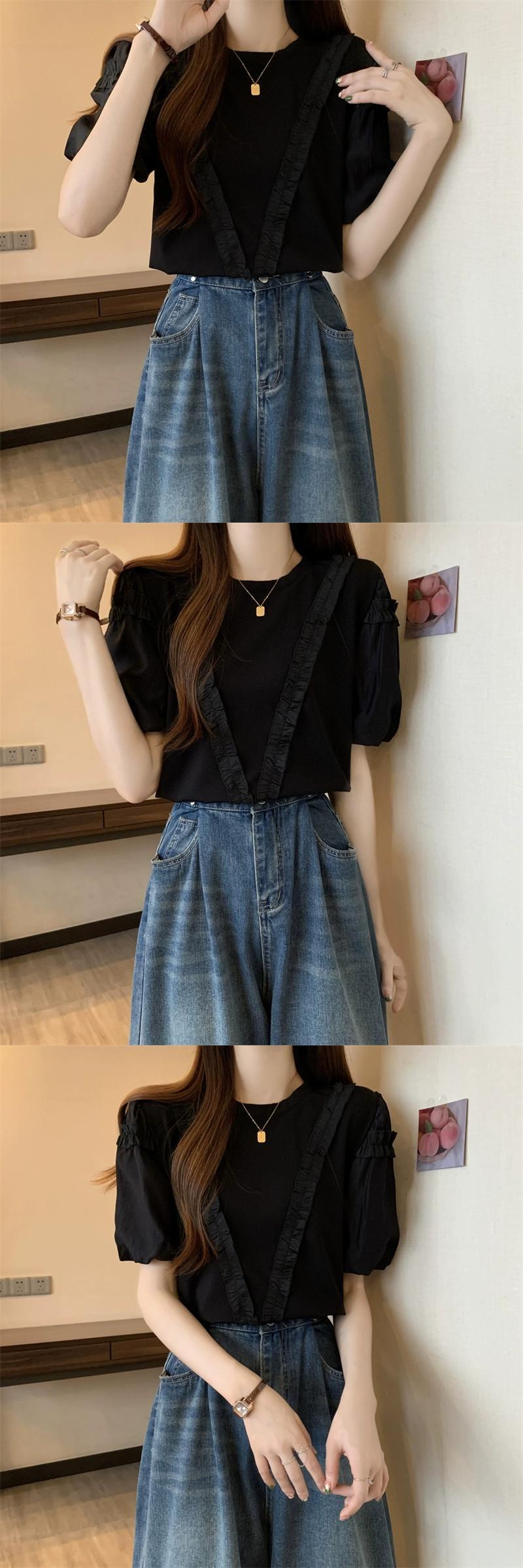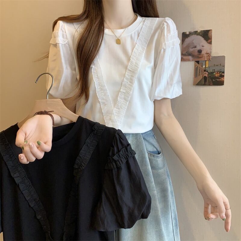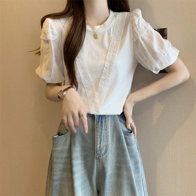 プラスサイズの婦人服 2023 夏服ファットシスターファッション年齢軽減レース半袖 T シャツフロントショルダーパフスリーブカバー肉トップ 大きめサイズ サマー 夏物 Tシャツ 8884127057436166