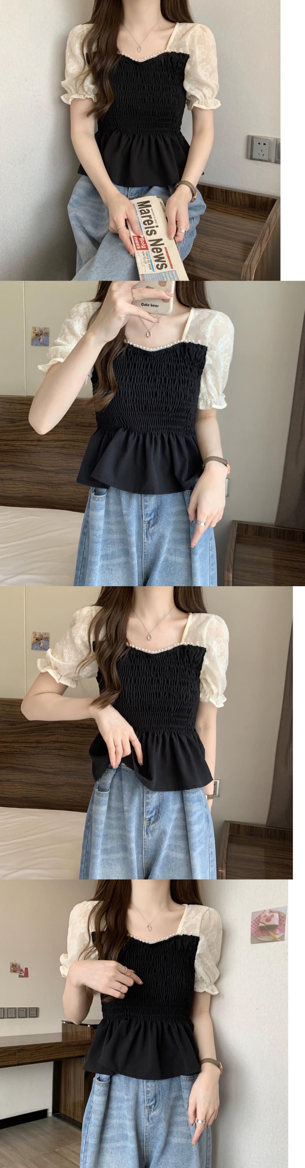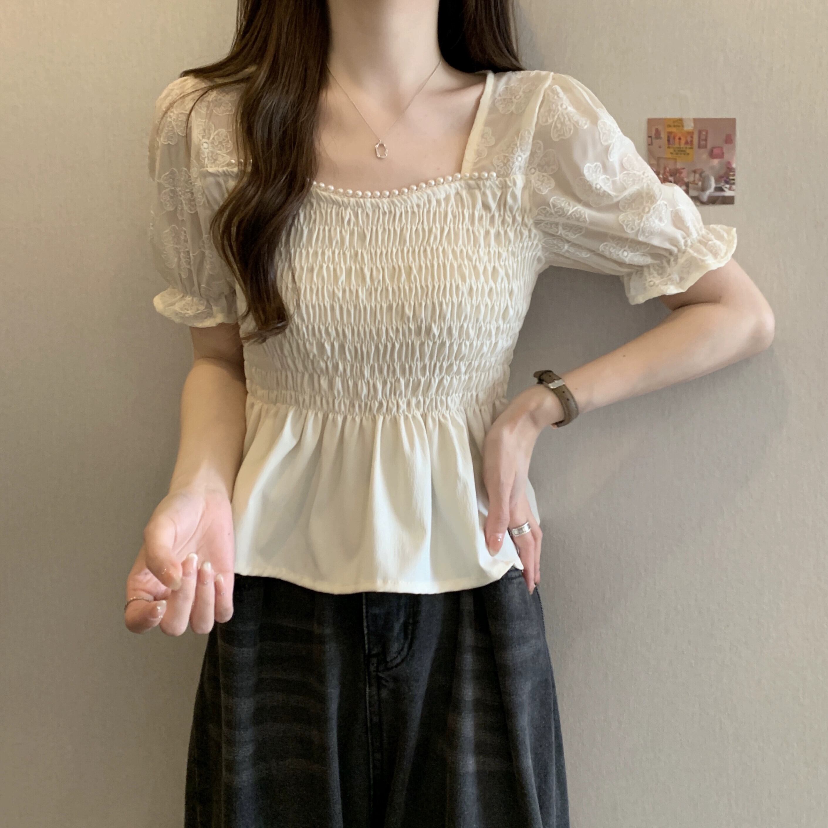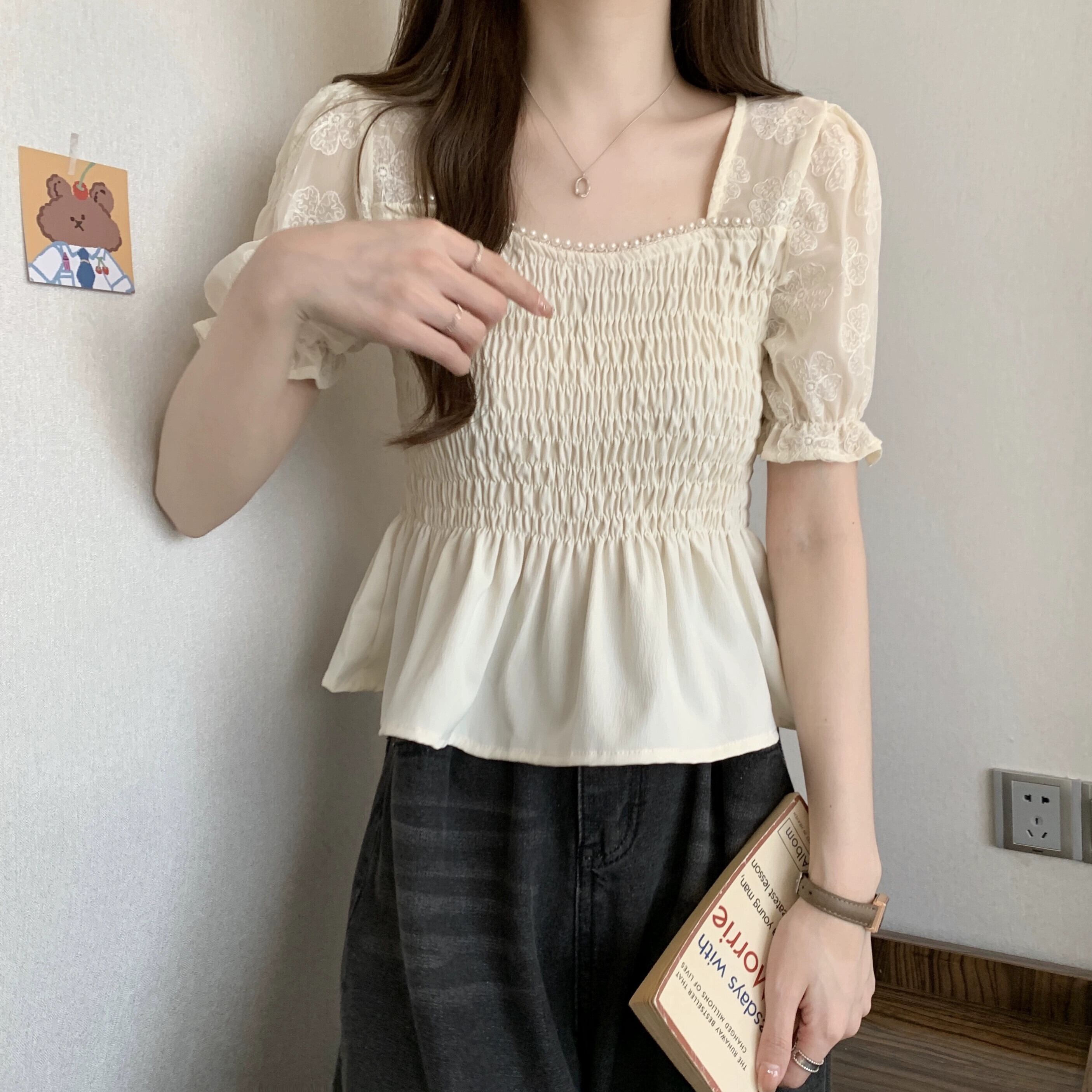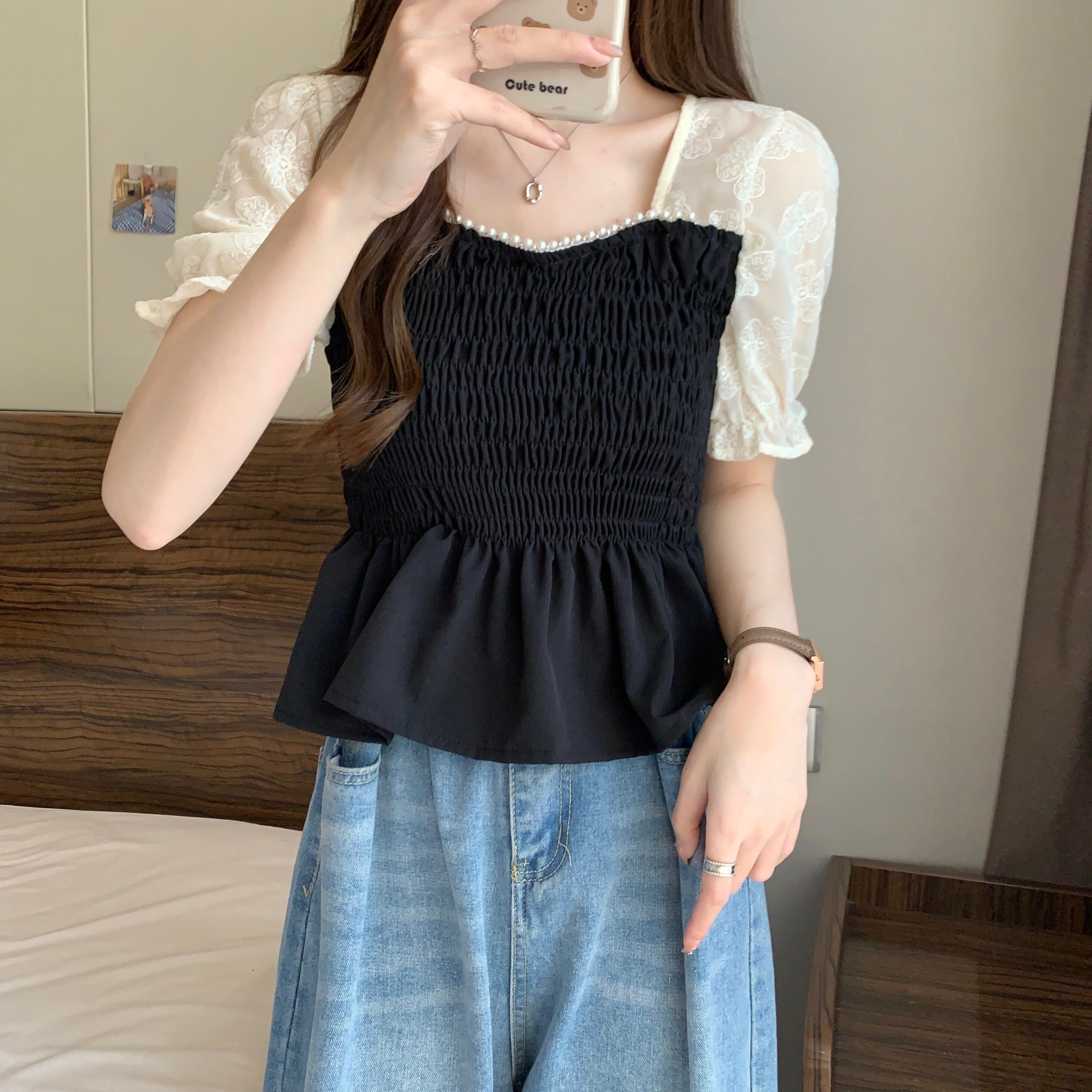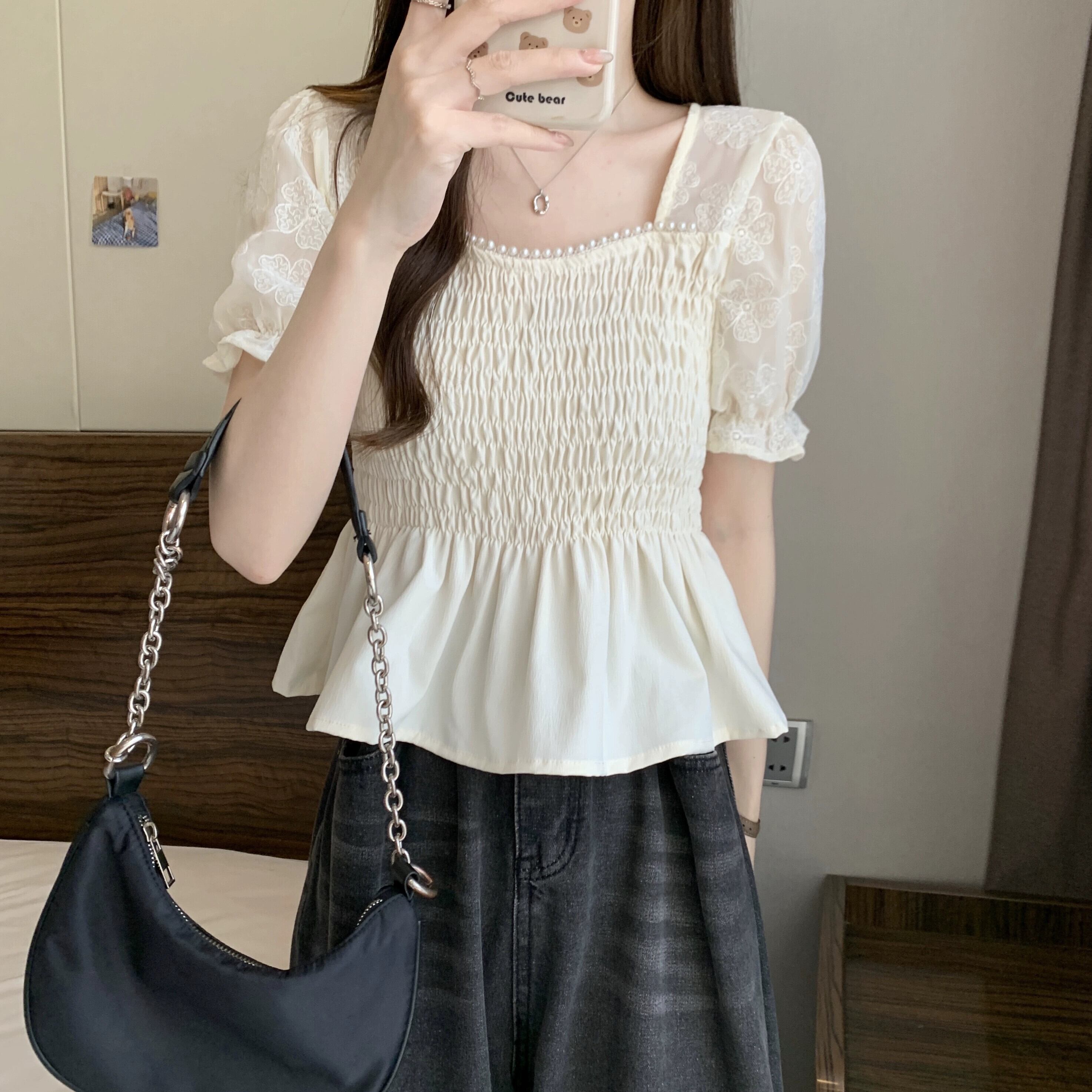プラスサイズの婦人服 2023 脂肪姉妹夏の新スタイルフレンチスクエアカラーフロントショルダーレースシャツ eign スタイルユニークな痩身トップ 大きめサイズ サマー 夏物 スクウェア 888415095303154