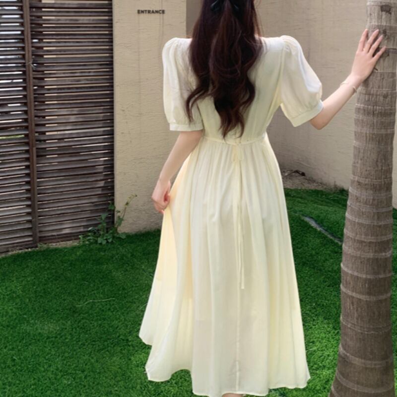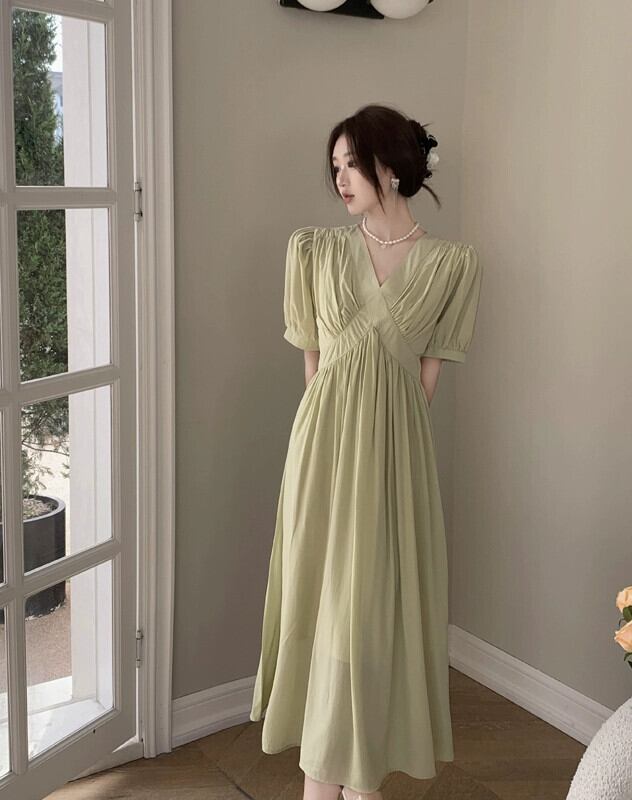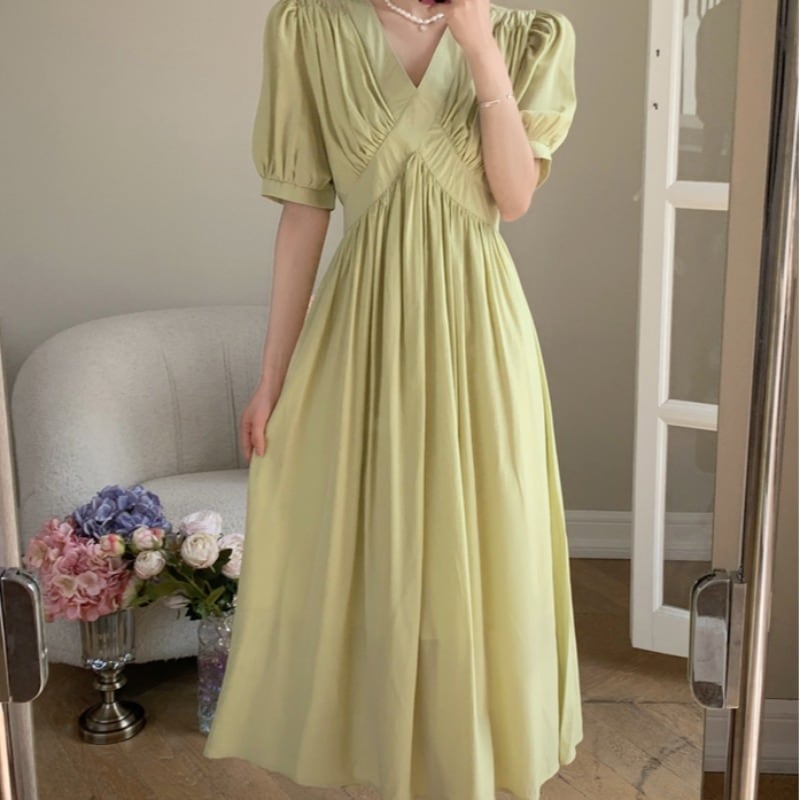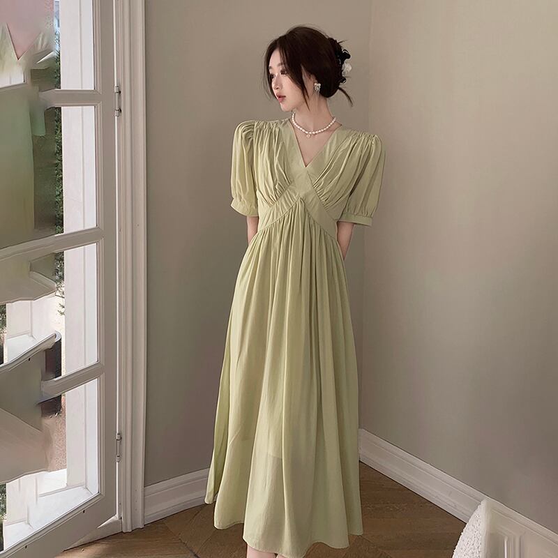 プラスサイズの婦人服 2023 流行の夏の新しいファットシスターフレンチ V ネック半袖ヘップバーンスタイルドレス a ラインミドル丈スカート 大きめサイズ サマー 夏物 Vネック Aライン 8884158450758706