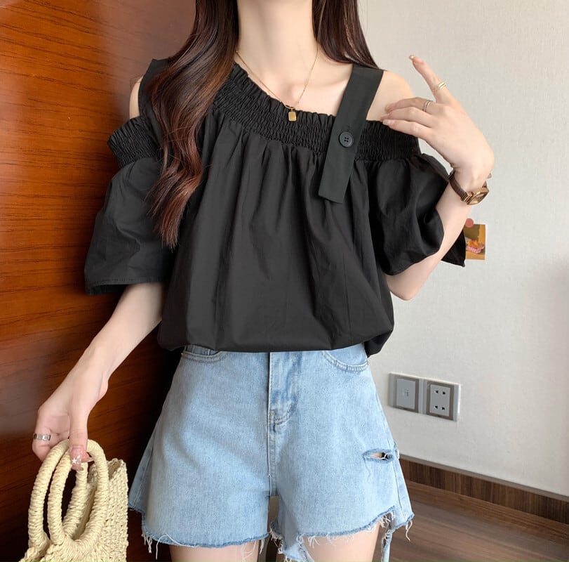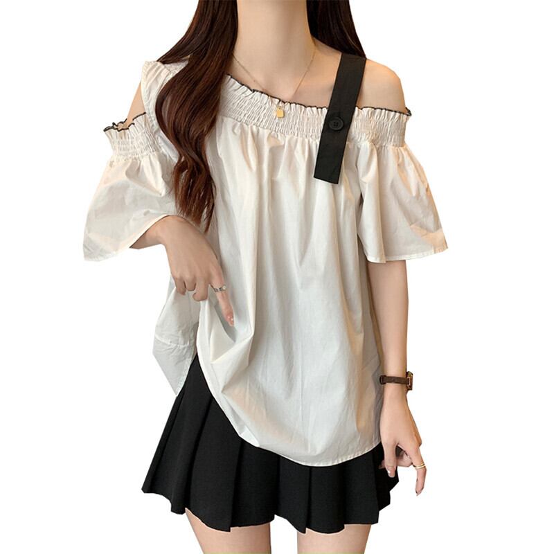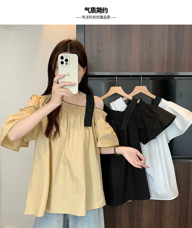 プラスサイズの婦人服 2023 ファットシスター夏の新しいデザインセンスオフショルダーシックなルーズルーズ年齢軽減半袖シャツトップ 大きめサイズ サマー 夏物 8884173079238622