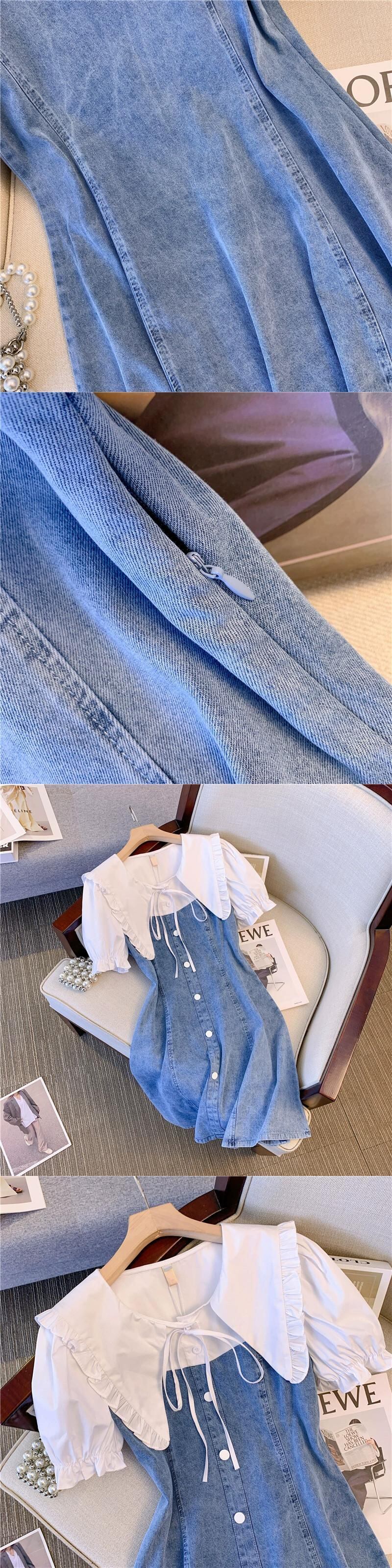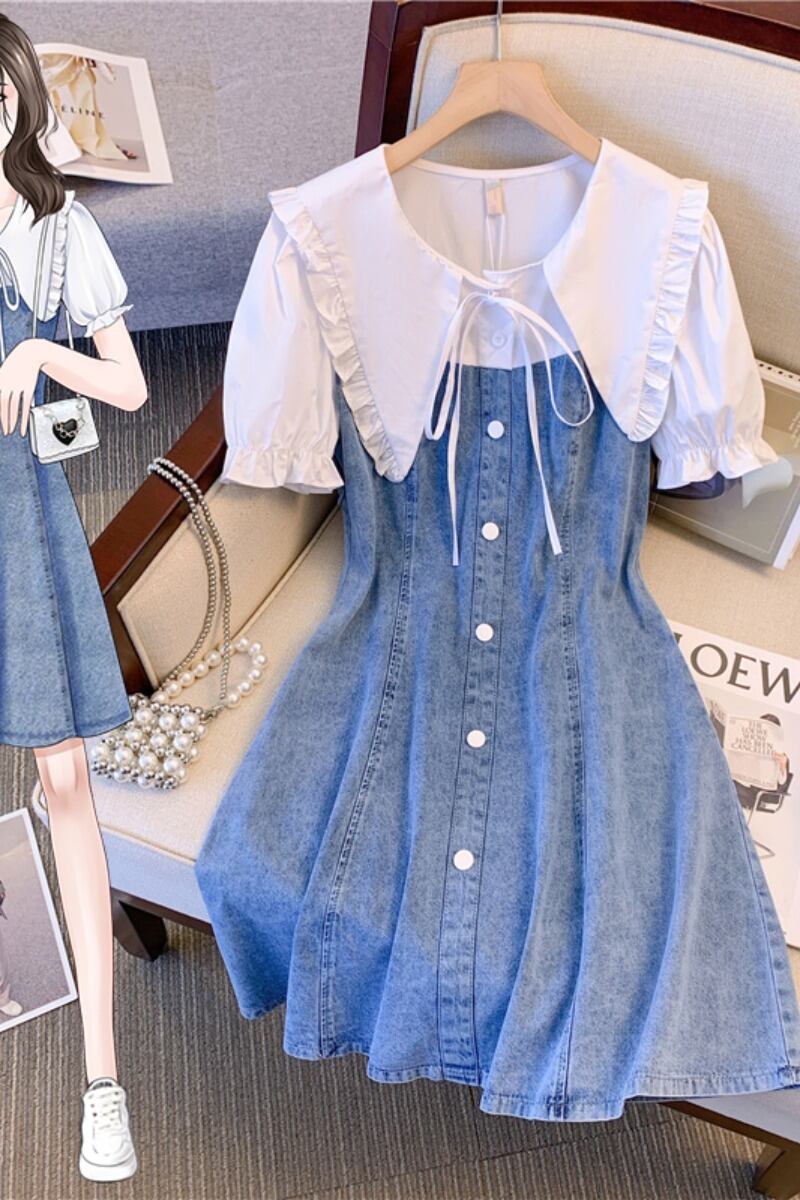 プラスサイズの婦人服 2023 脂肪姉妹夏の新しい a ラインスカート人形の襟ウエスト調節可能なスリムデニムドレス 大きめサイズ サマー 夏物 アジャスタブル Aライン 8884194365841928