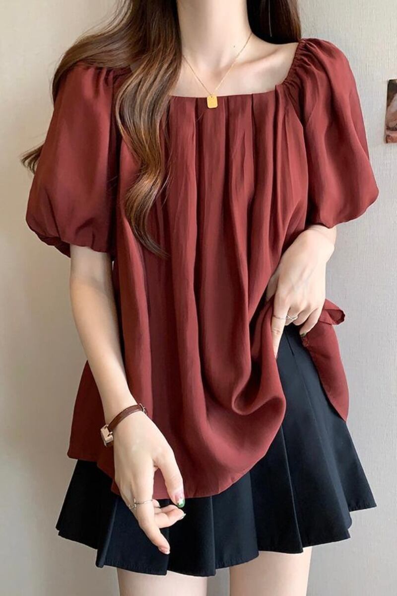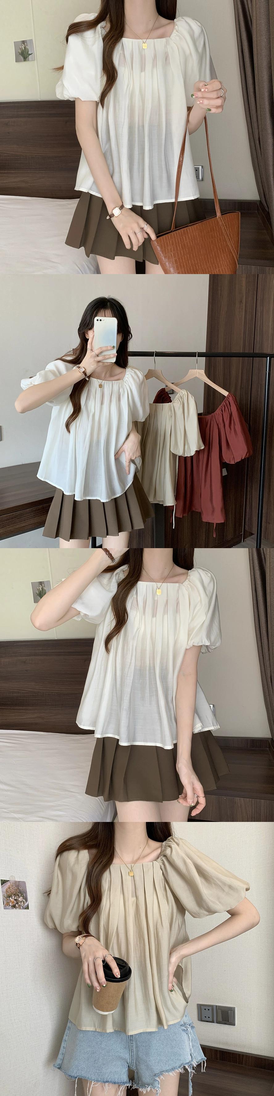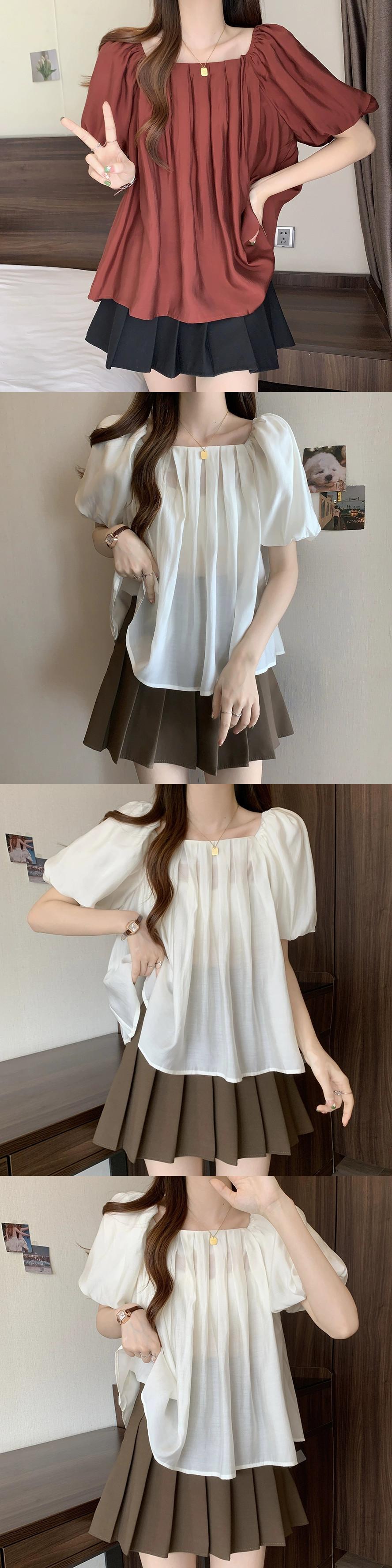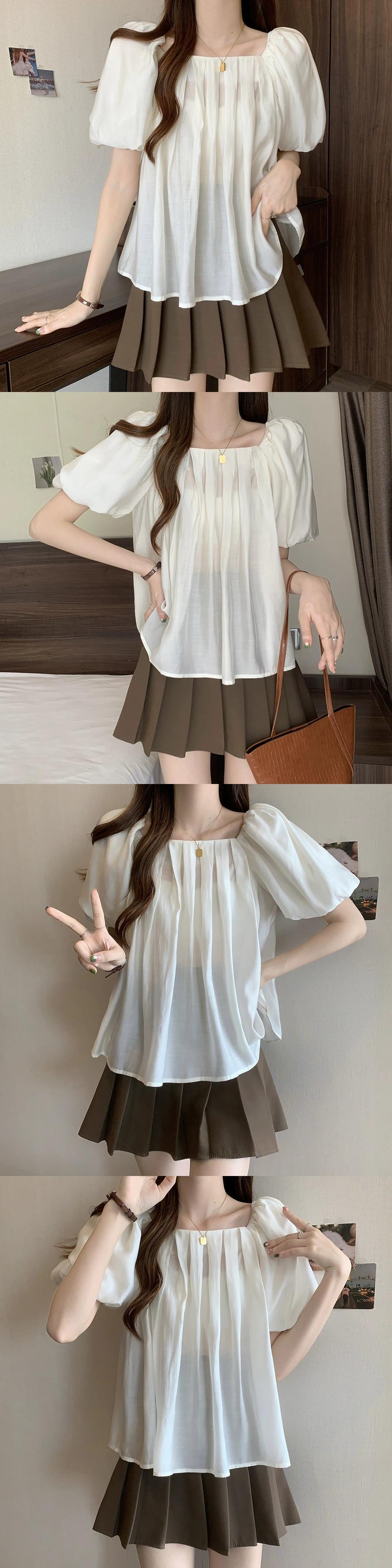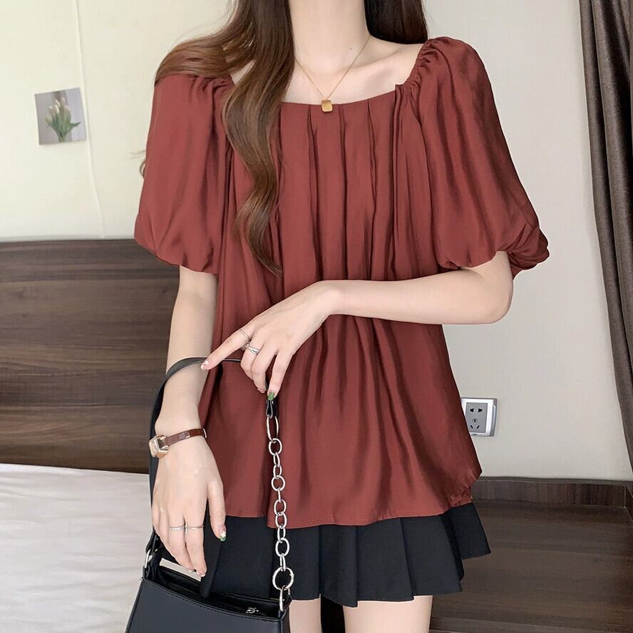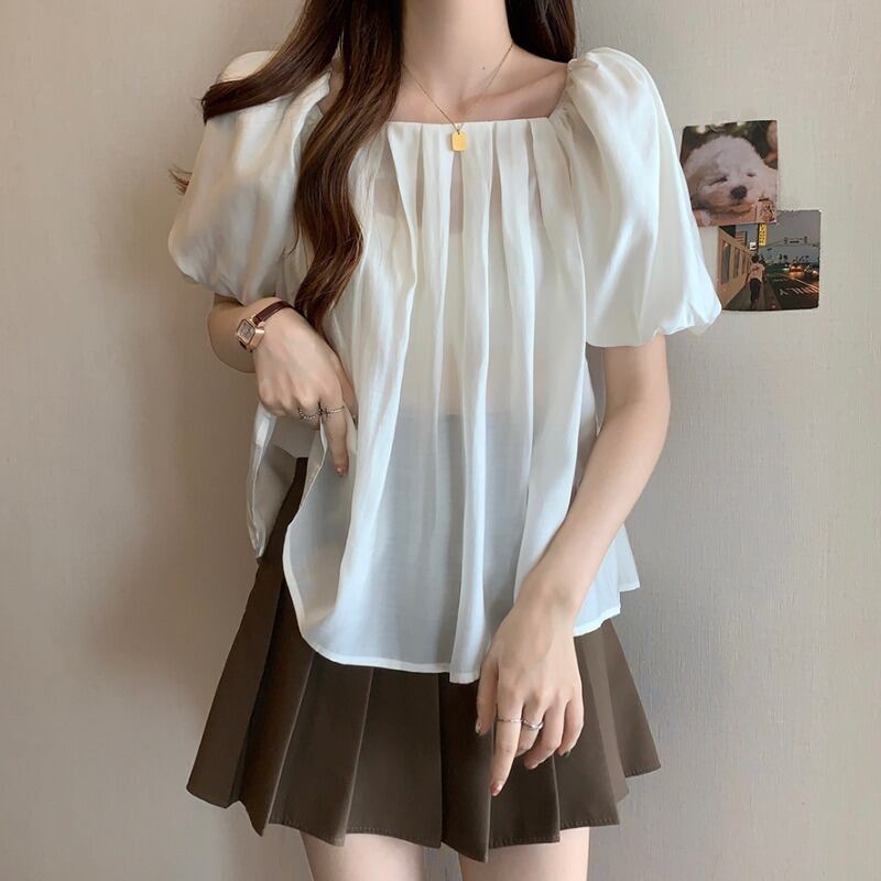 プラスサイズの婦人服 2023 夏服ファットシスタープリーツスクエアカラーパフスリーブシャツ、お腹のトップをカバーするシックなデザイン 大きめサイズ サマー 夏物 スクウェア 8884127259573685