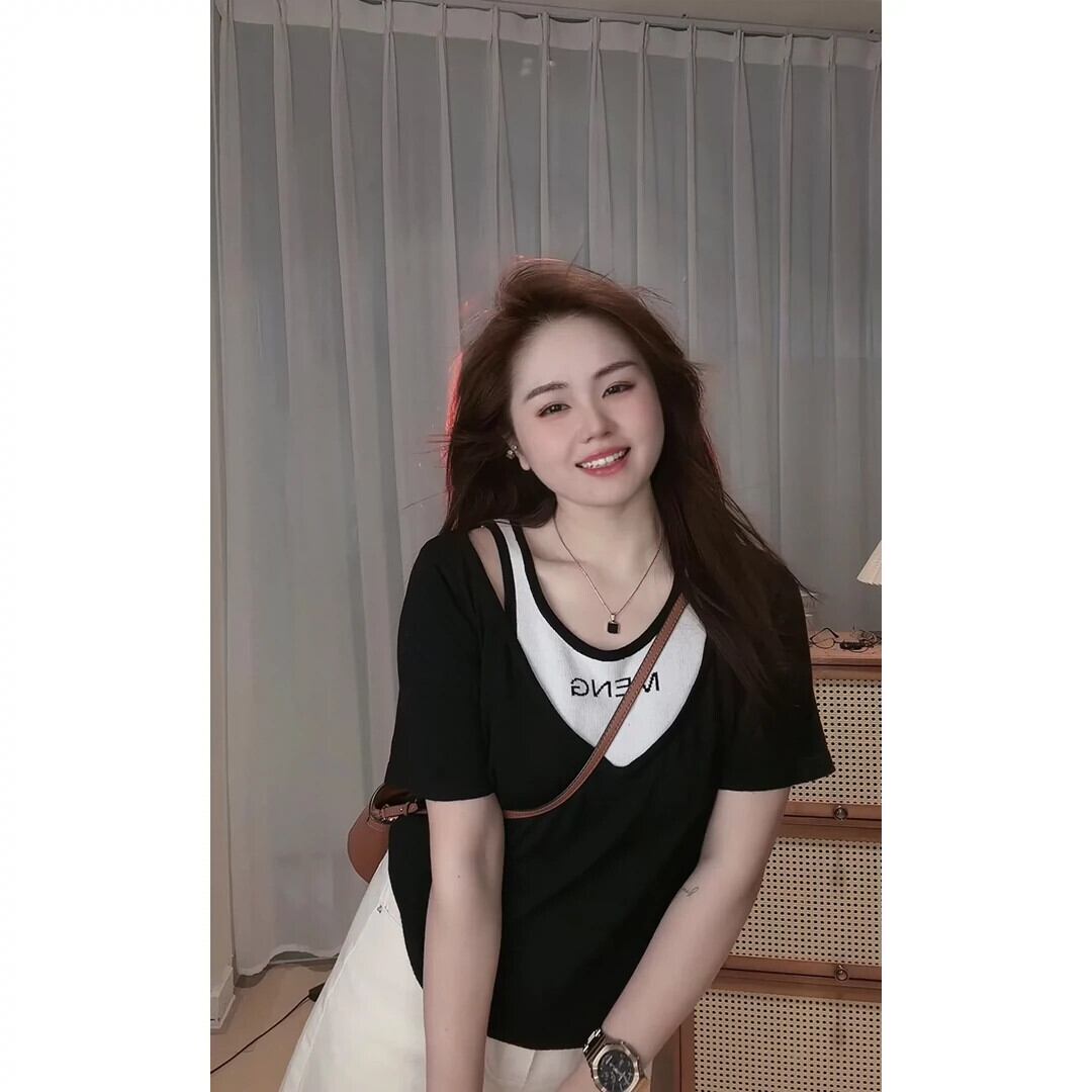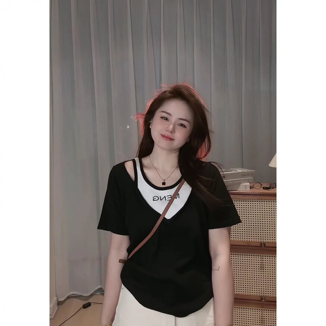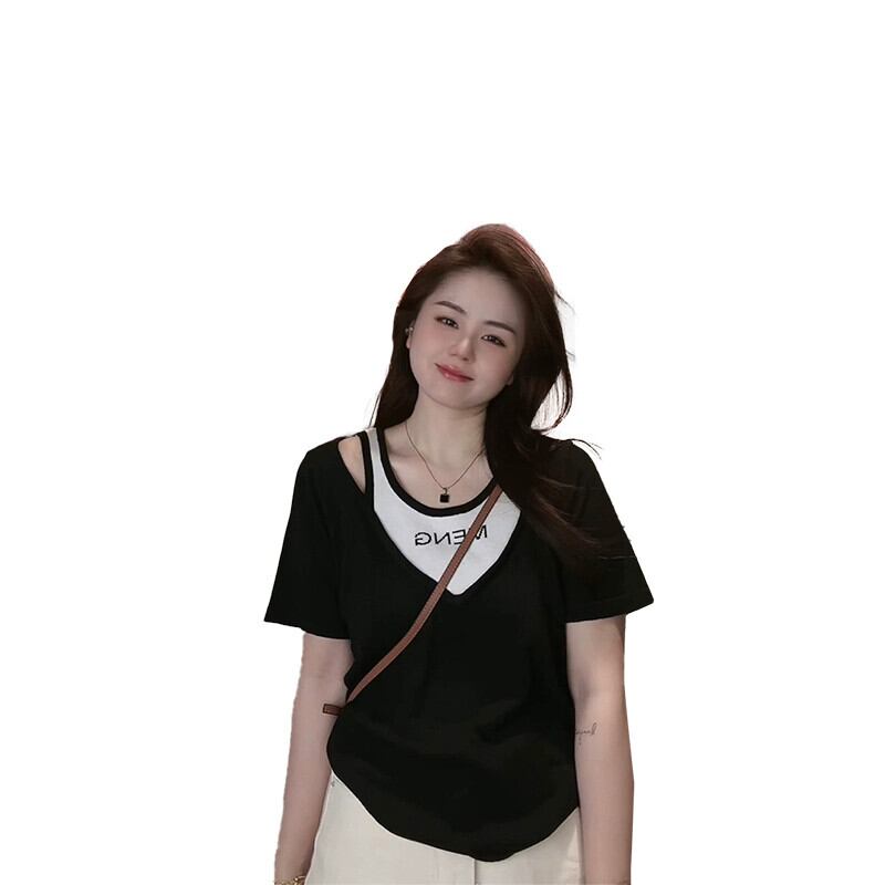 大きいサイズの婦人服 2023 脂肪姉妹夏ニューレターニットフェイクツーピース半袖ルーズストラップレス Tシャツトップ 大きめサイズ サマー 夏物 8884124239574161