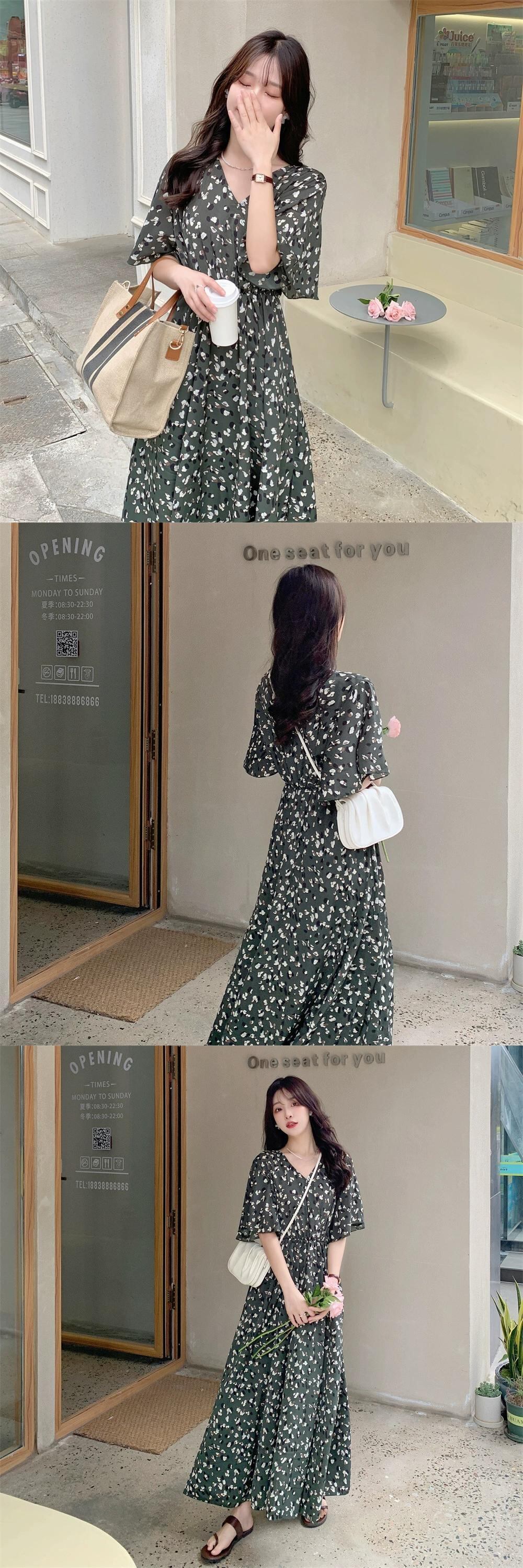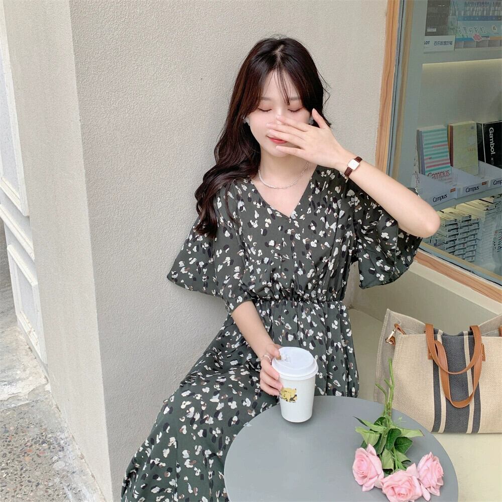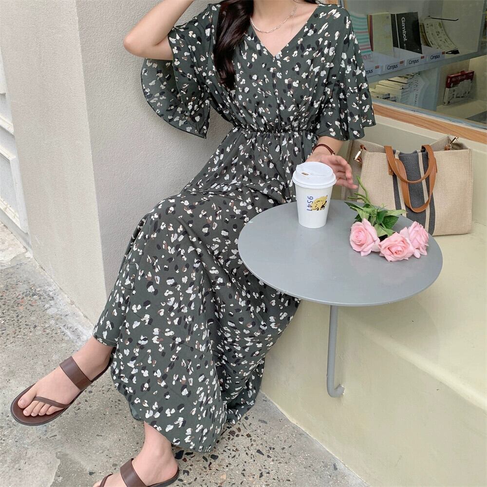 プラスサイズの婦人服 2023 脂肪姉妹夏の新フレンチスタイルルーズ腹カバーロングスカート V ネックスリム花柄ドレス 大きめサイズ サマー 夏物 Vネック 8884112892379197