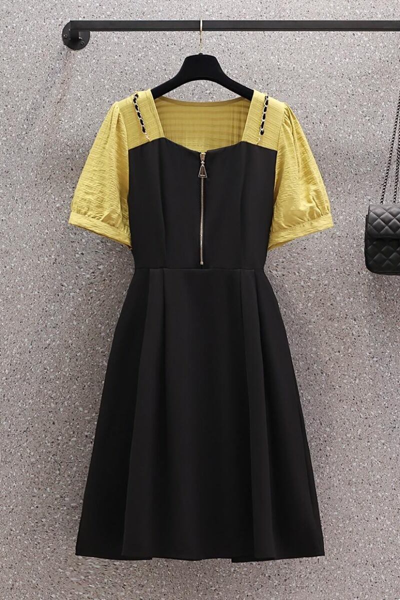 プラスサイズの婦人服 2023 夏服脂肪ファッション気質薄いコントラストカラー A ラインスカートスクエアカラーフェイクツーピースドレス 大きめサイズ サマー 夏物 Aライン スクウェア 8884129927733104