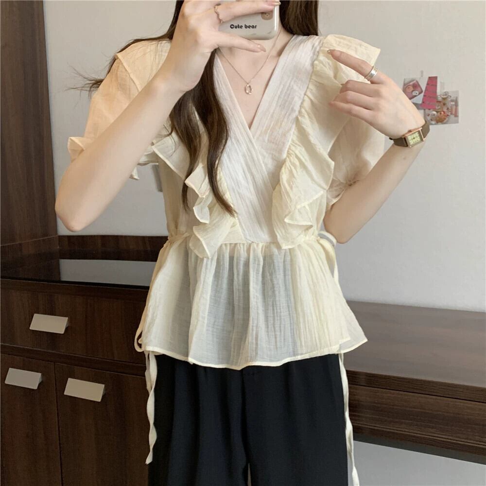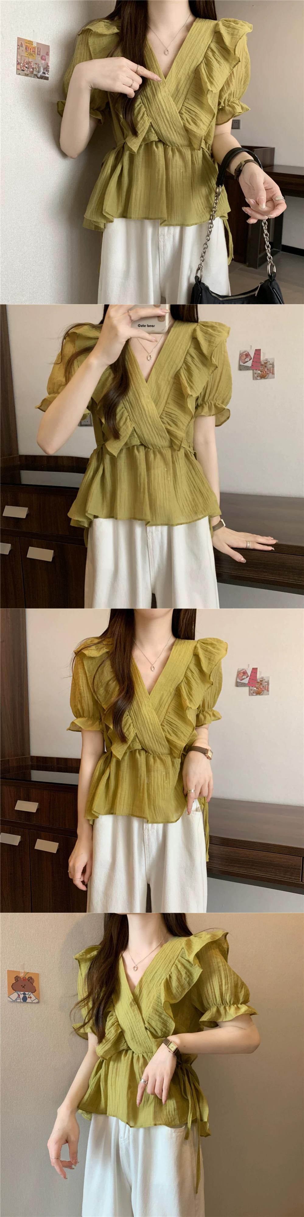 大きいサイズの婦人服2023夏服太った姉妹の新しい夏服、肉をカバーして痩せて見える、木の耳、蓮の葉、Vネック半袖シャツトップス 大きめサイズ サマー 夏物 8884144651870119