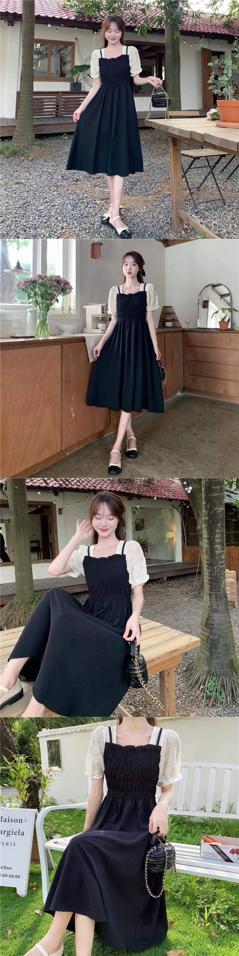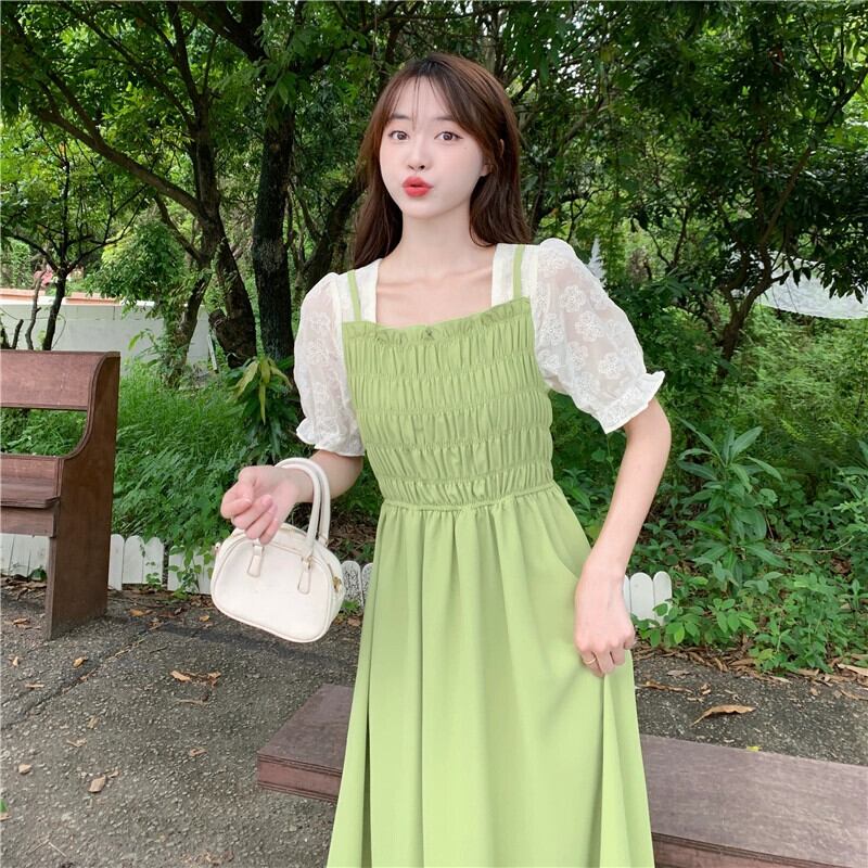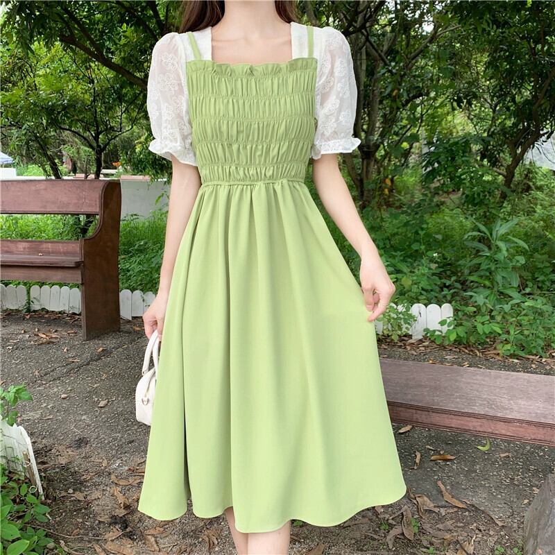 プラスサイズの婦人服 2023 トレンディな夏の新しいファットシスタースプライシング偽ツーピーススカートデザイン半袖スクエアネックドレス 大きめサイズ サマー 夏物 スクウェア 8884122747525858