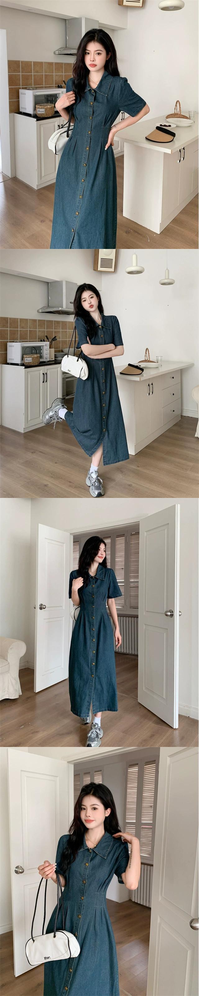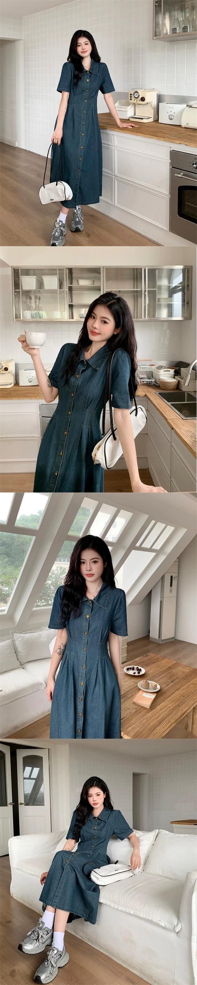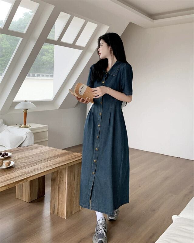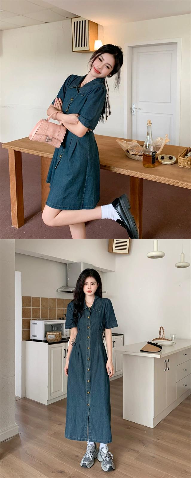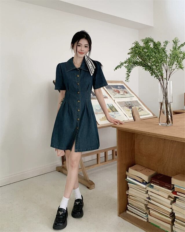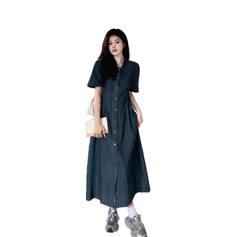 プラスサイズの婦人服 2023 脂肪姉妹夏新レトロデニムスカートロングとショートブレストボタンピンチプリーツスリムドレス 大きめサイズ サマー 夏物 8884120573167342