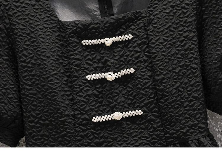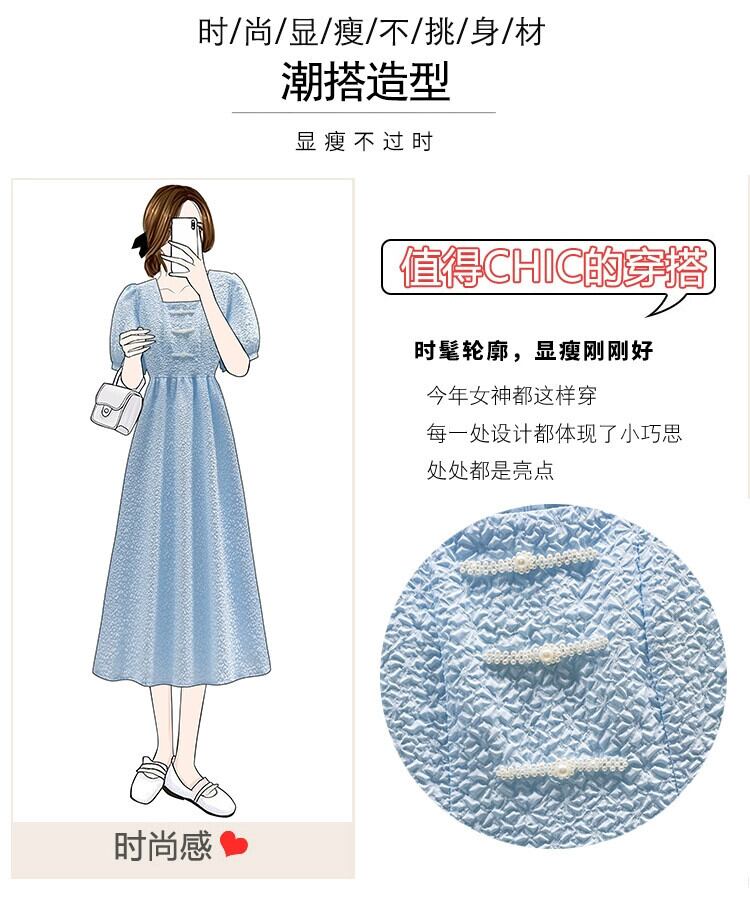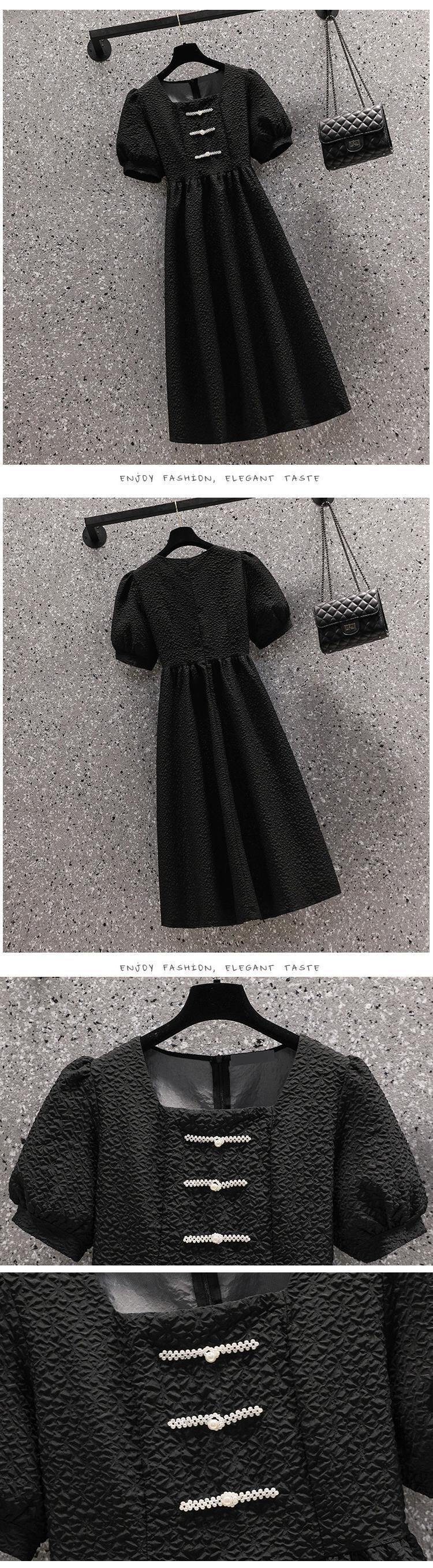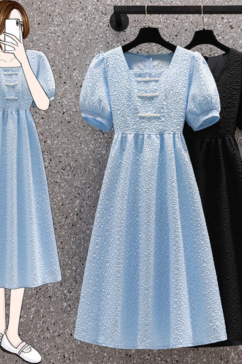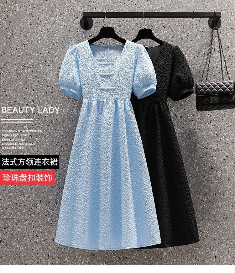 プラスサイズの婦人服 2023 脂肪姉妹夏の新しいデザインセンススクエアカラー半袖パール痩身ドレス気質ドレス 大きめサイズ サマー 夏物 真珠 スクウェア 8884140464615502