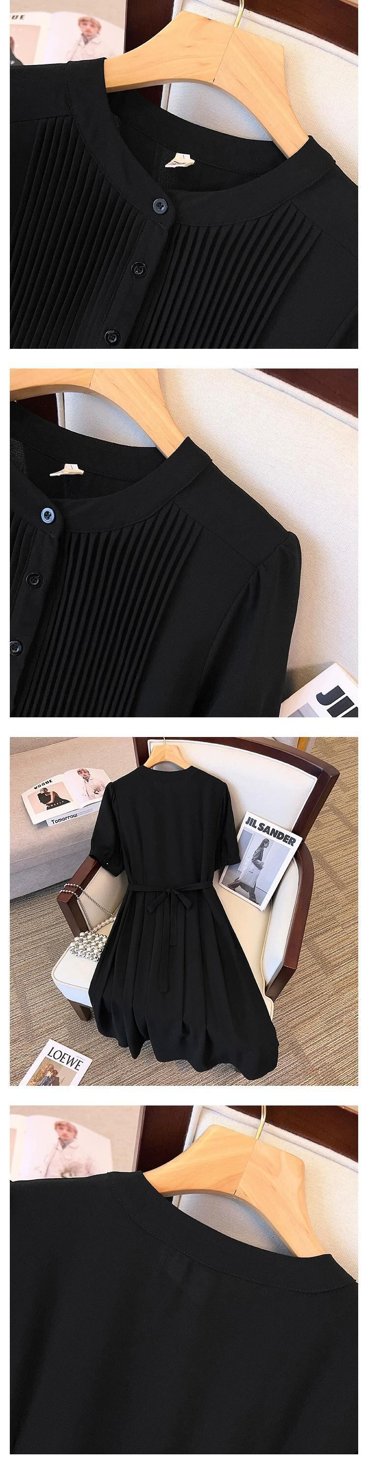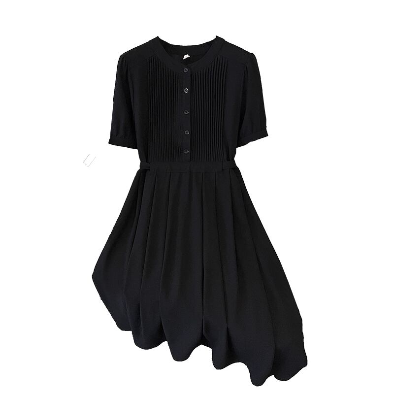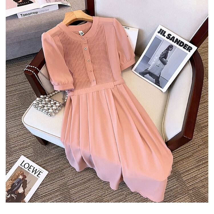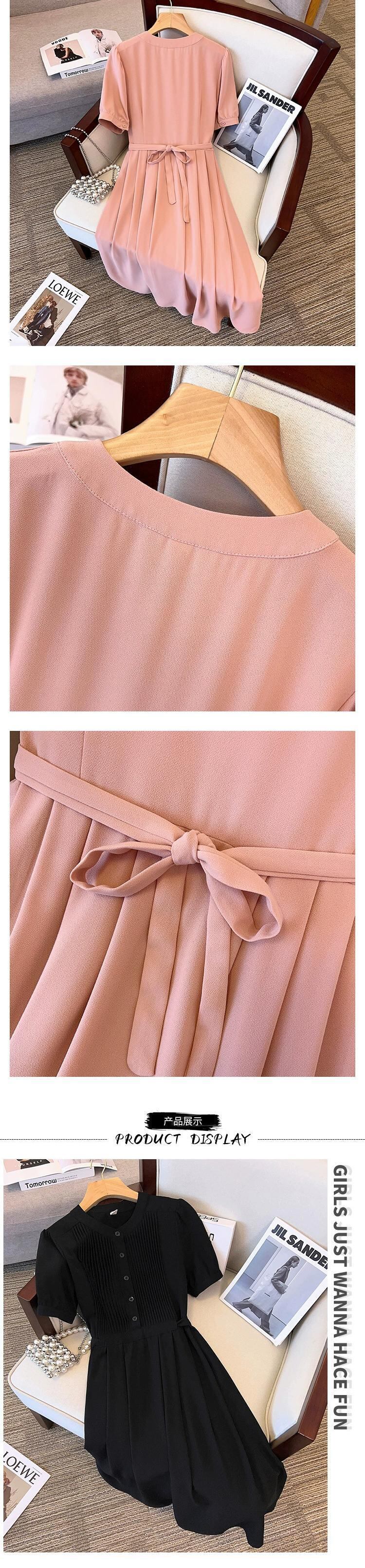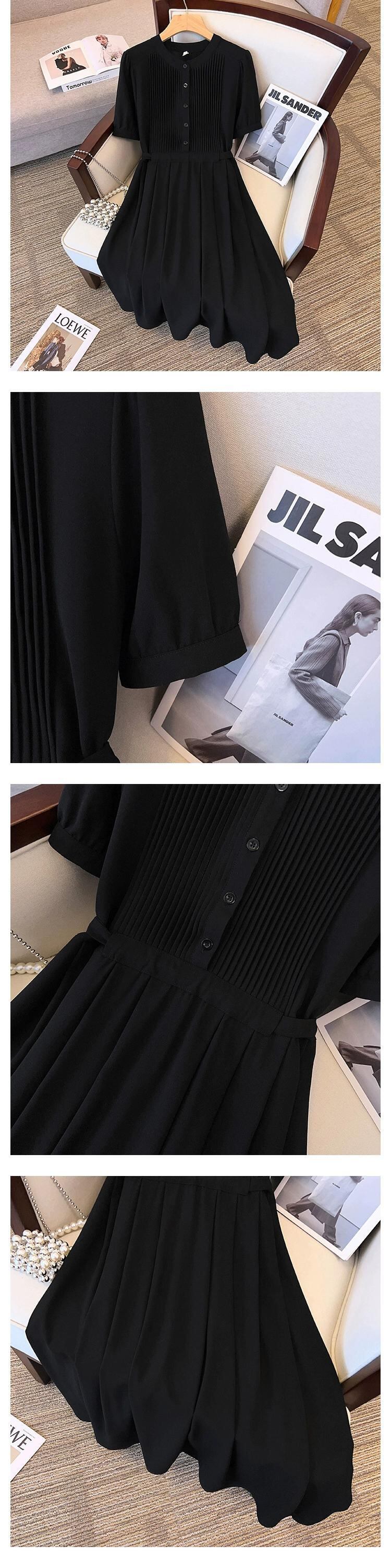 プラスサイズの婦人服 2023 脂肪姉妹夏の新しいラウンドネック立体ストライプ半袖 A ラインスカートミドル丈ドレス 大きめサイズ サマー 夏物 Oネック Aライン 8884191317519302