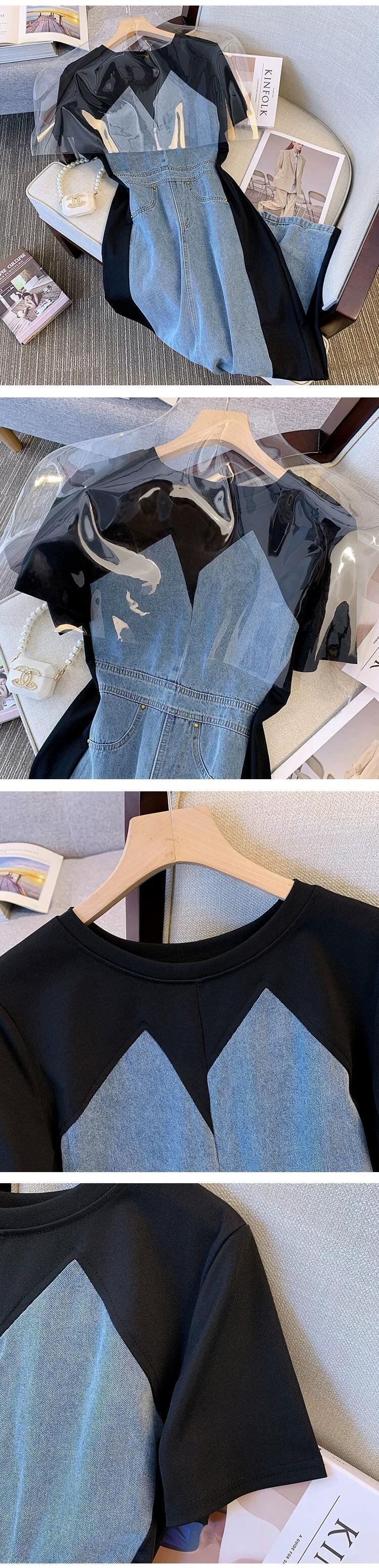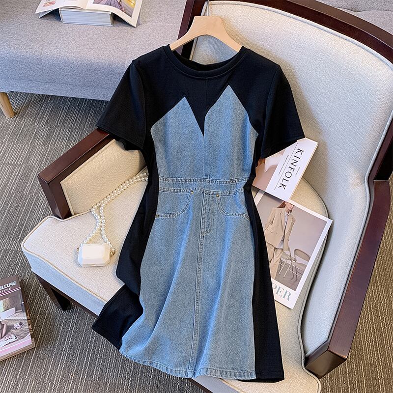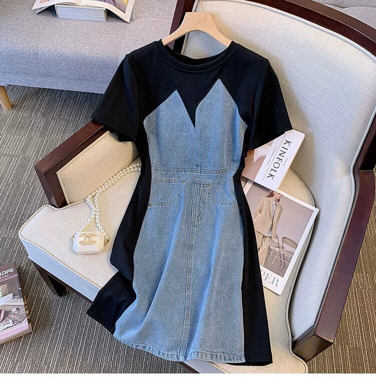 プラスサイズの婦人服 2023 脂肪姉妹夏の新ファッションロングスカート a ラインスカート半袖デニムステッチドレス 大きめサイズ サマー 夏物 Aライン 8884159506602619