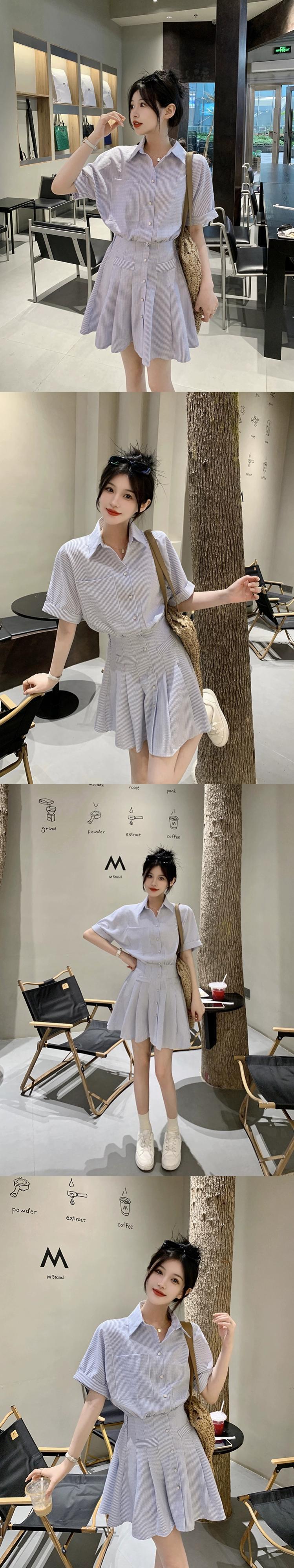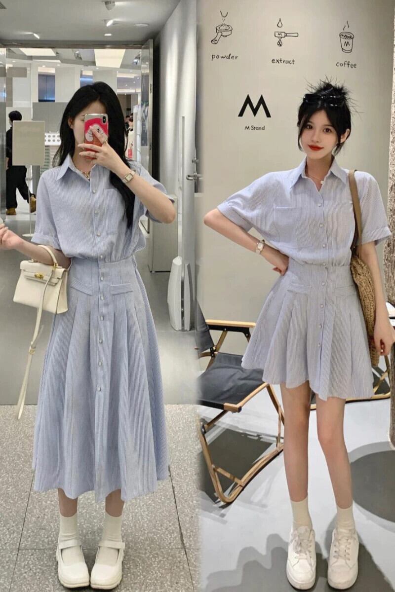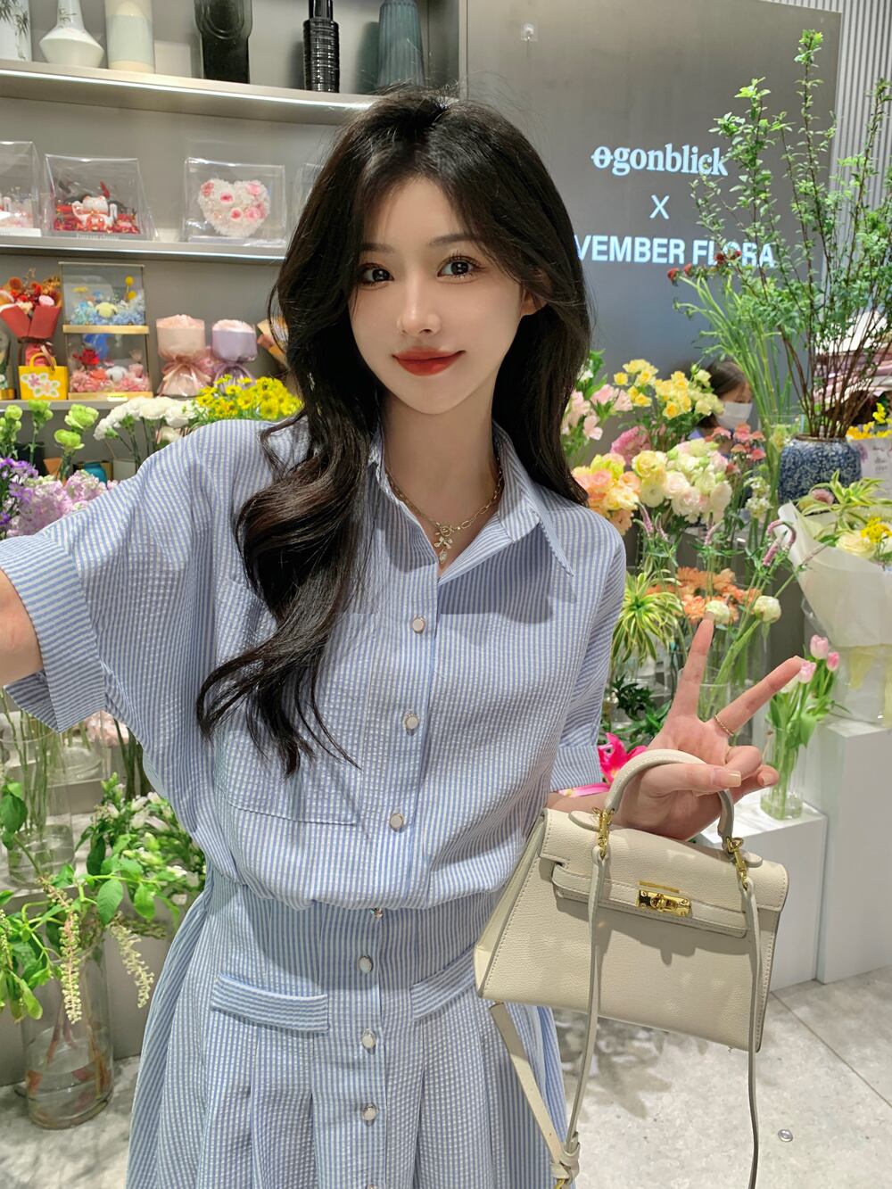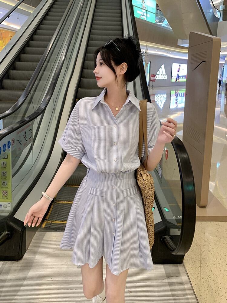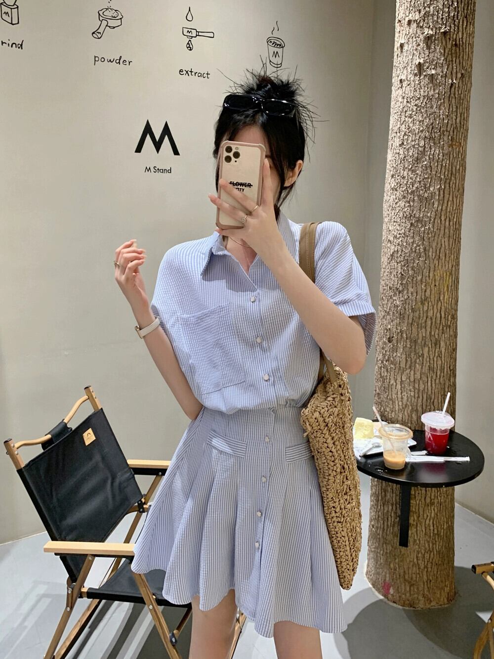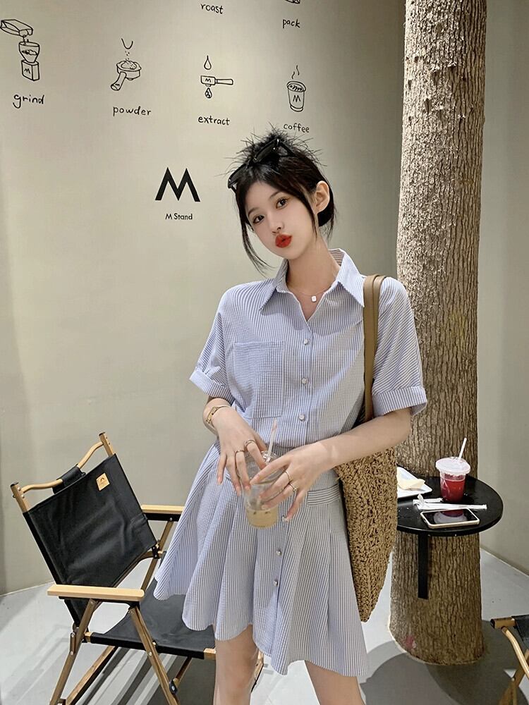 プラスサイズの婦人服 2023 脂肪姉妹夏の新ストライプシャツスカートスリムカジュアルポロカラー半袖ドレス 大きめサイズ サマー 夏物 8884122377730871