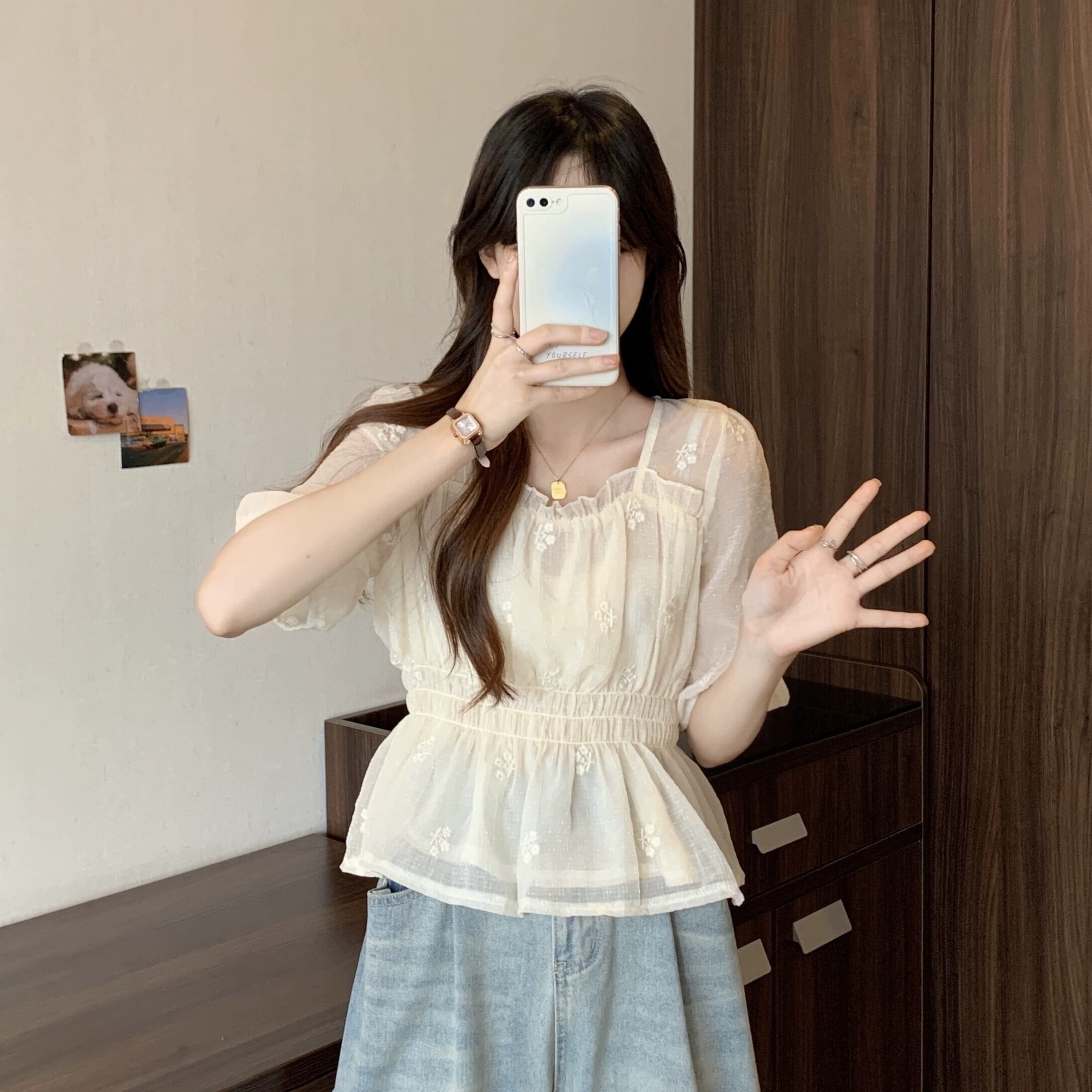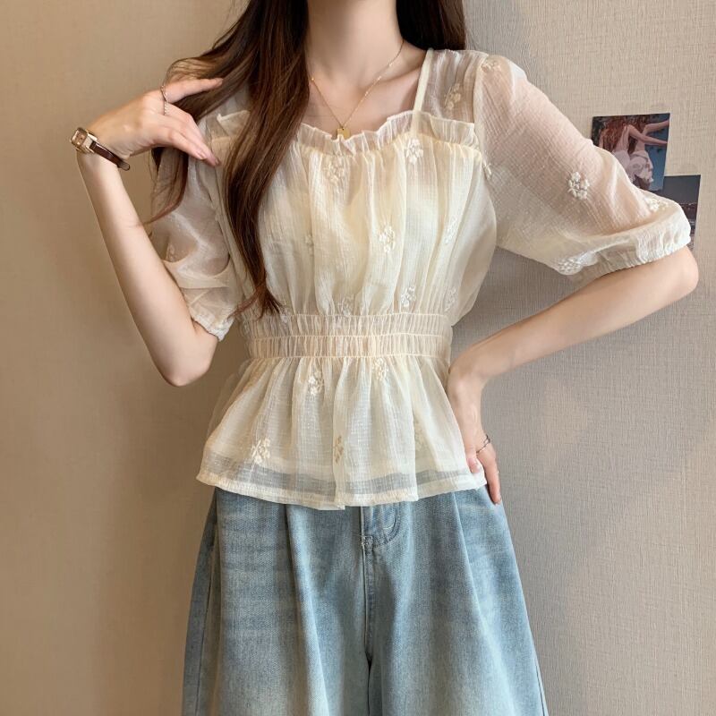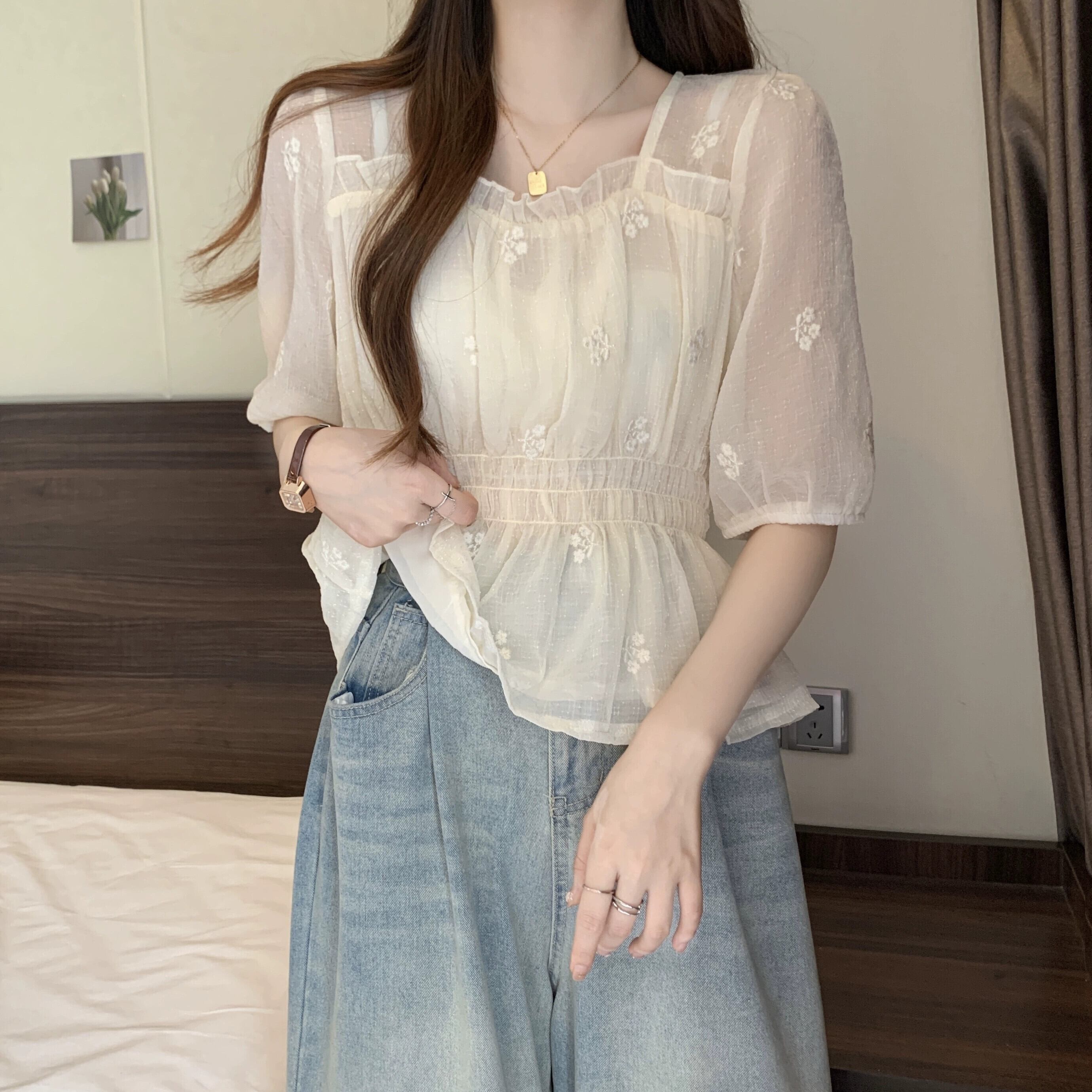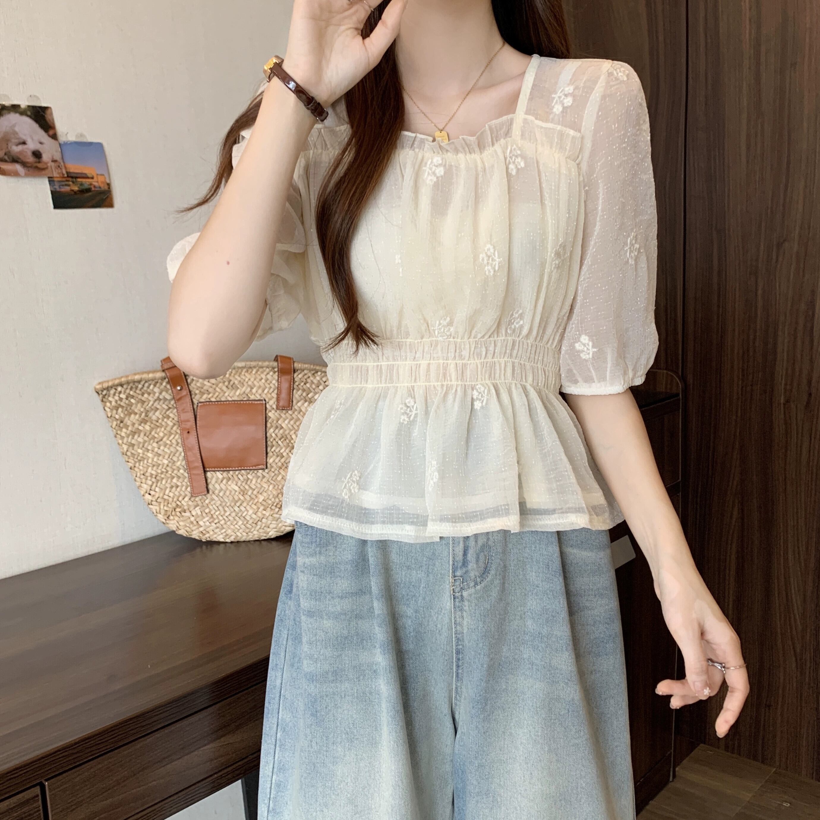 プラスサイズの婦人服 2023 トレンディな夏の新しいファットシスター刺繍木耳シフォンシャツ高度なニッチショートトップ レッド 大きめサイズ サマー 夏物 8884180016100370