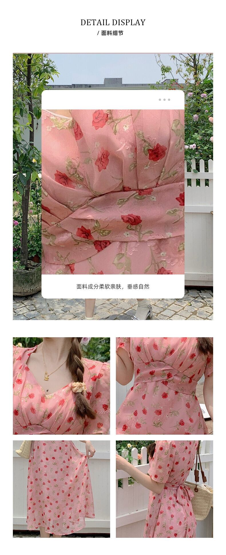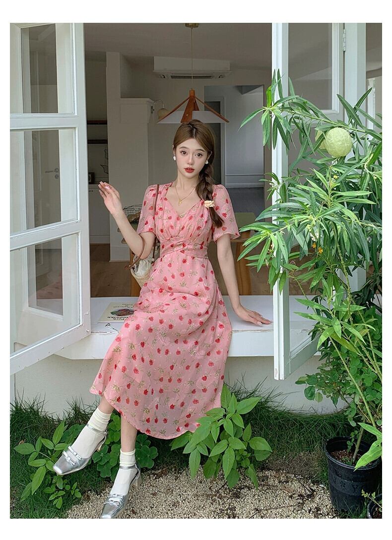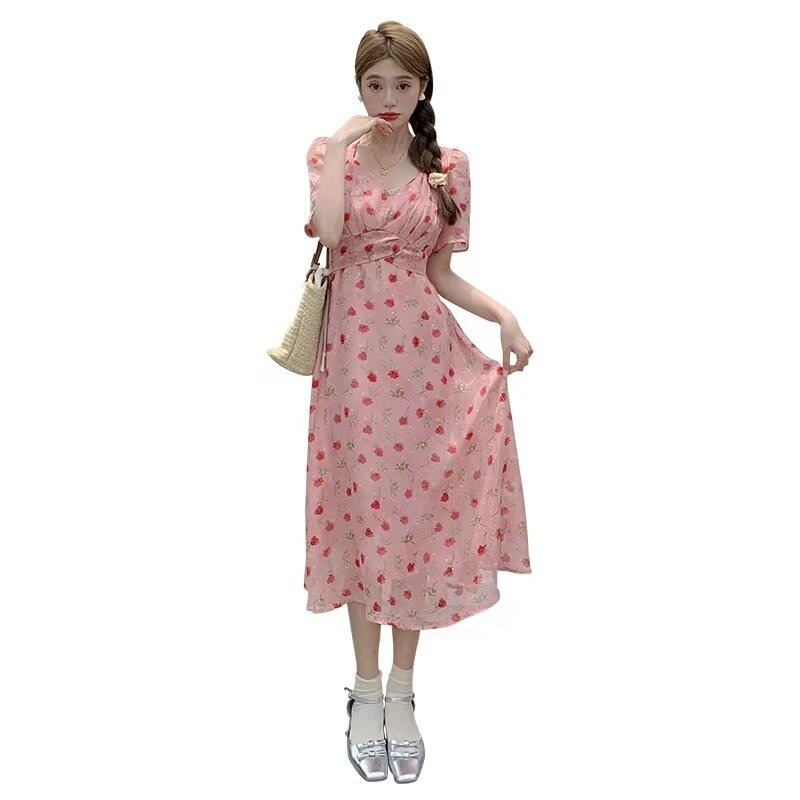 プラスサイズの婦人服 2023 流行の夏の新しいファットシスター花柄ハイウエスト薄型ドレスファッション V ネックミッドレングスワイドスカート ハイウェスト 大きめサイズ サマー 夏物 Vネック 8884144366020092