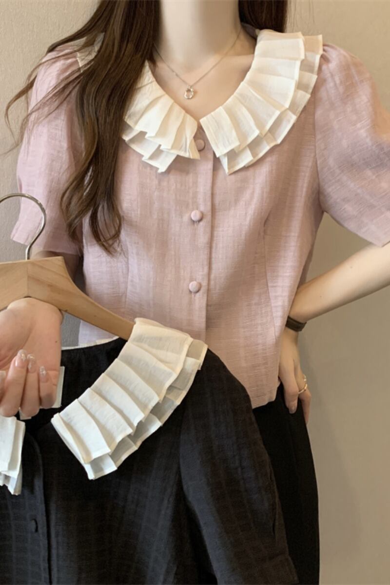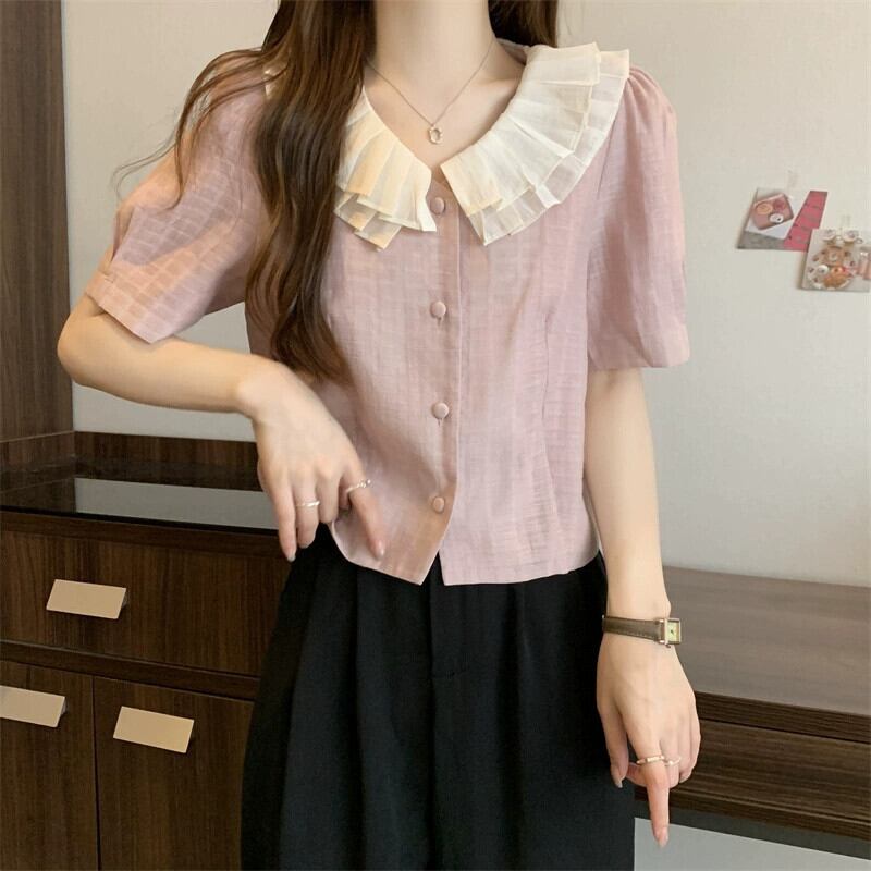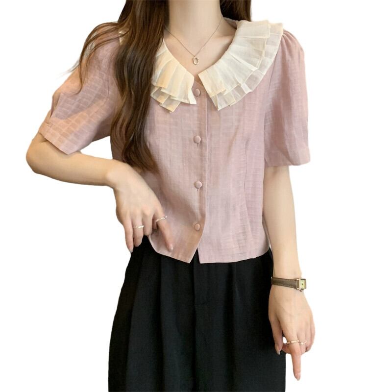 プラスサイズの婦人服 2023 夏服ファットシスターズ新しいプリーツラペルジャカード半袖デザイン痩身シャツトップ 大きめサイズ サマー 夏物 8884119867599123