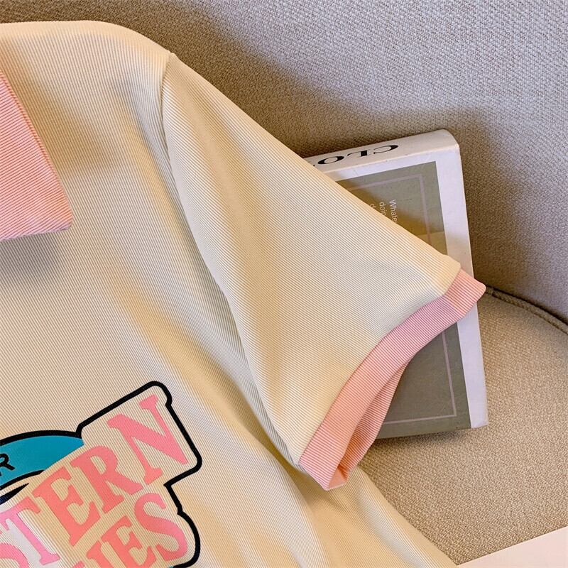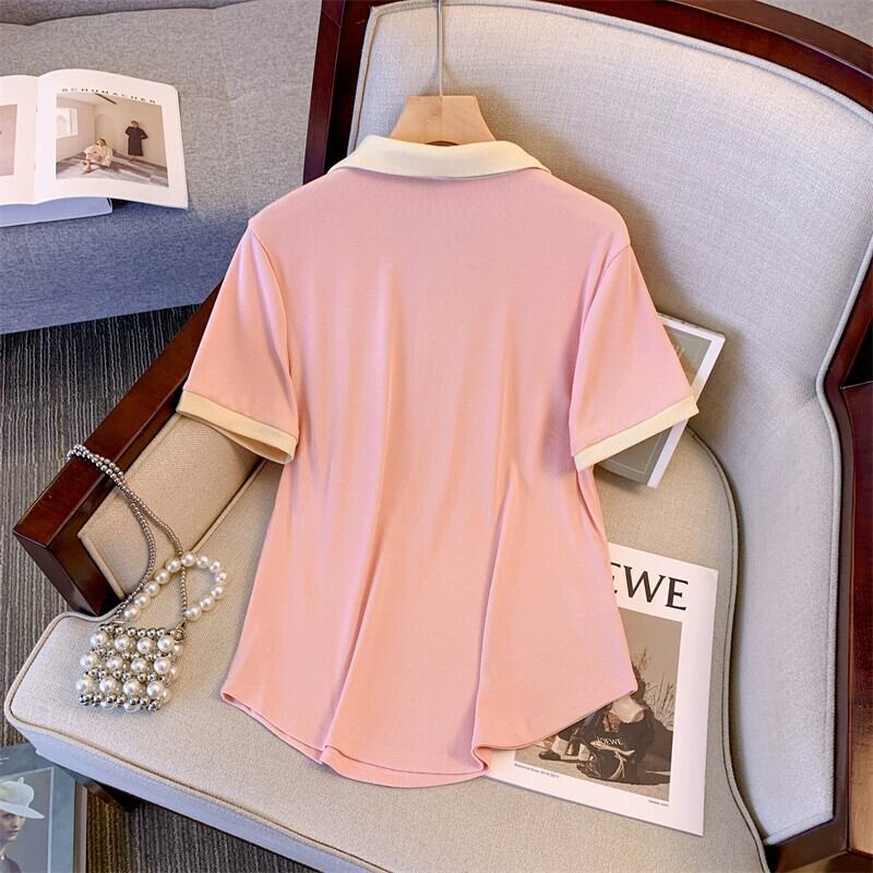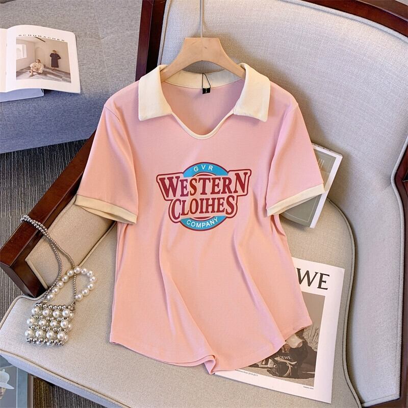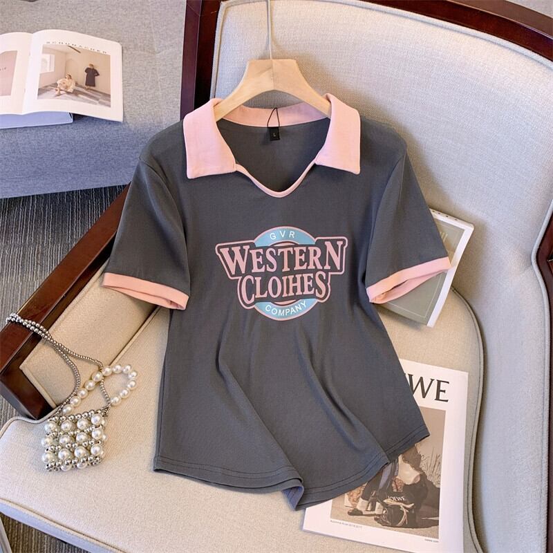 プラスサイズの婦人服 2023 夏服太った妹の年齢を減らすポロカラーコントラストカラートップスシックな西洋風プリント半袖 T シャツ 大きめサイズ サマー 夏物 Tシャツ 8884177380522122