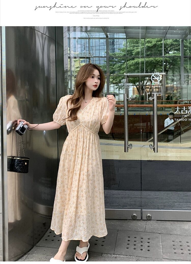 プラスサイズの婦人服 2023 脂肪姉妹夏新フレンチスタイルハイウエスト薄い気質ロングスカート V ネック花柄ドレス ハイウェスト 大きめサイズ サマー 夏物 Vネック 8884151440430192
