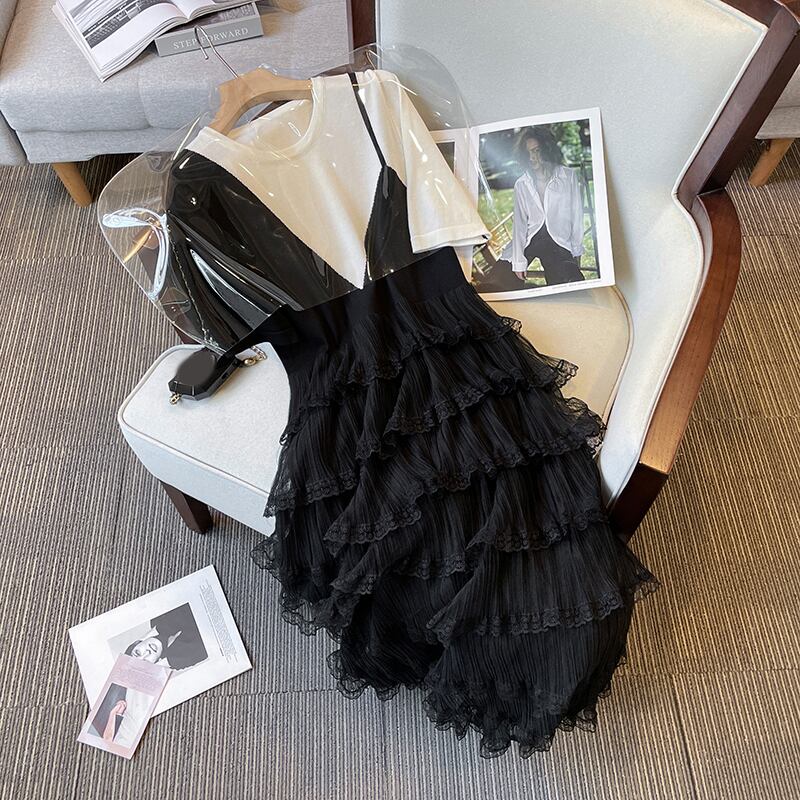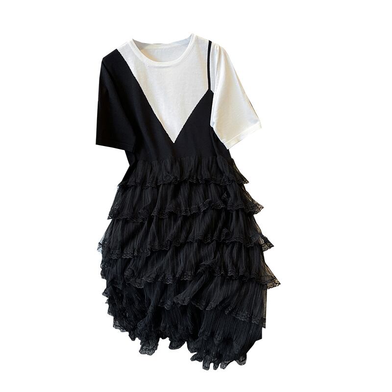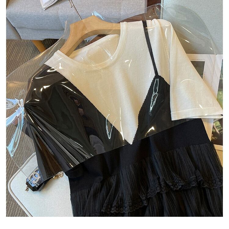 プラスサイズの婦人服 2023 脂肪姉妹夏の新ファッションスカートレーススプライシング緩いと薄いニットドレス 大きめサイズ サマー 夏物 8884166746826900
