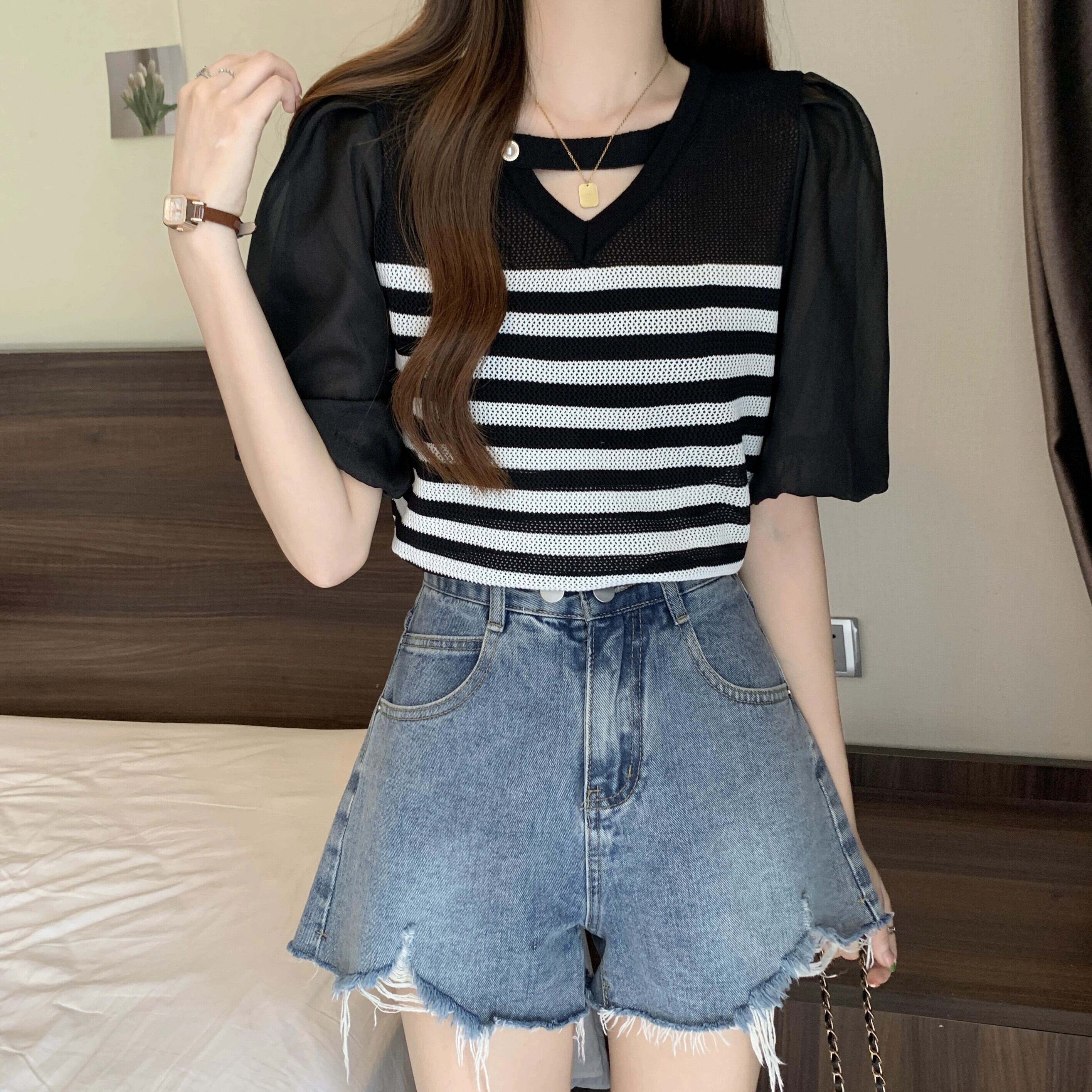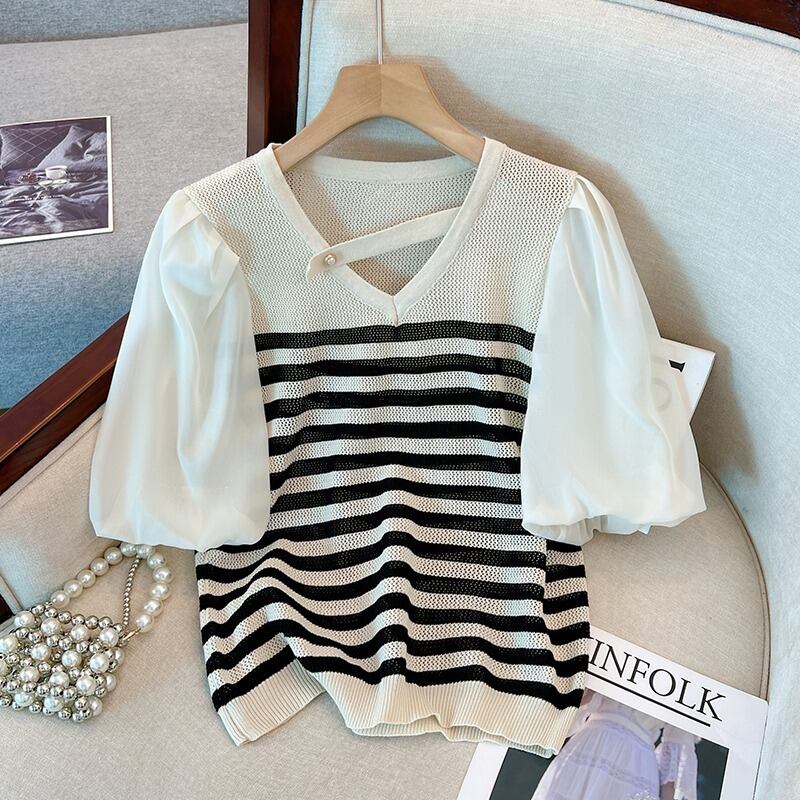 プラスサイズの婦人服 2023 夏服ファットシスターフレンチデザインパフスリーブ Tシャツストライプアイスシルクベリーカバートップ 大きめサイズ サマー 夏物 8884120791610547