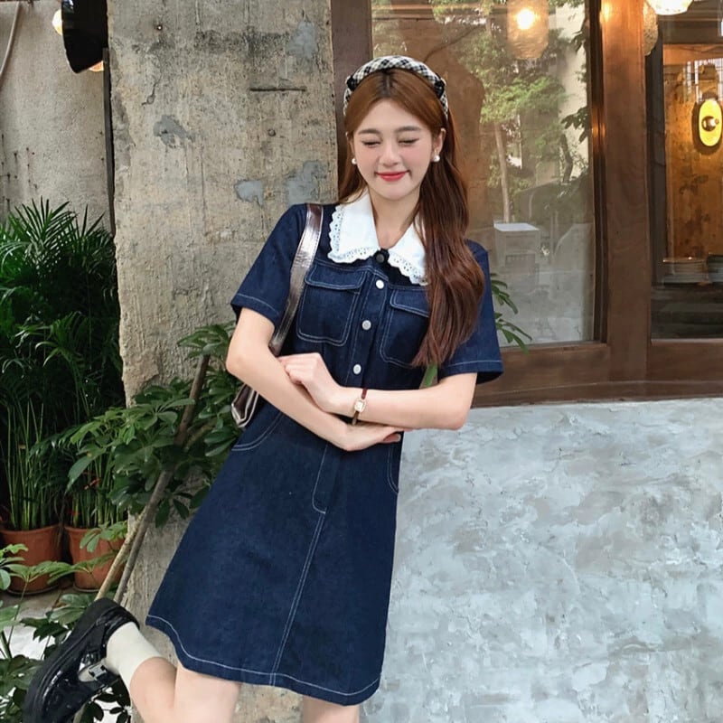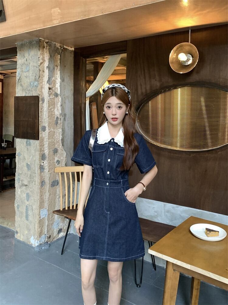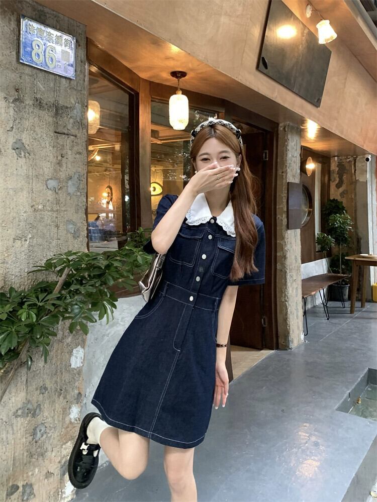 プラスサイズの婦人服 2023 脂肪姉妹夏の新ファッションスリムデニムスカートレース人形襟半袖ドレス 大きめサイズ サマー 夏物 8884145562252508