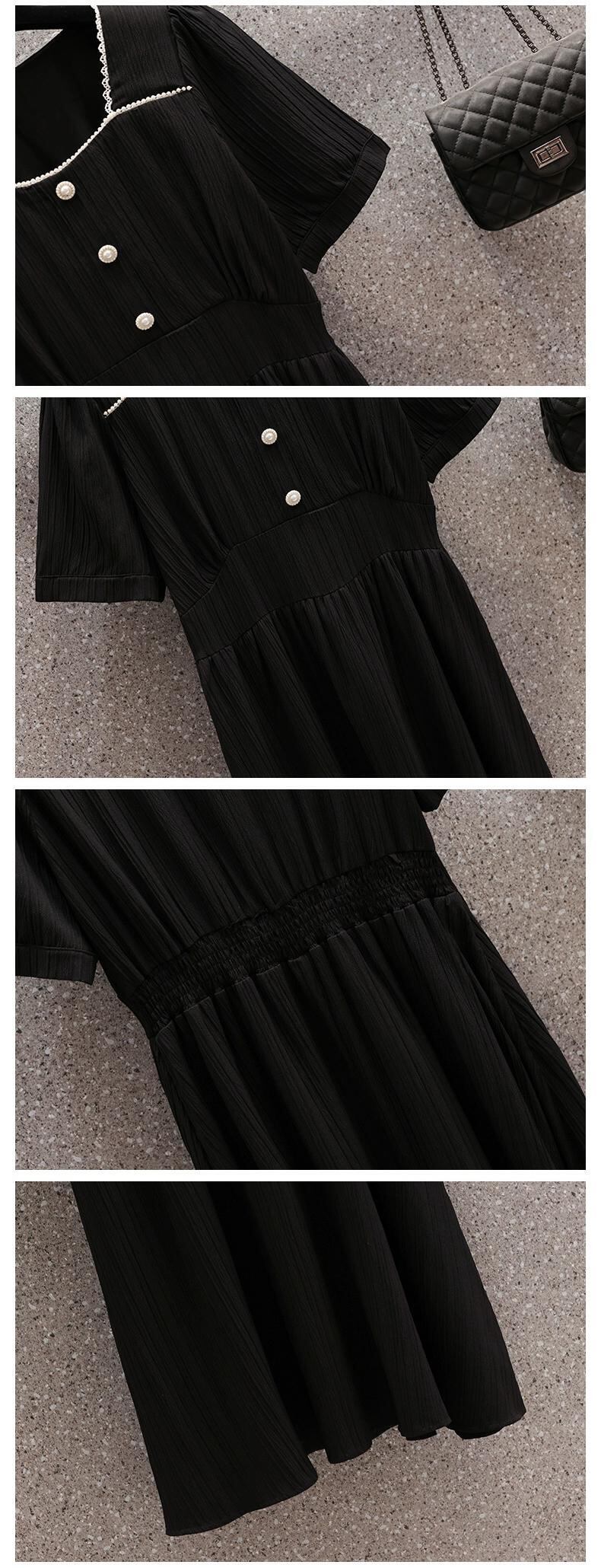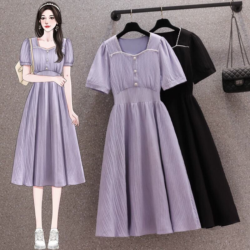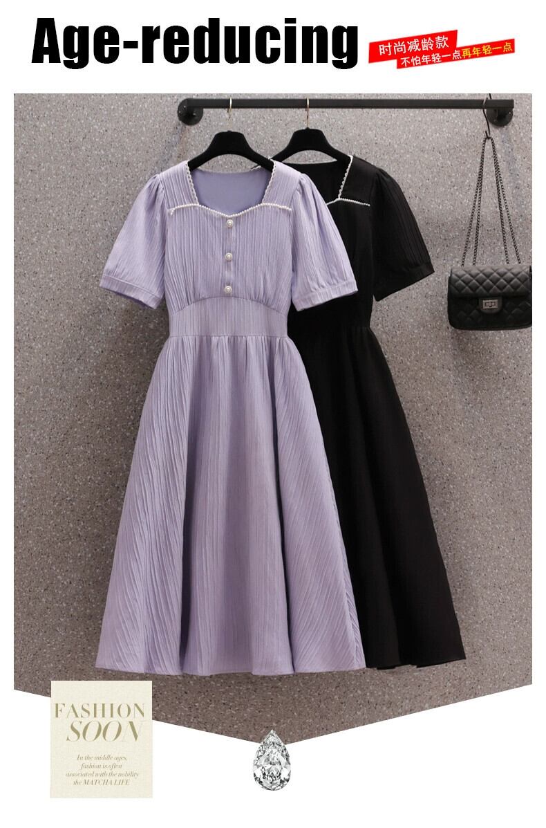 プラスサイズの婦人服 2023 夏のドレスファットシスターフレンチスタイルスクエアカラー気質 A ラインスカート無地薄型デザインセンスドレス 大きめサイズ サマー 夏物 Aライン ソリッドカラー スクウェア 8884181342785505
