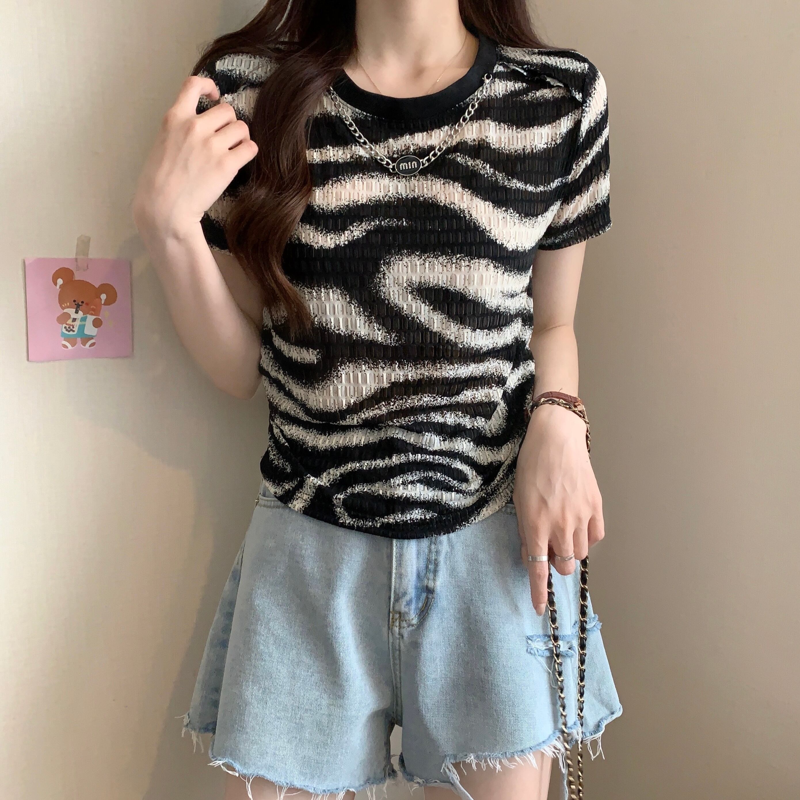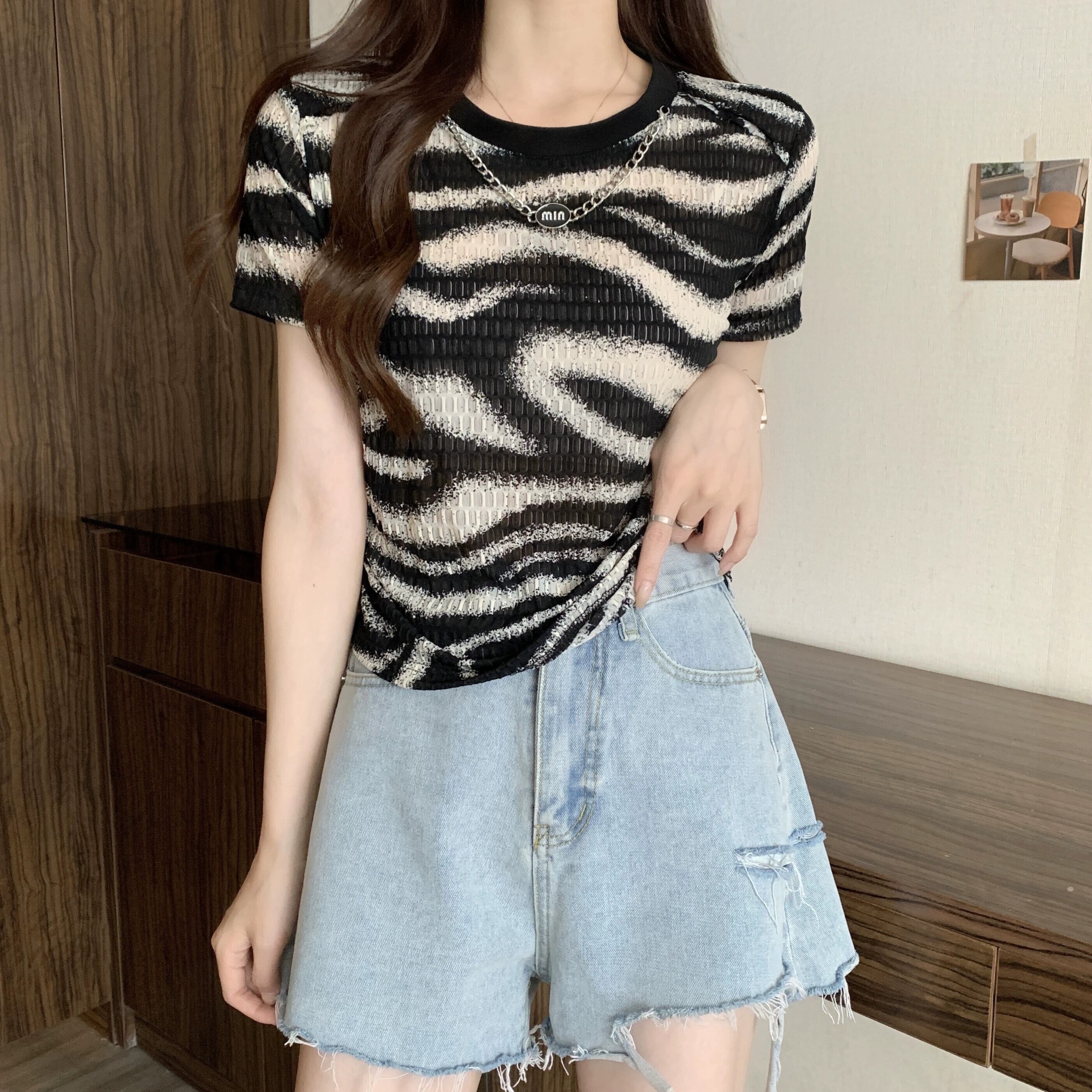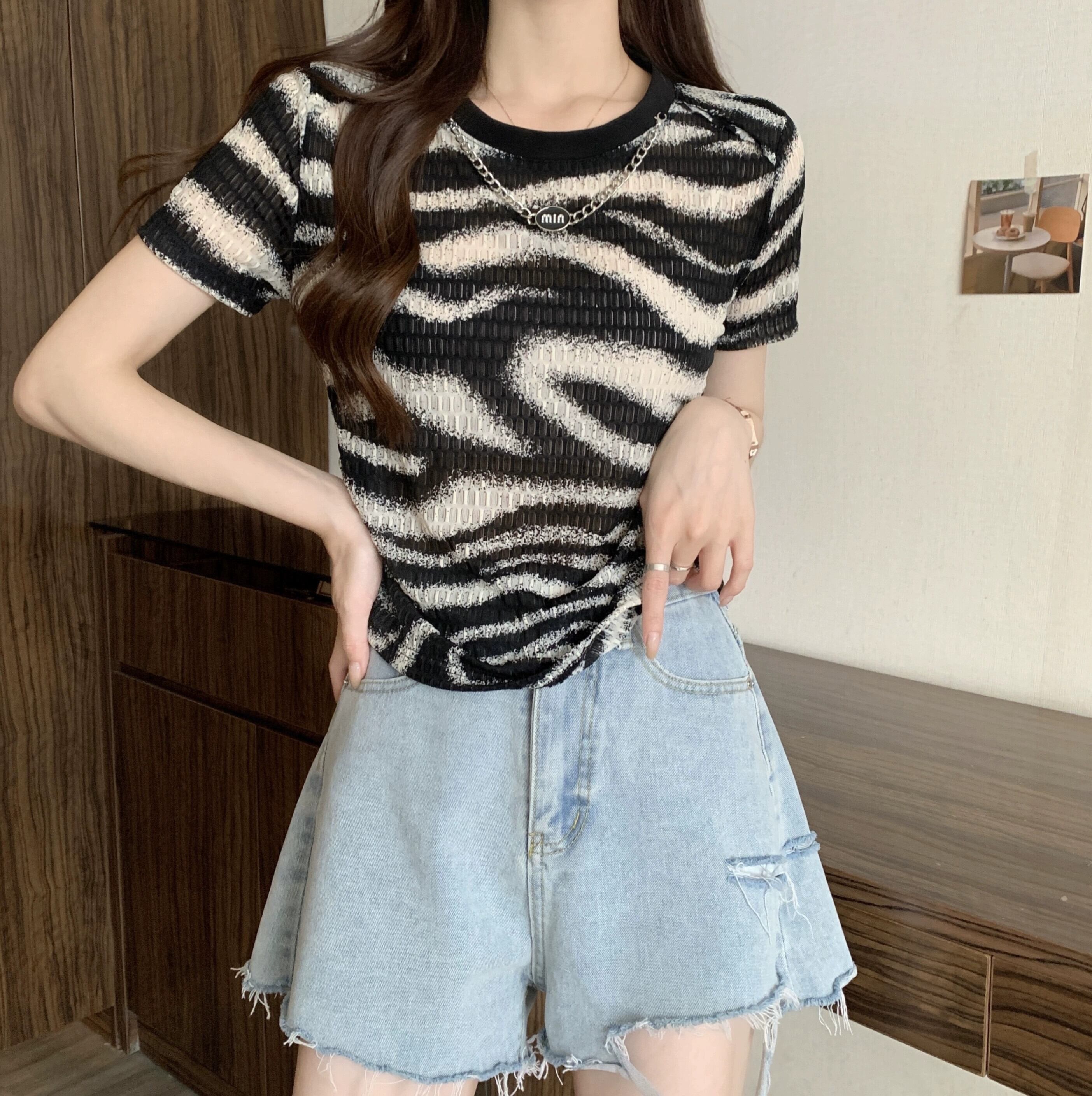 プラスサイズの婦人服 2023 ファットシスター夏の新しいデザインセンス tシャツヒョウ柄の折り目薄い不規則な半袖トップ 大きめサイズ サマー 夏物 8884188608929240