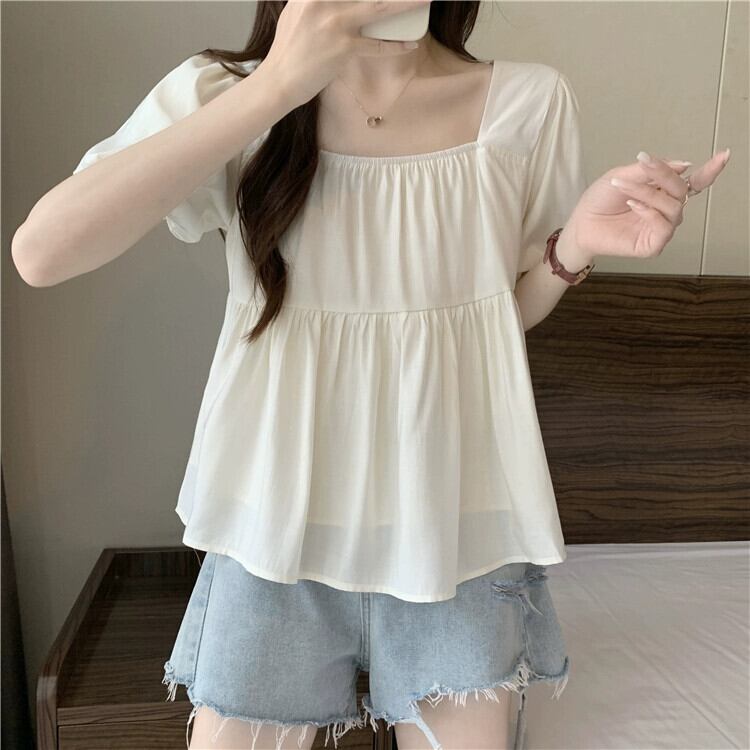 プラスサイズの婦人服 2023 ファットシスター夏新スクエアカラーパフスリーブシフォンシャツ半袖スリム西洋スタイル年齢軽減トップ 大きめサイズ サマー 夏物 スクウェア 888418541563371
