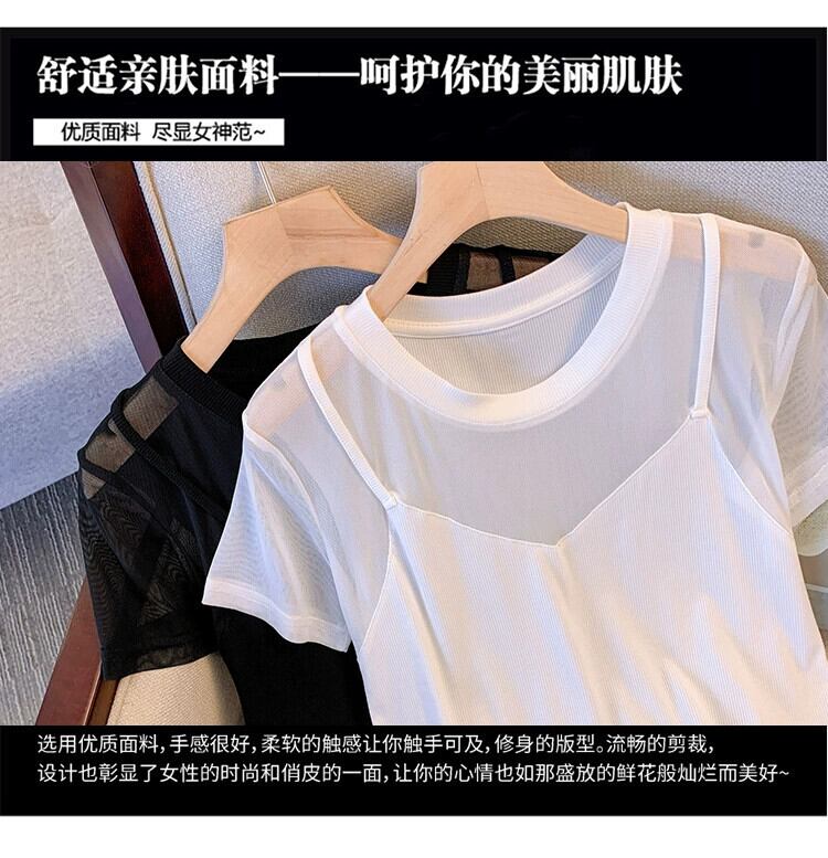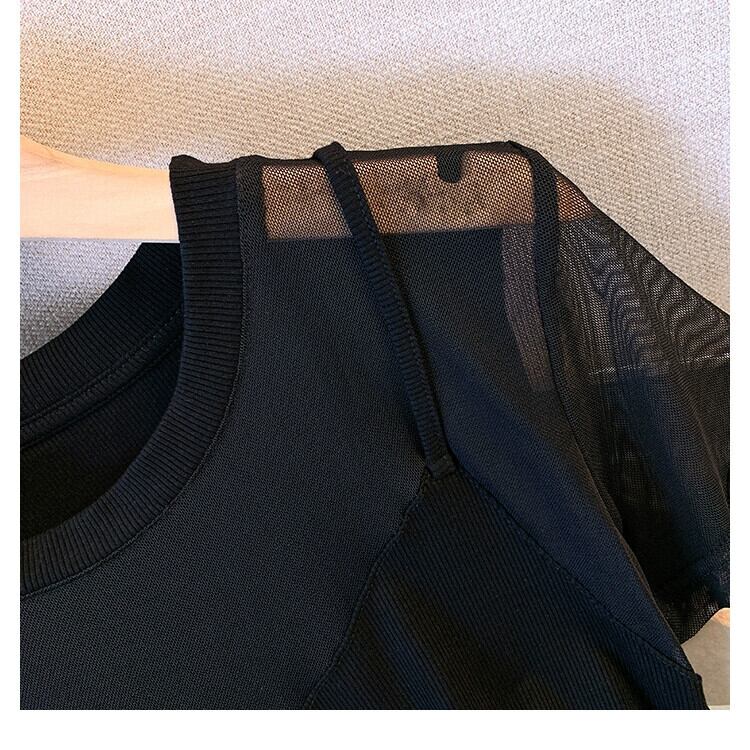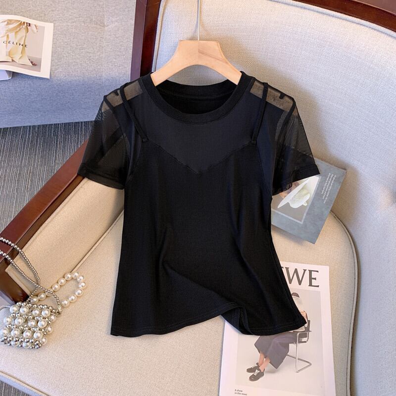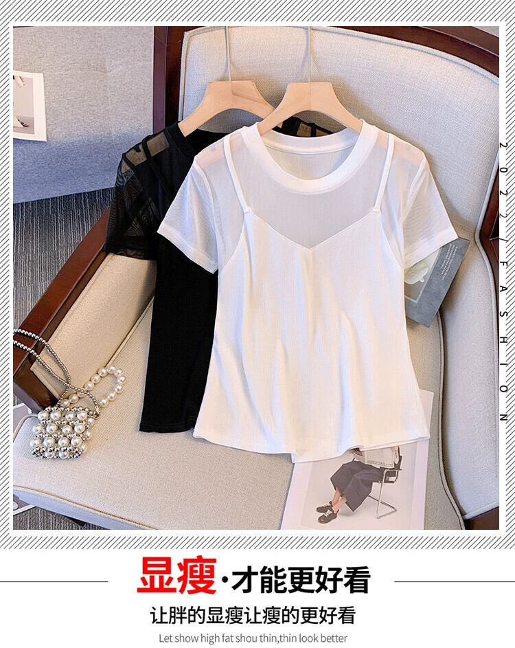 プラスサイズの婦人服 2023 ファットシスター夏の新しいデザインセンスメッシュフェイクツーピースサスペンダーに見える薄い半袖 T シャツトップ 大きめサイズ サマー 夏物 Tシャツ 8884138816744208