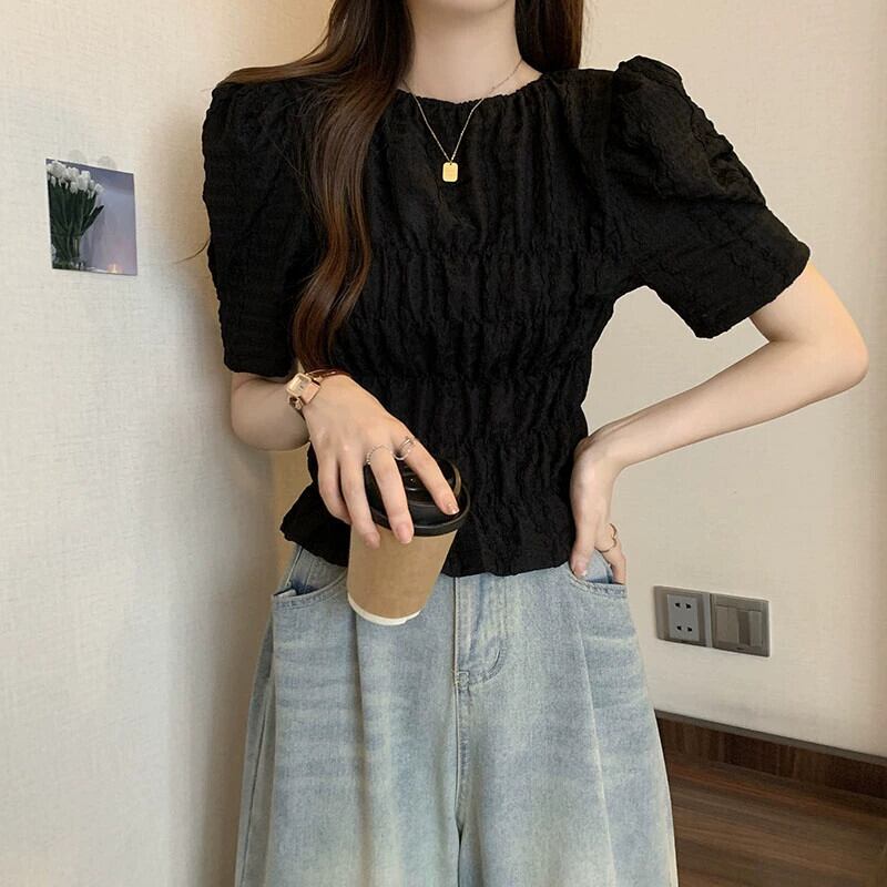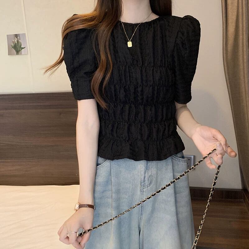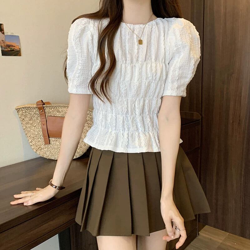 プラスサイズの婦人服 2023 ファットシスター夏の新しいフレンチスタイルの薄いショートトッププリーツパフスリーブラウンドネックシャツ 大きめサイズ サマー 夏物 Oネック 8884175879379421
