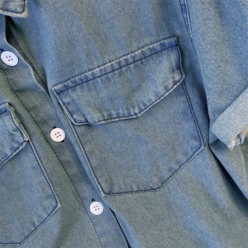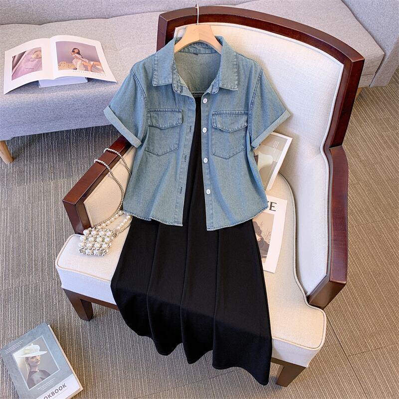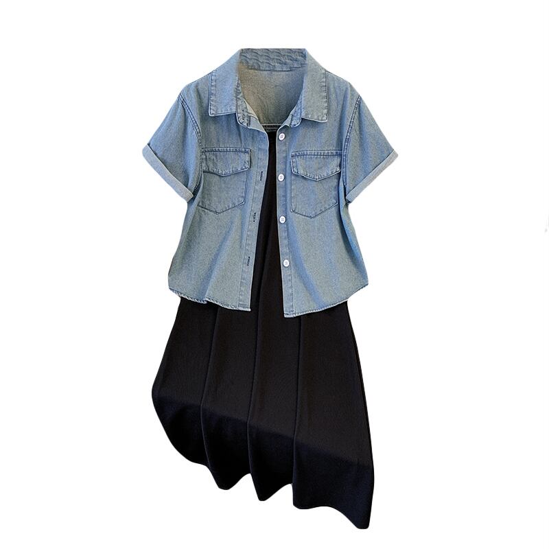 プラスサイズの婦人服 2023 夏服ファットシスターシックなデザインのデニムシャツ痩身無地サスペンダースカート 2 点セット 大きめサイズ サマー 夏物 ソリッドカラー 8884125187574656