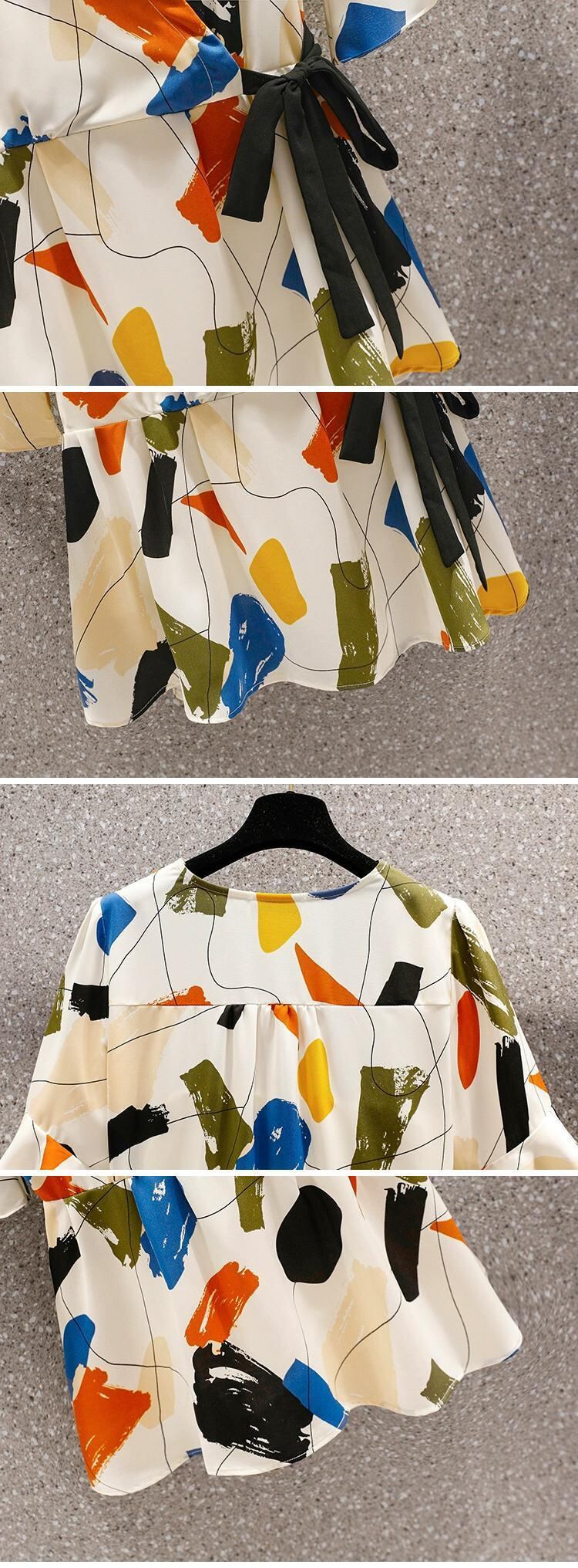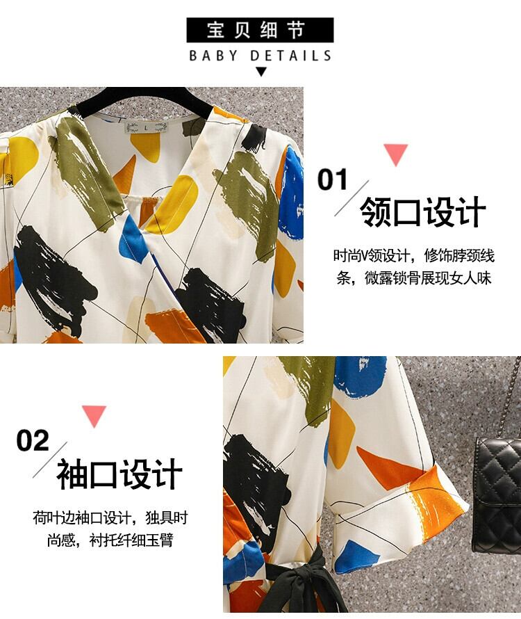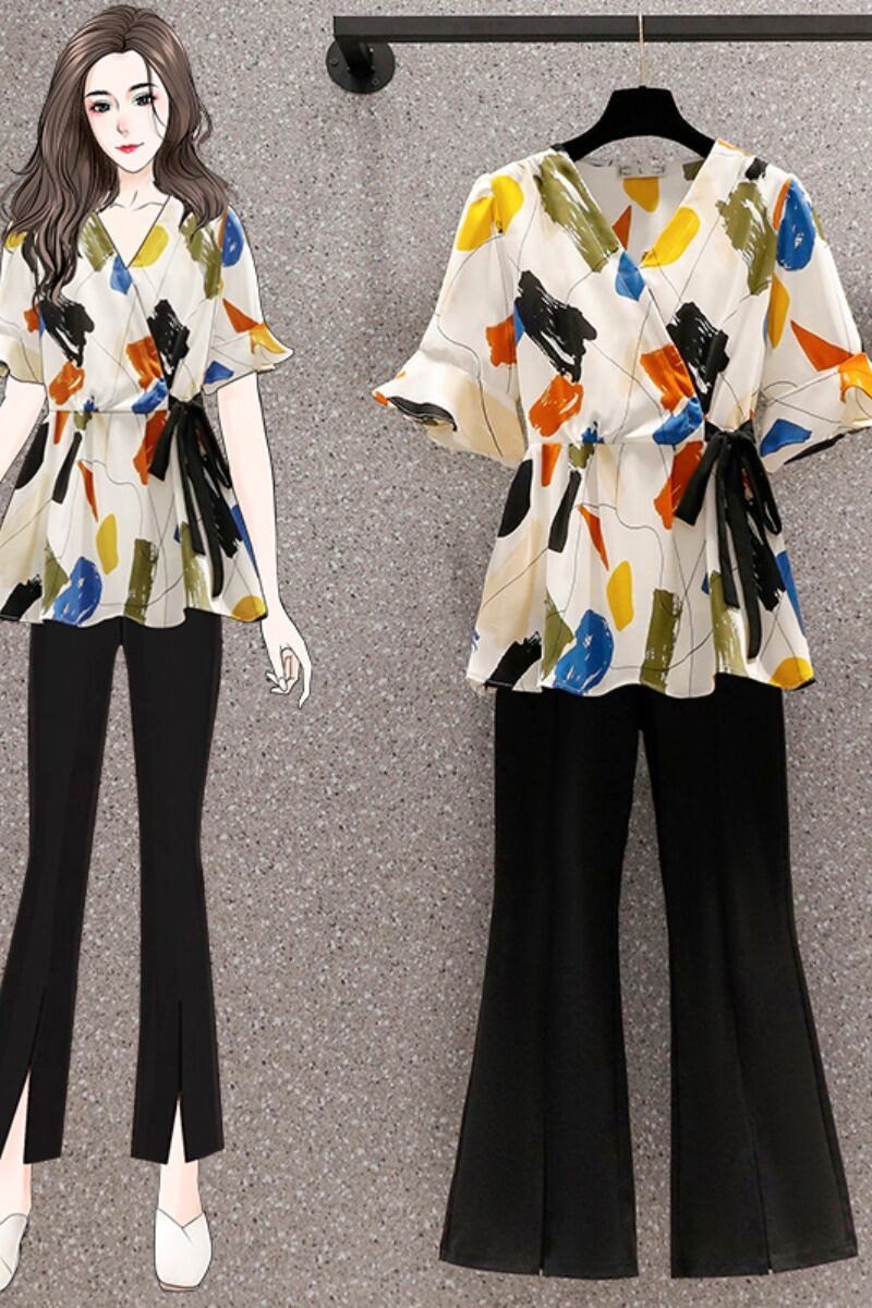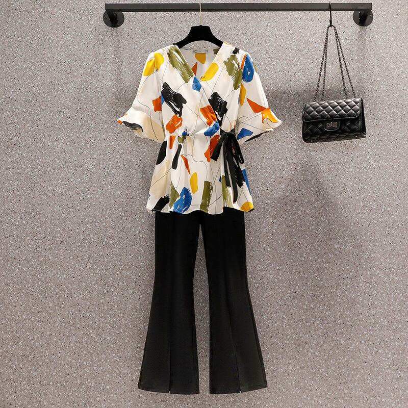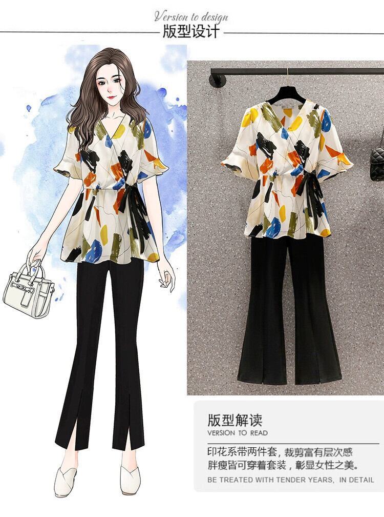 プラスサイズの婦人服 2023 脂肪姉妹夏の新しいスタイルのスーツプリントシャツスリットパンツに見える薄いツーピーススーツ 大きめサイズ サマー 夏物 8884129108311872