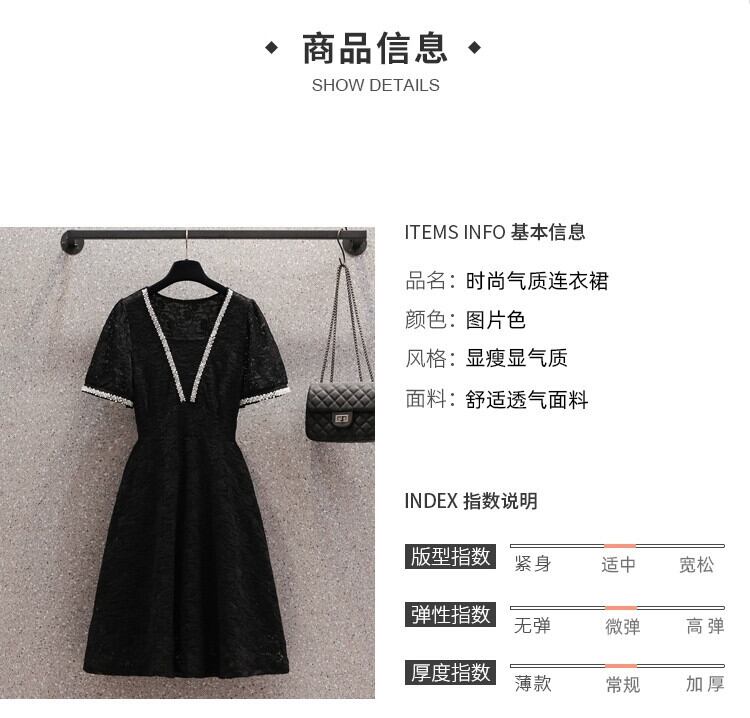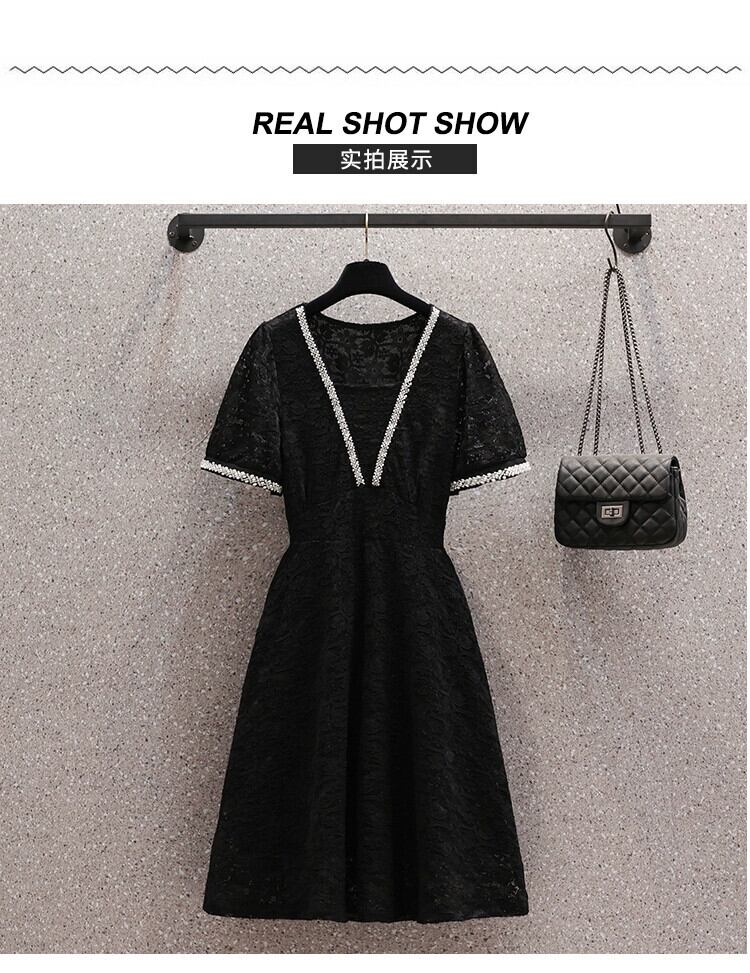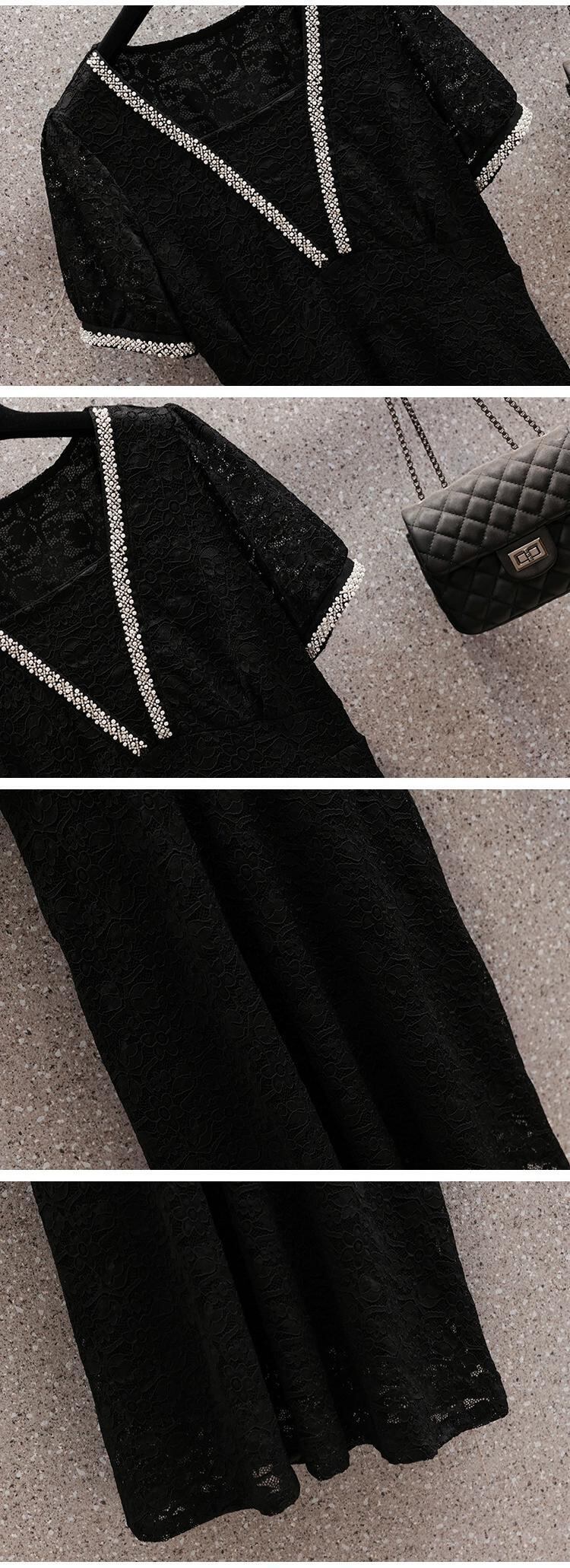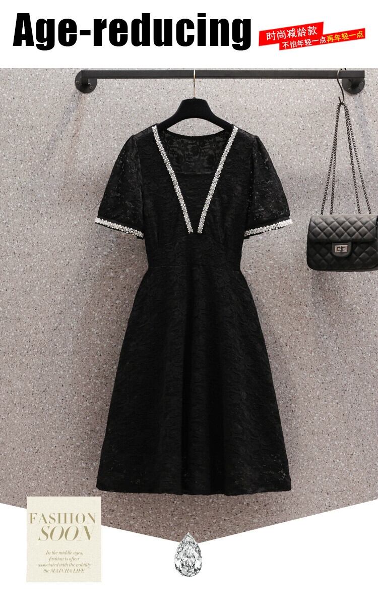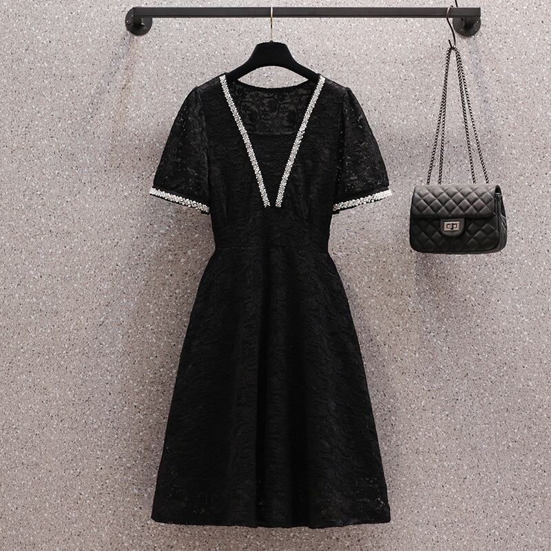 プラスサイズの婦人服 2023 夏服太った妹気質スクエアカラーレースビーズ A ラインスカートデザイン感の薄いドレス 大きめサイズ サマー 夏物 Aライン スクウェア 8884155473977601
