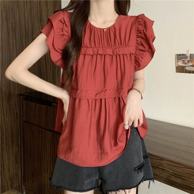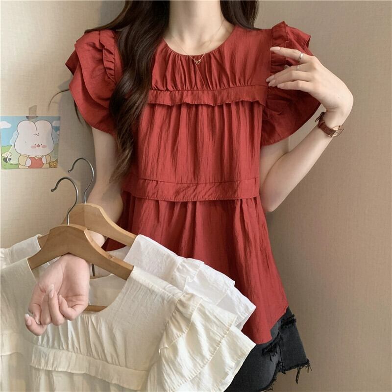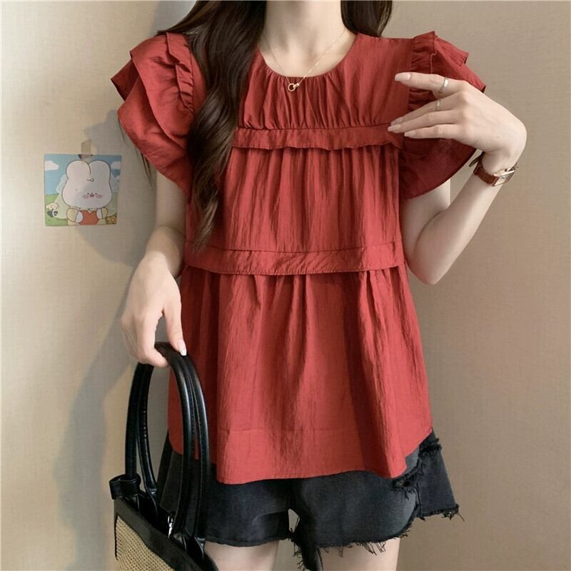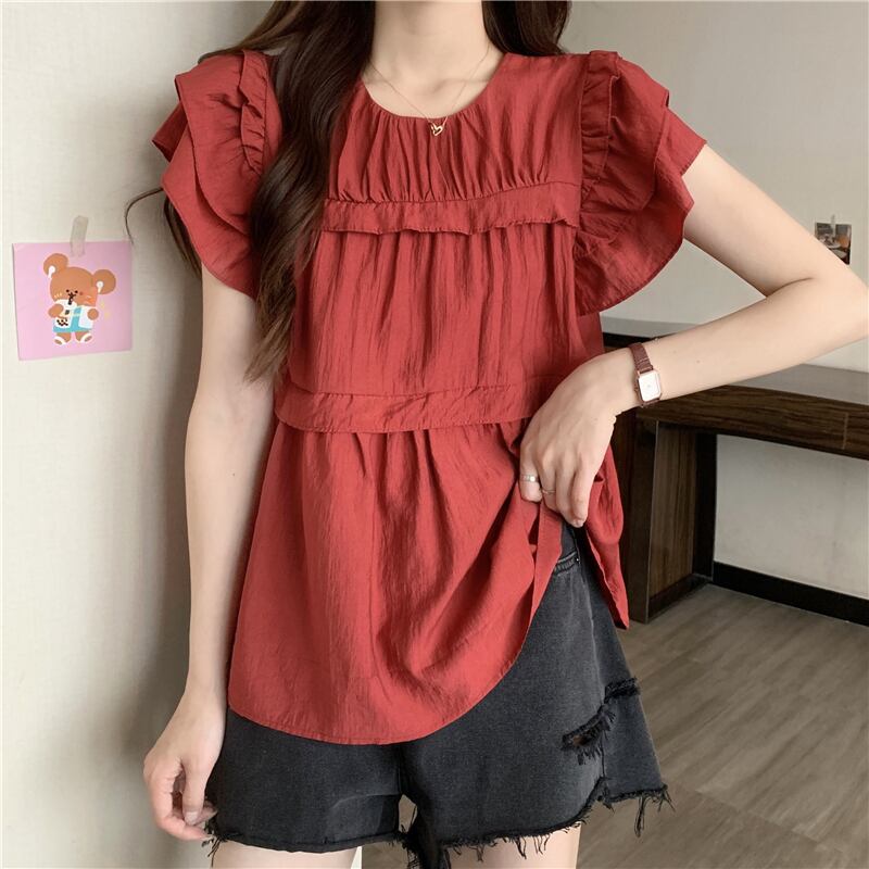 プラスサイズの婦人服 2023 夏服ファットシスターズ新しいスタイルのフライングスリーブ小さなシャツ幅広で年齢を軽減するプリーツオールマッチフリルトップス 大きめサイズ サマー 夏物 8884158860462055